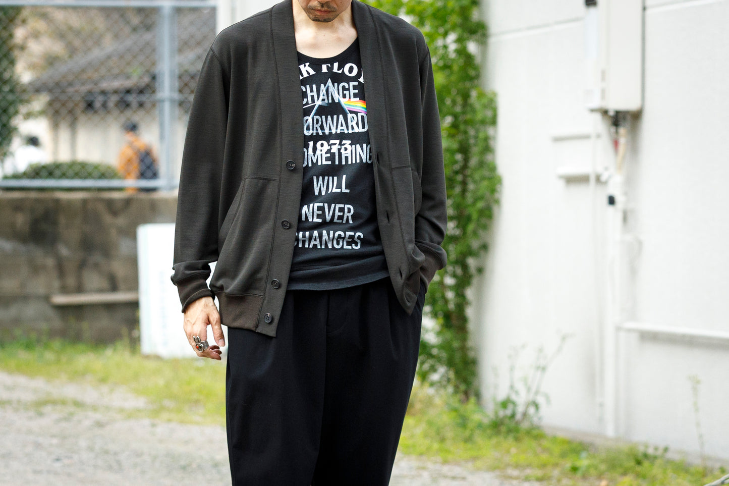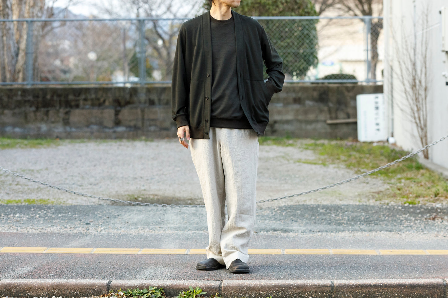 上質な素材を用い、シンプルなデザインに落とし込んだ山内さんのラインナップでは数少ないニット品番、、ノーミュルシングウール・ダブルフェイスニットカーディガン。