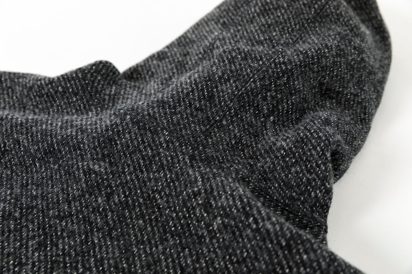 モザイクニットと表現されるほど奥行きのある印象で、和紙の表情と軽さ、上質なウールの滑らかさ、カシミアの保温性と、それぞれの糸の良い部分を感じる着用感となっております。