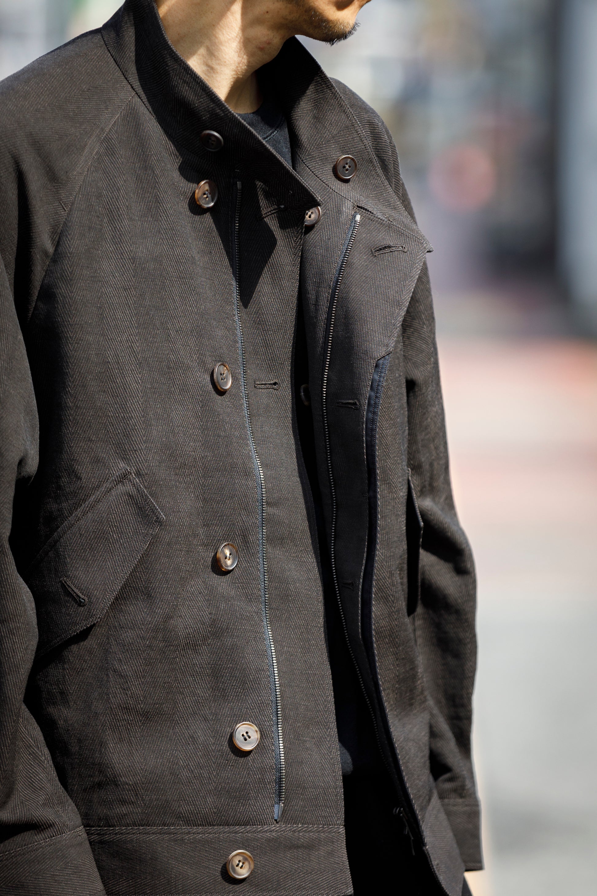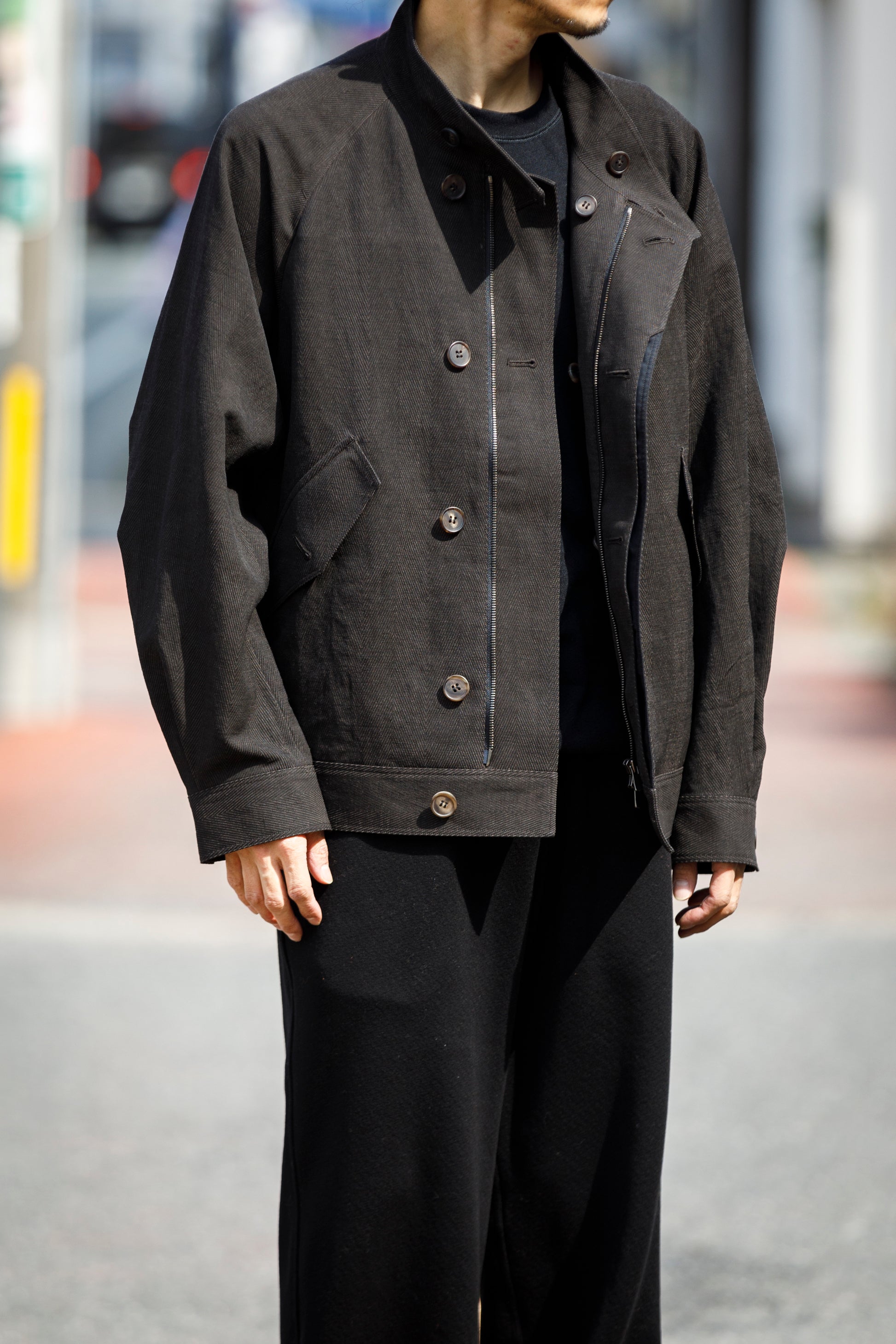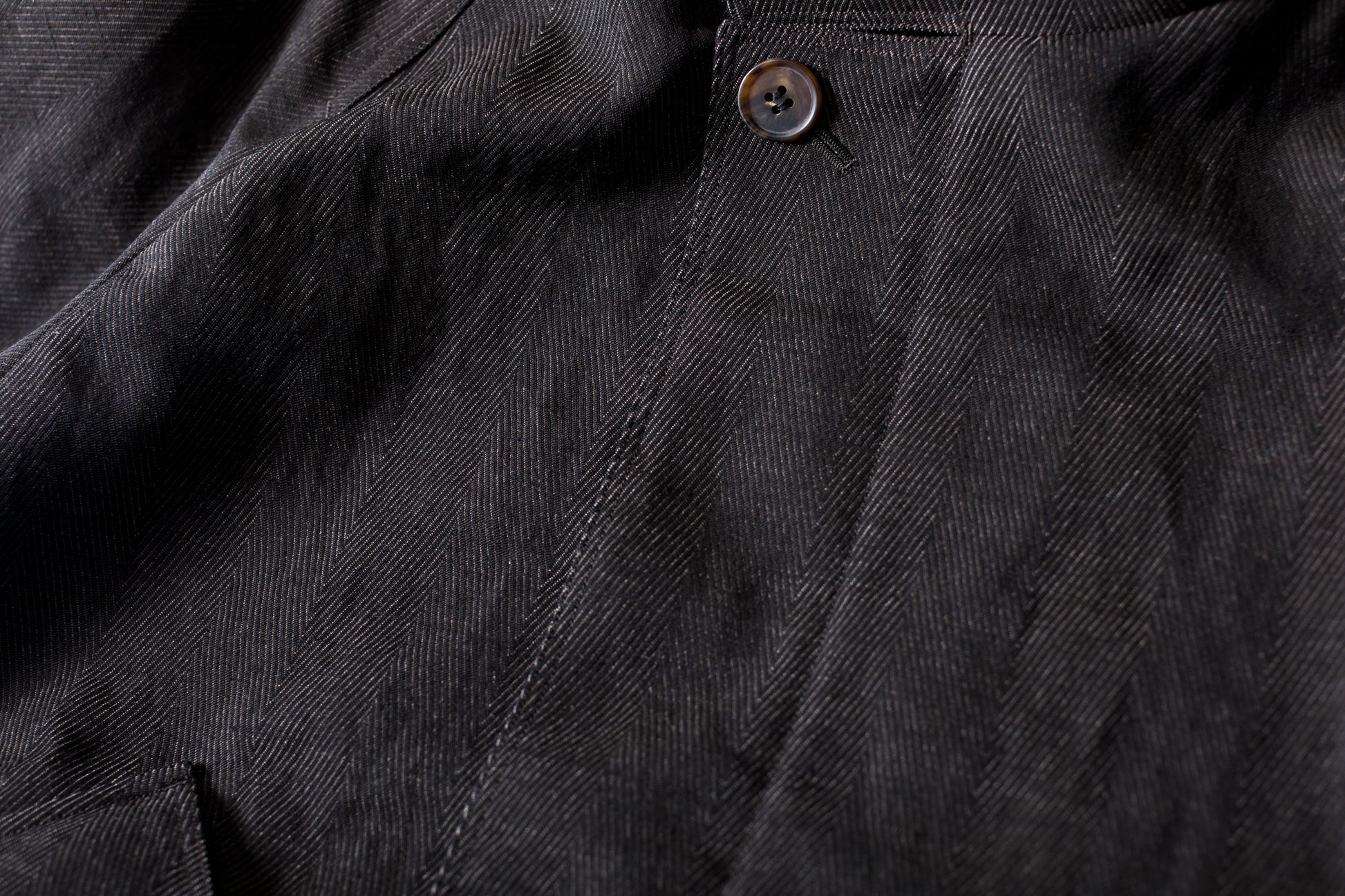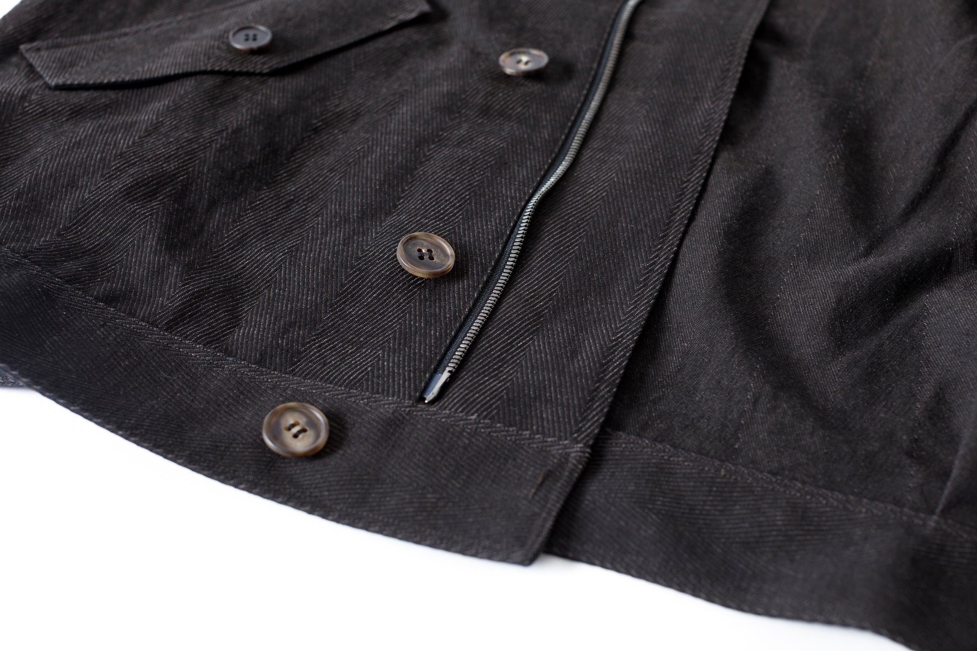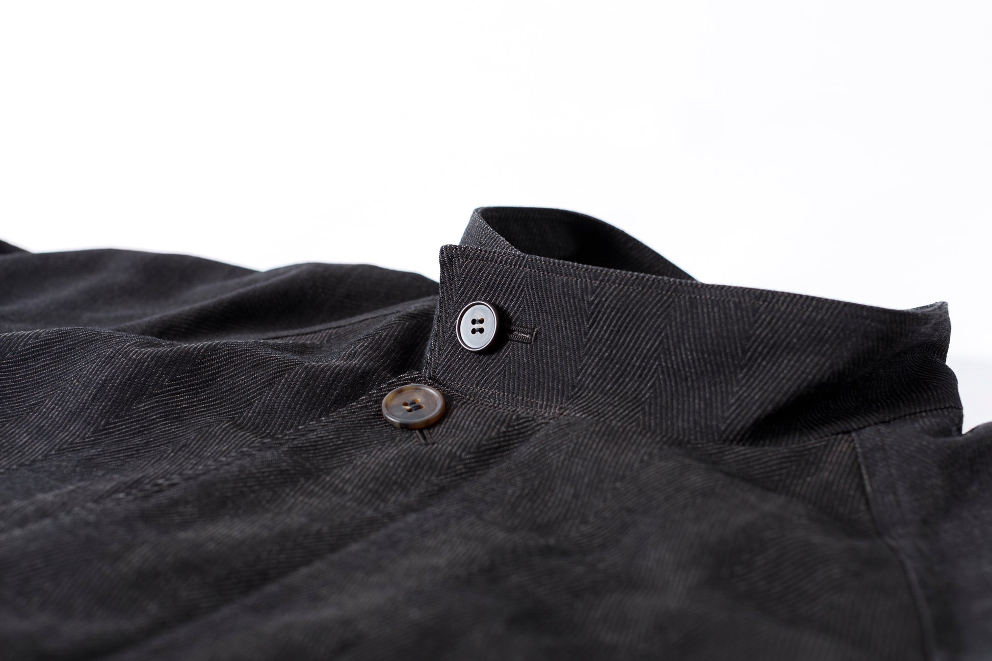 各所にタックを配置することで生まれる膨らみと、ばさっと羽織れるように身幅アームにボリューム感のある仕上がりを意識した1枚仕立てのジャケット、泥染ウールリネンヘリンボーン・セミダブルジップジャケット -doro。