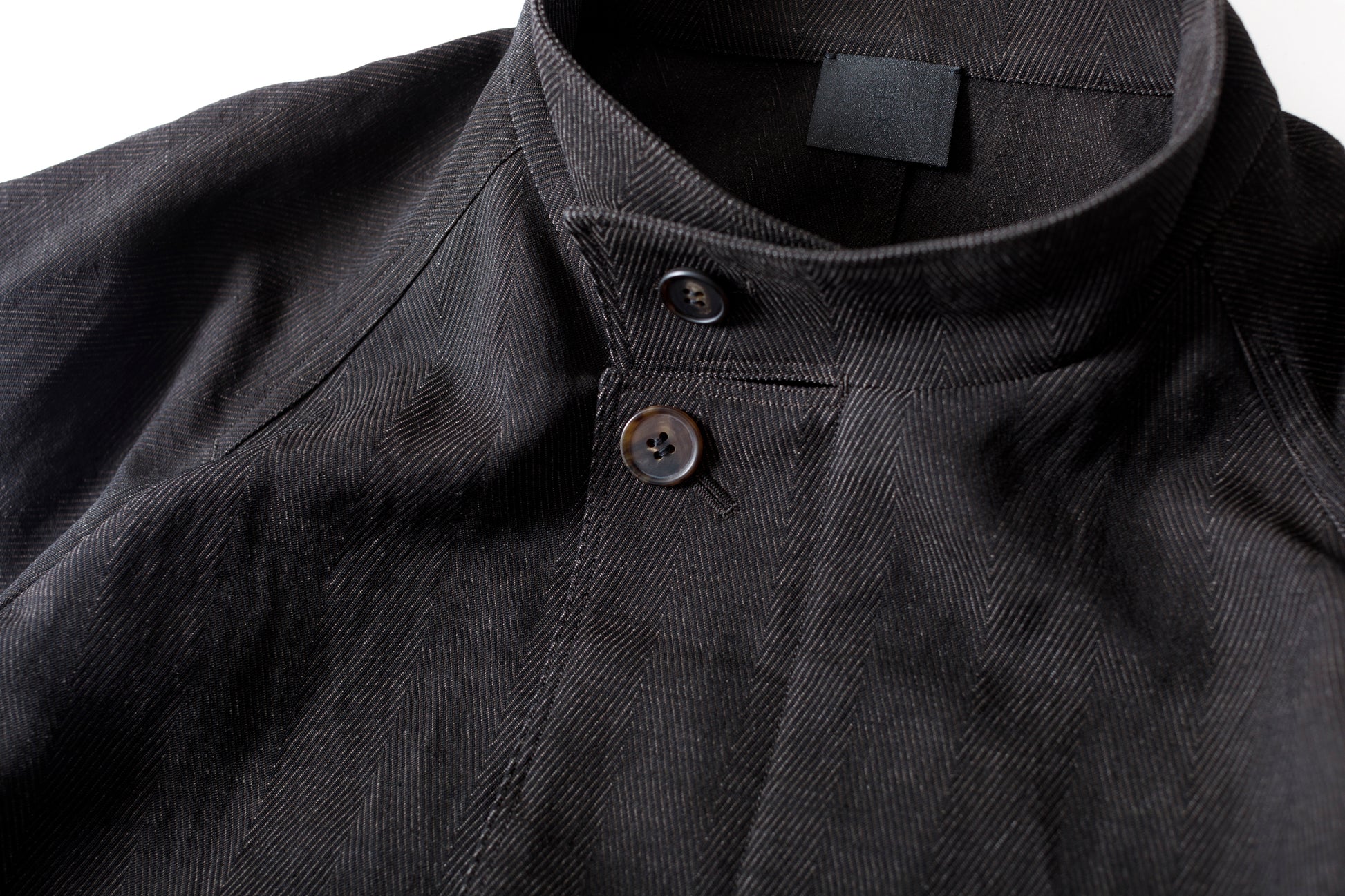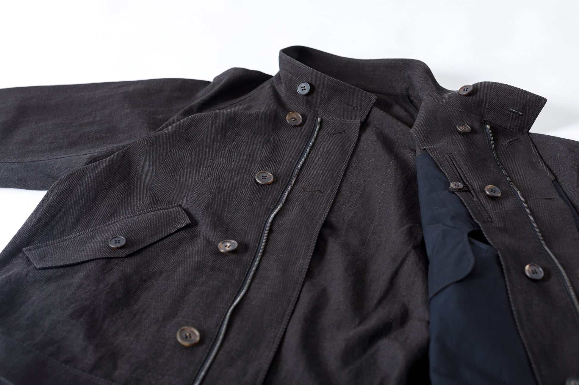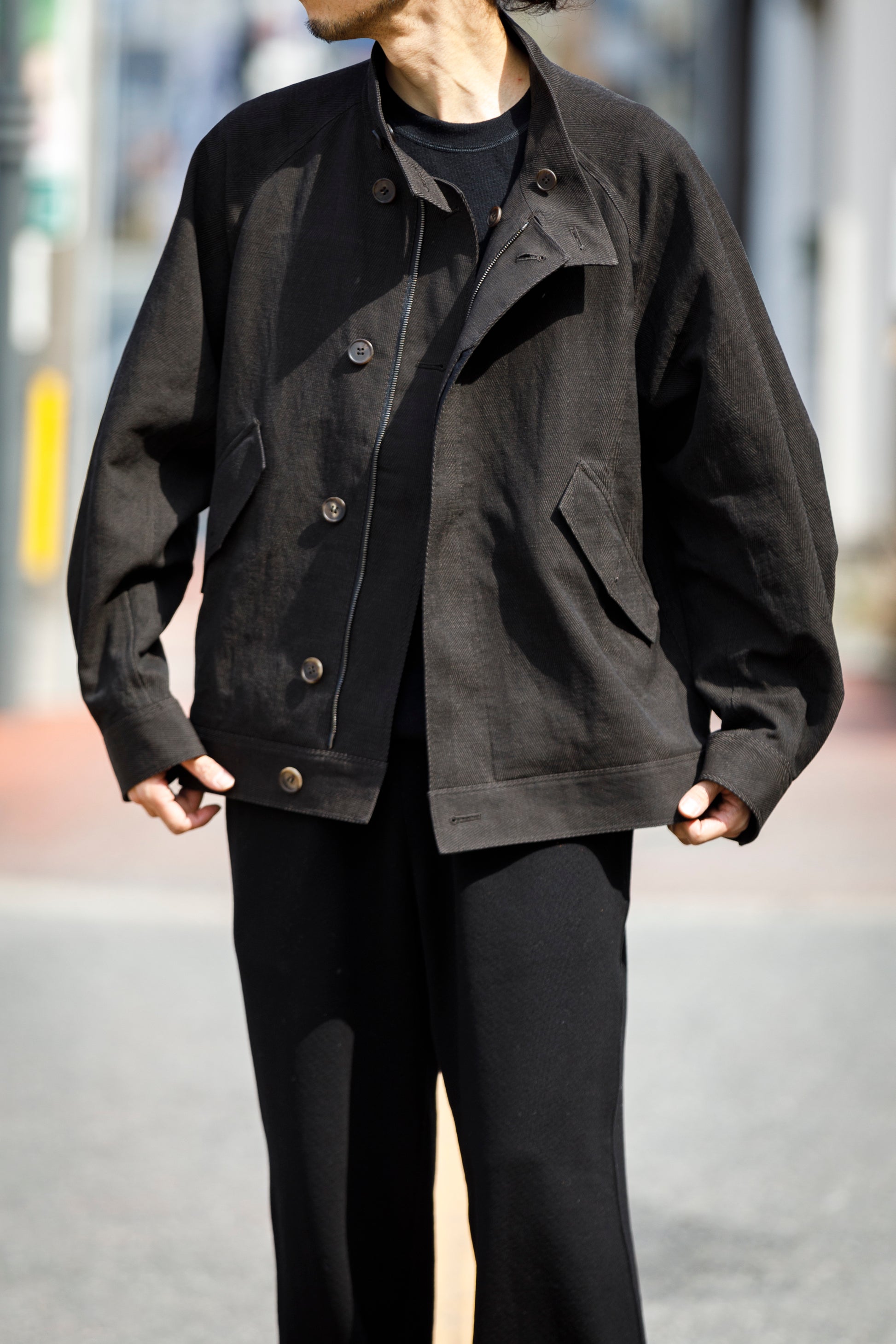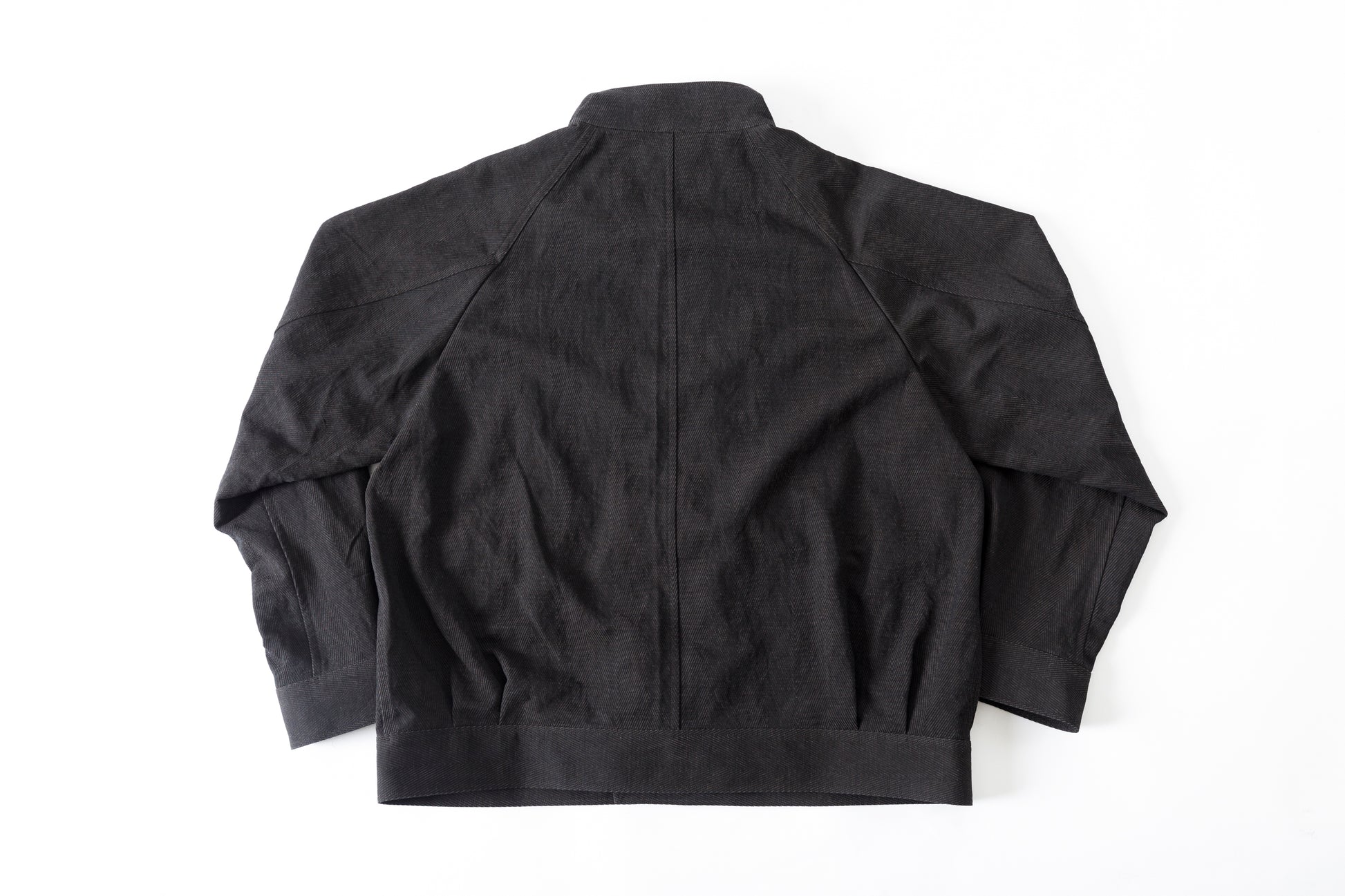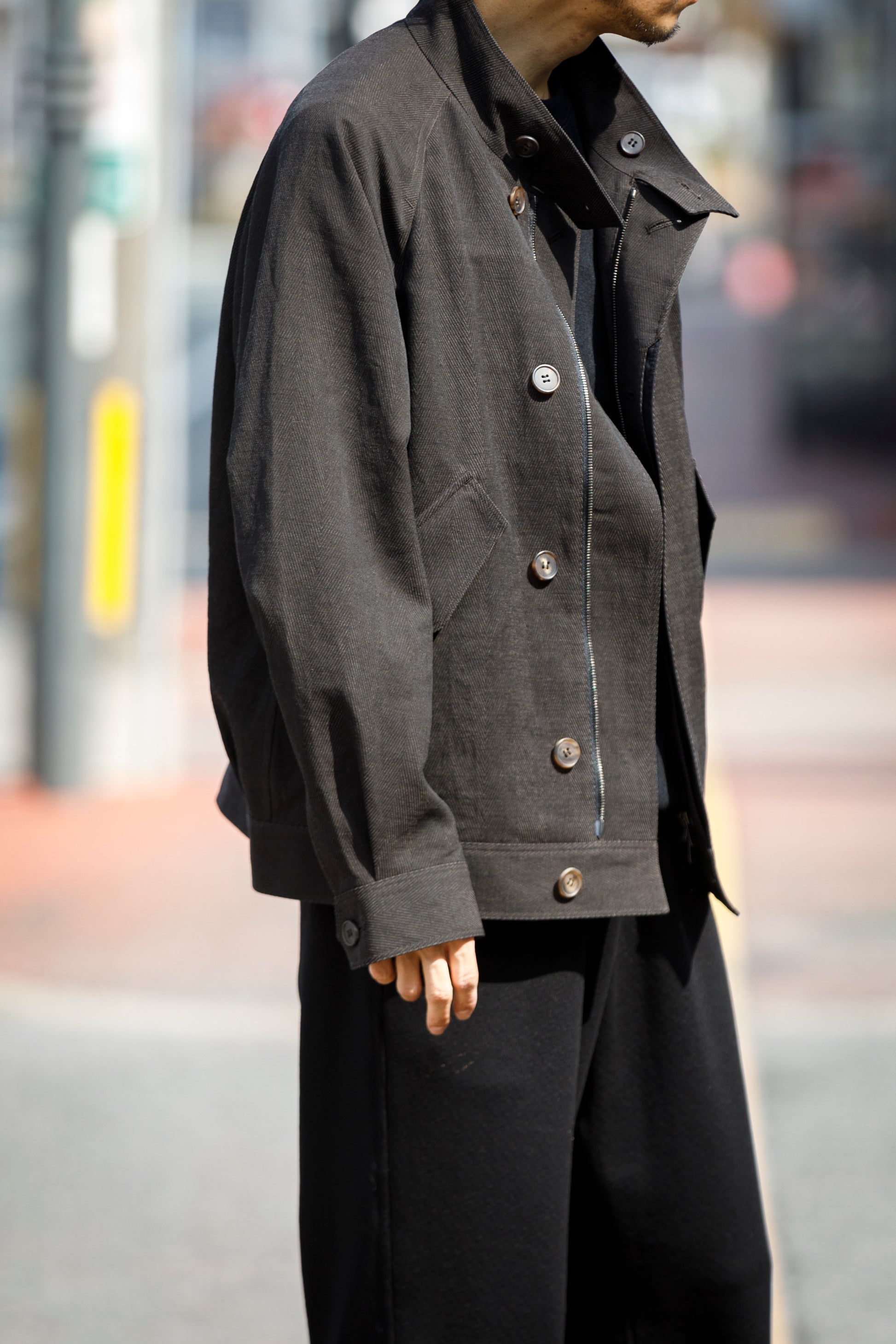 各所にタックを配置することで生まれる膨らみと、ばさっと羽織れるように身幅アームにボリューム感のある仕上がりを意識した1枚仕立てのジャケット、泥染ウールリネンヘリンボーン・セミダブルジップジャケット -doro。