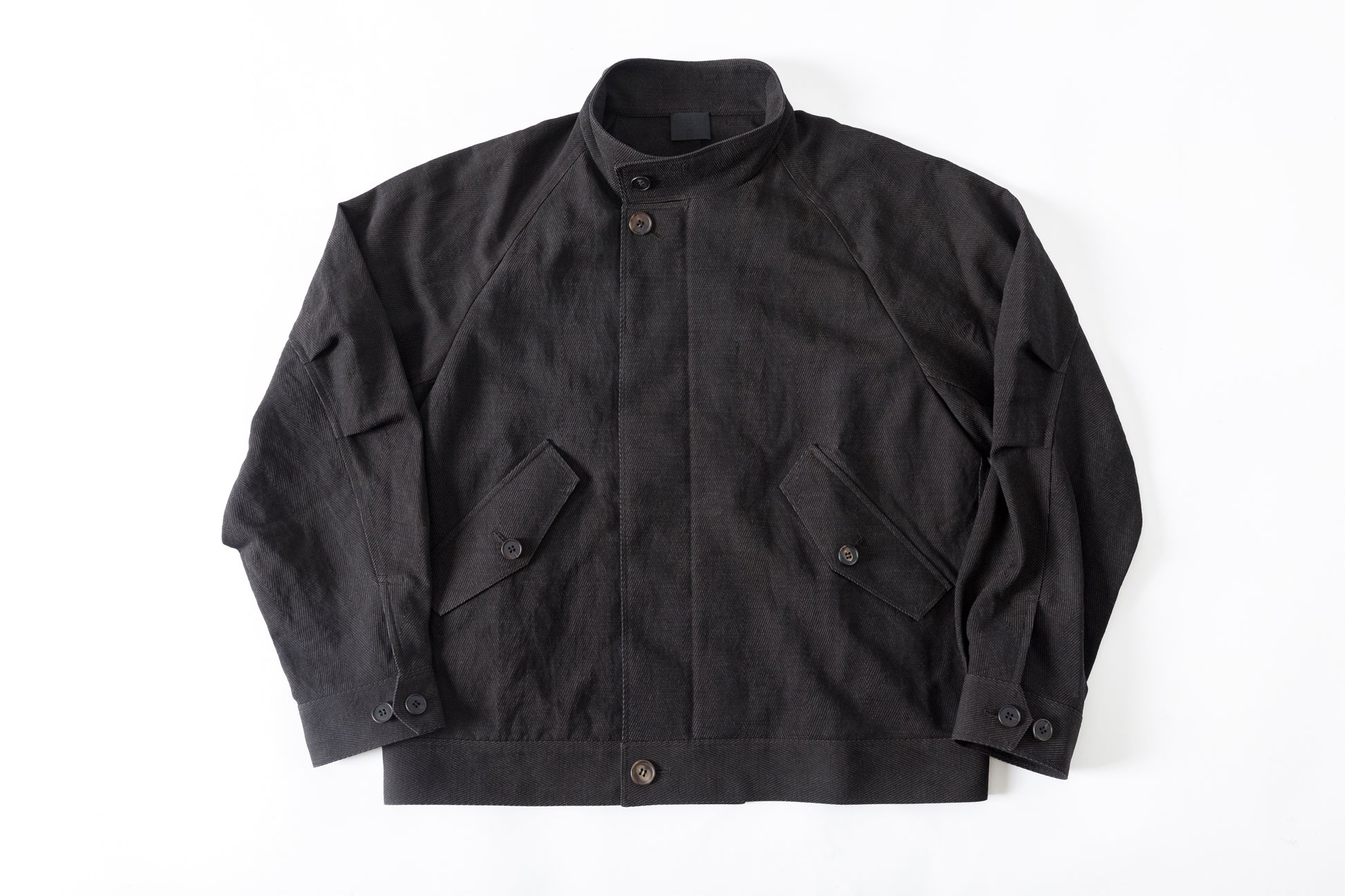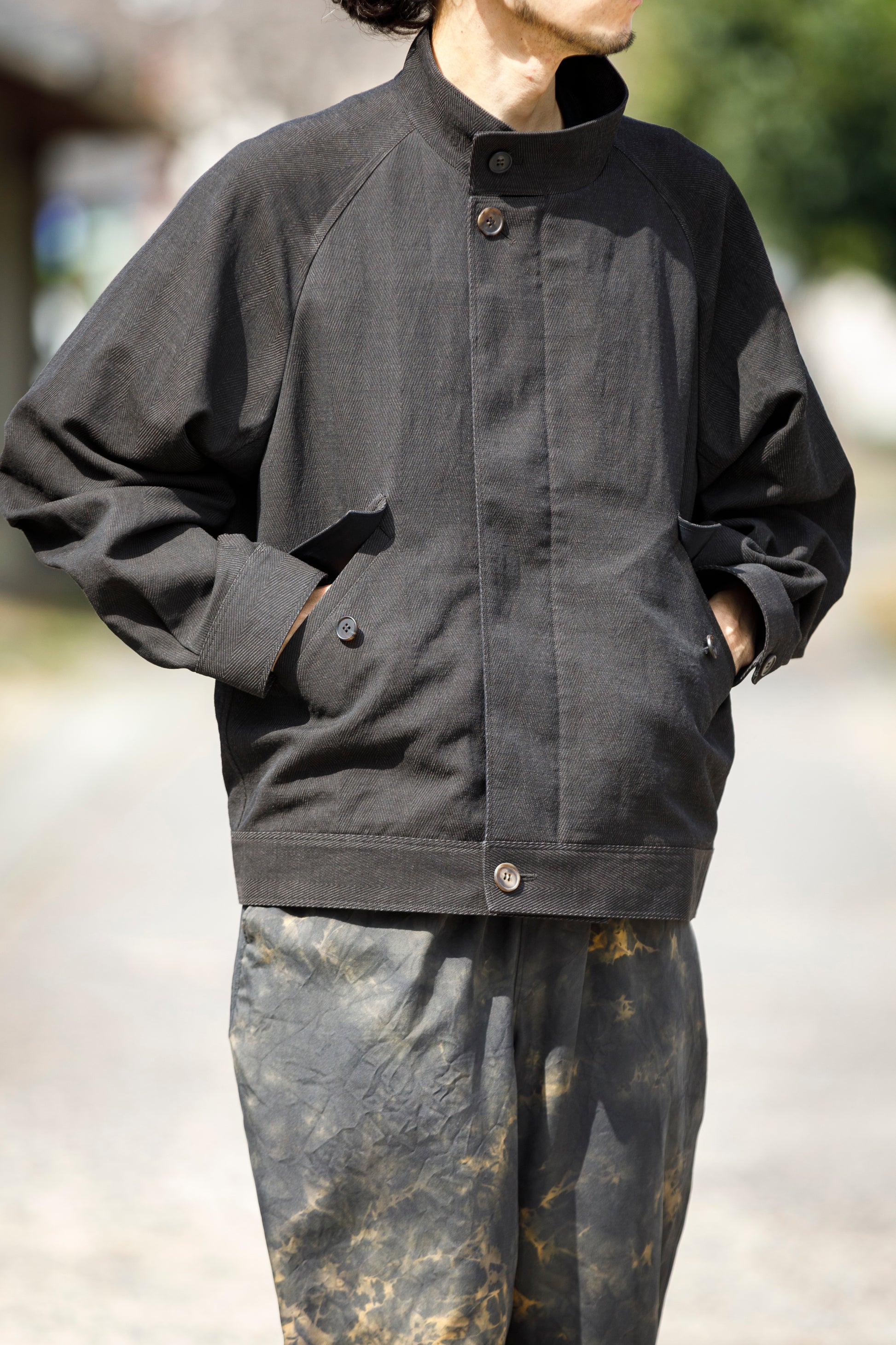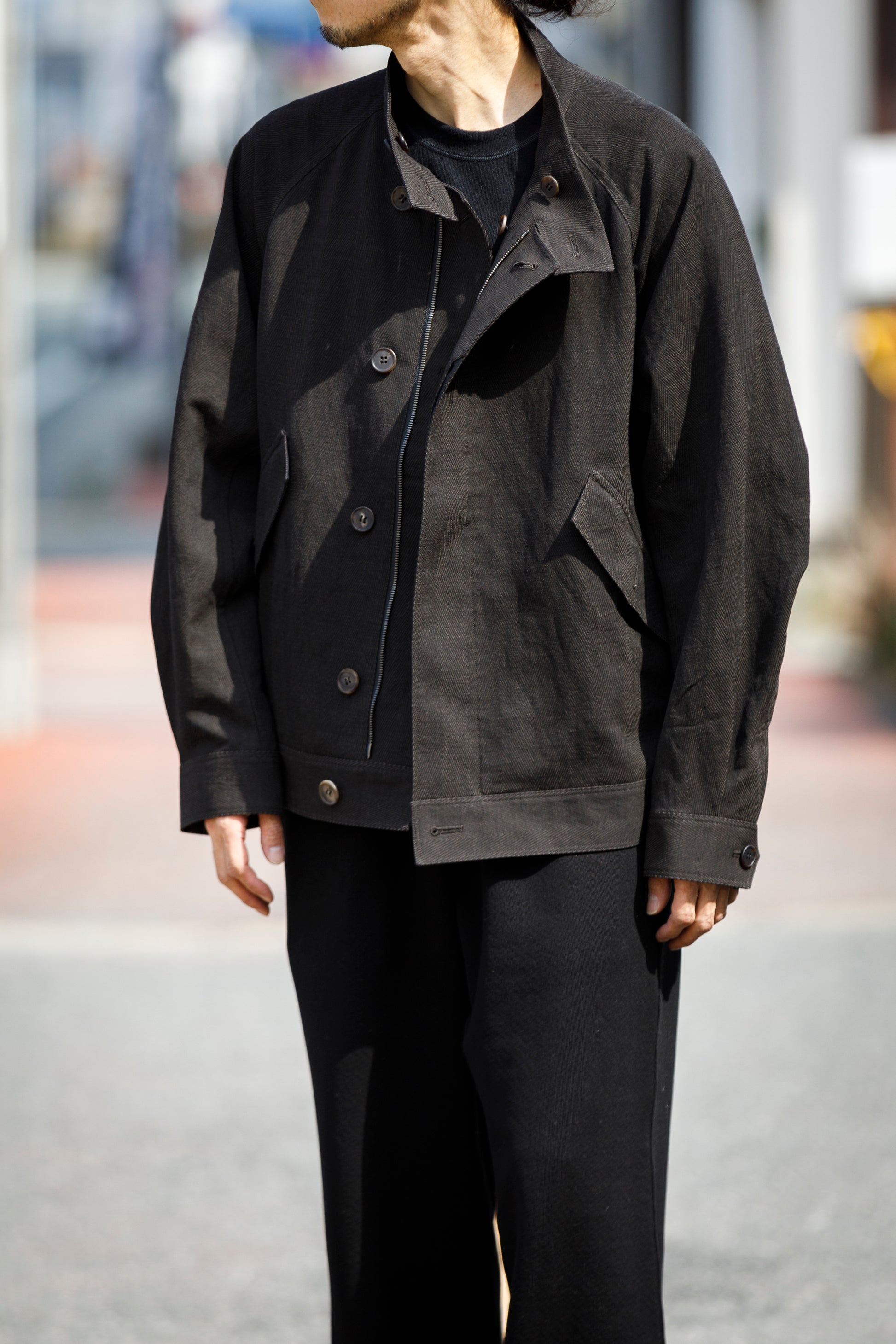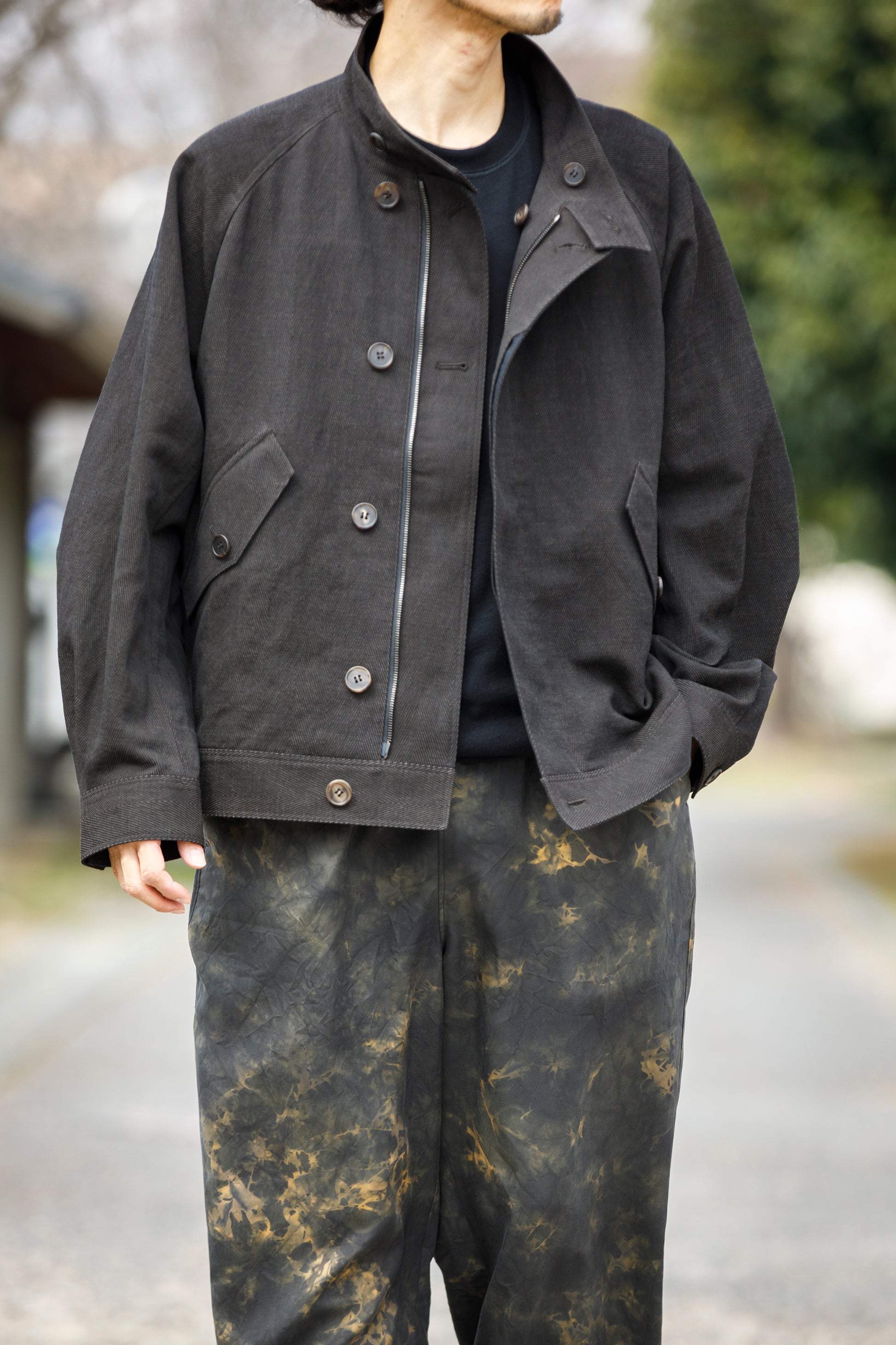 各所にタックを配置することで生まれる膨らみと、ばさっと羽織れるように身幅アームにボリューム感のある仕上がりを意識した1枚仕立てのジャケット、泥染ウールリネンヘリンボーン・セミダブルジップジャケット -doro。