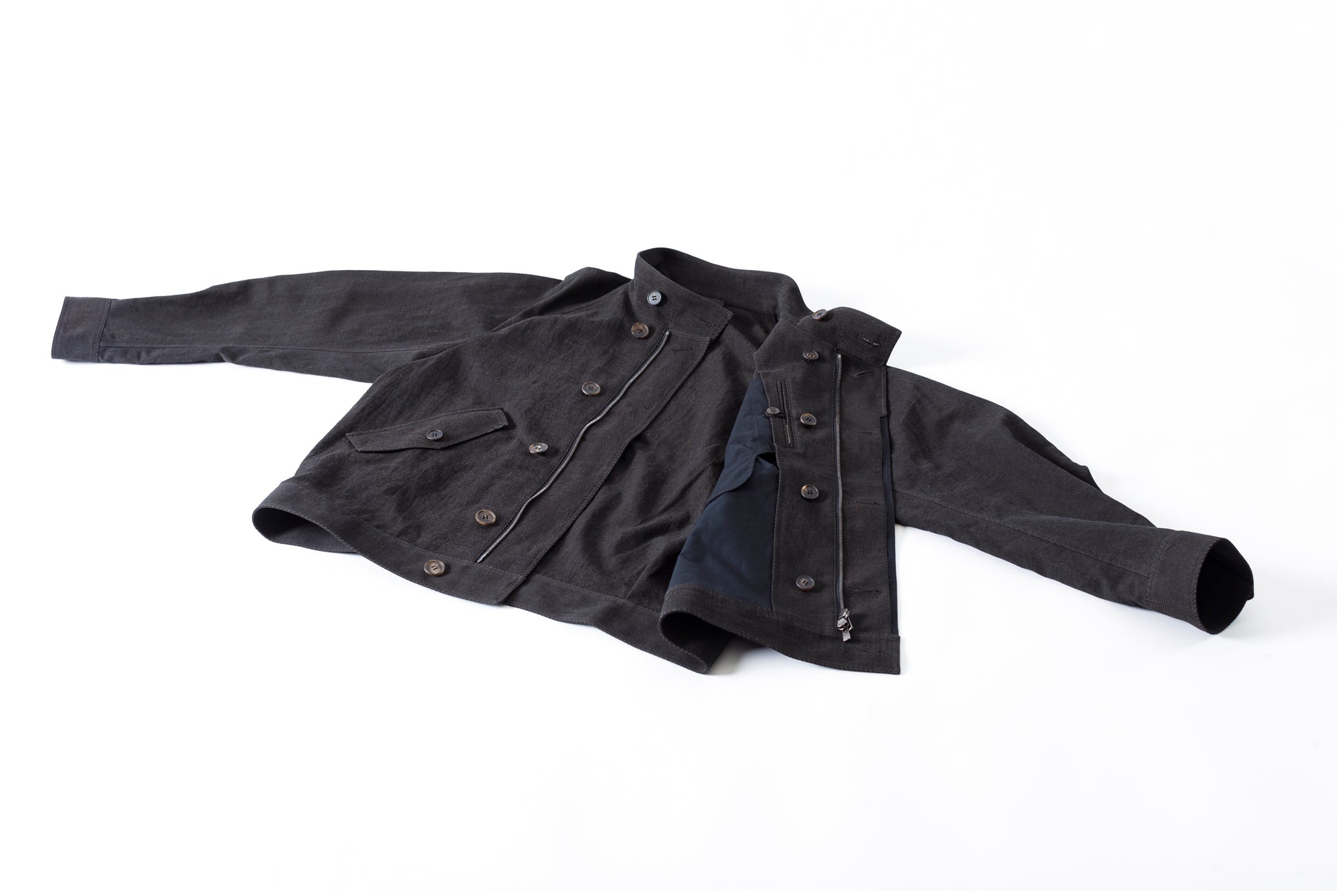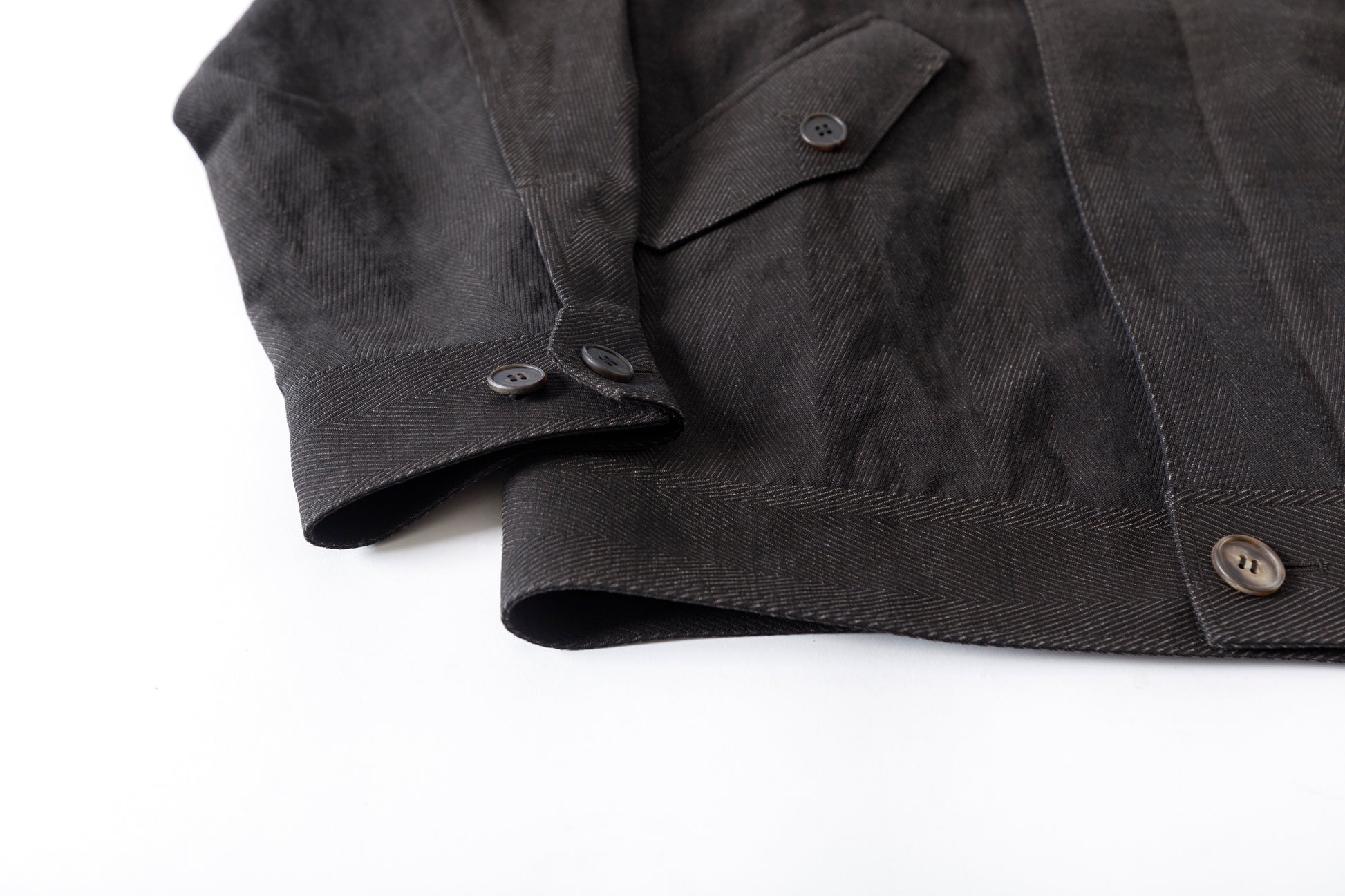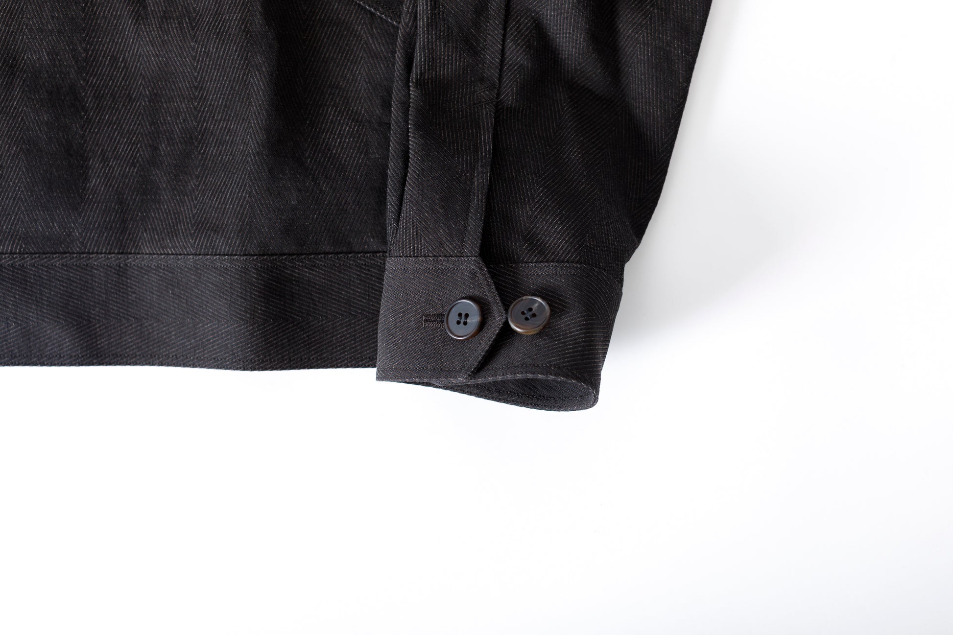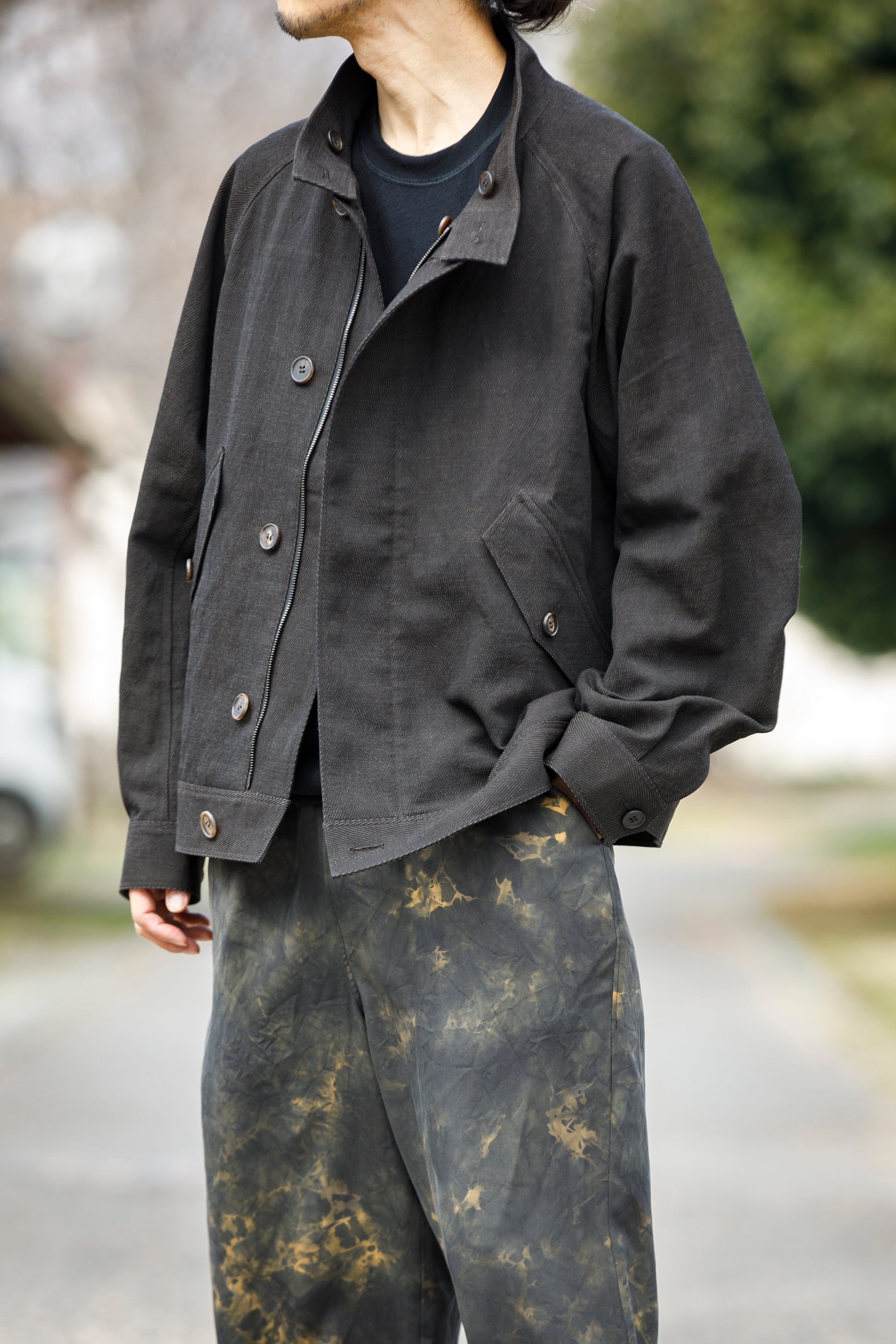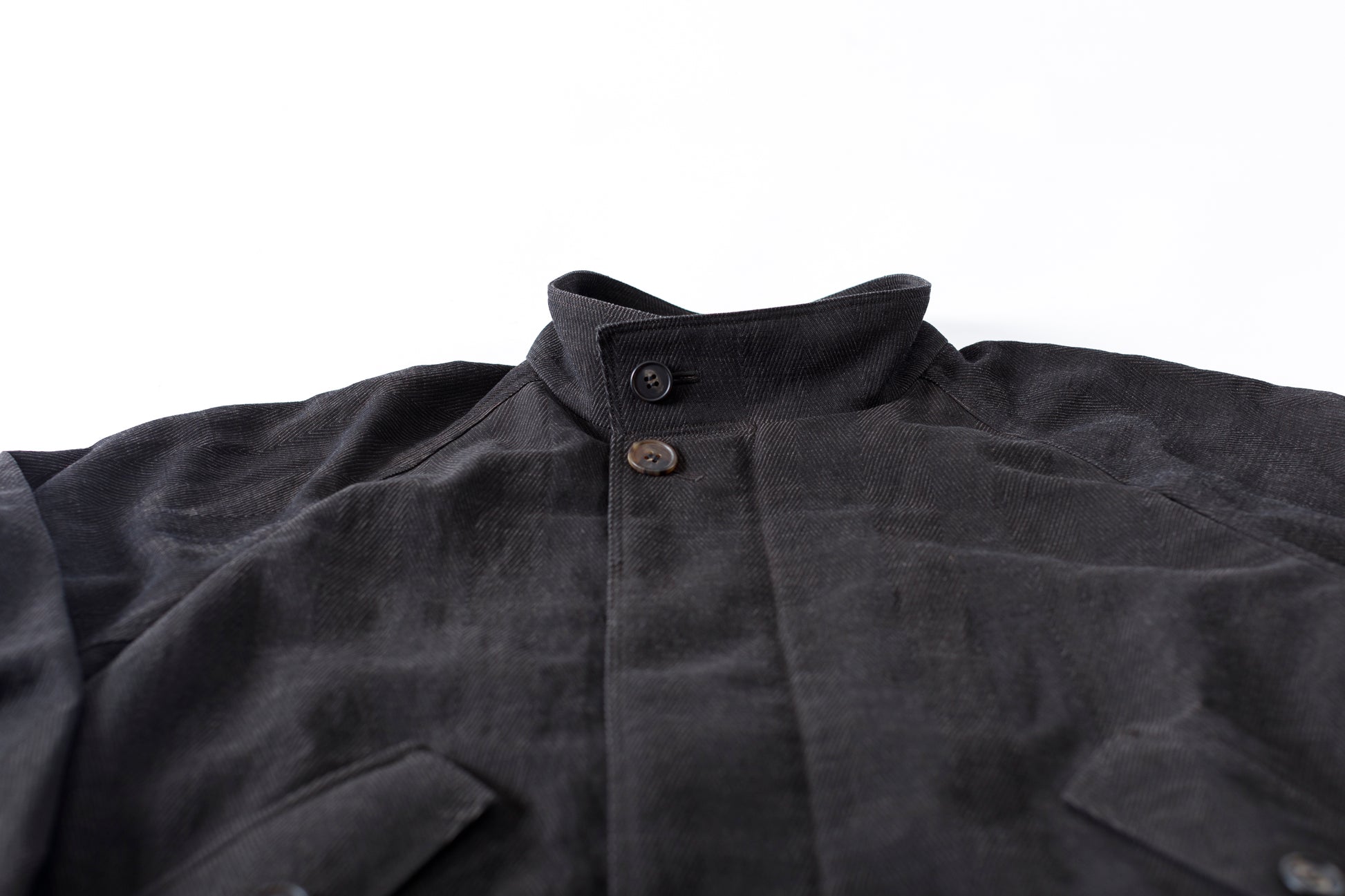 各所にタックを配置することで生まれる膨らみと、ばさっと羽織れるように身幅アームにボリューム感のある仕上がりを意識した1枚仕立てのジャケット、泥染ウールリネンヘリンボーン・セミダブルジップジャケット -doro。