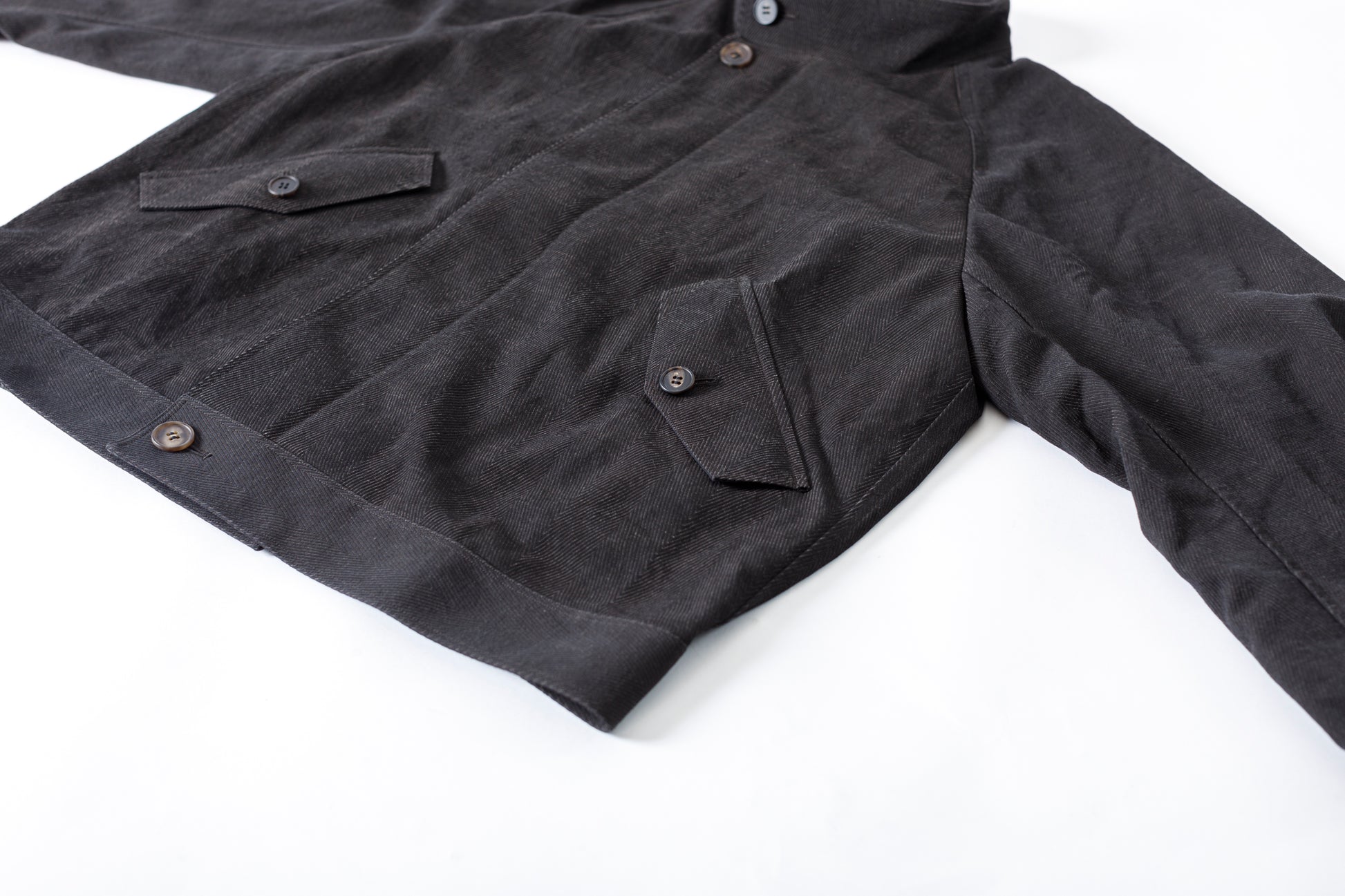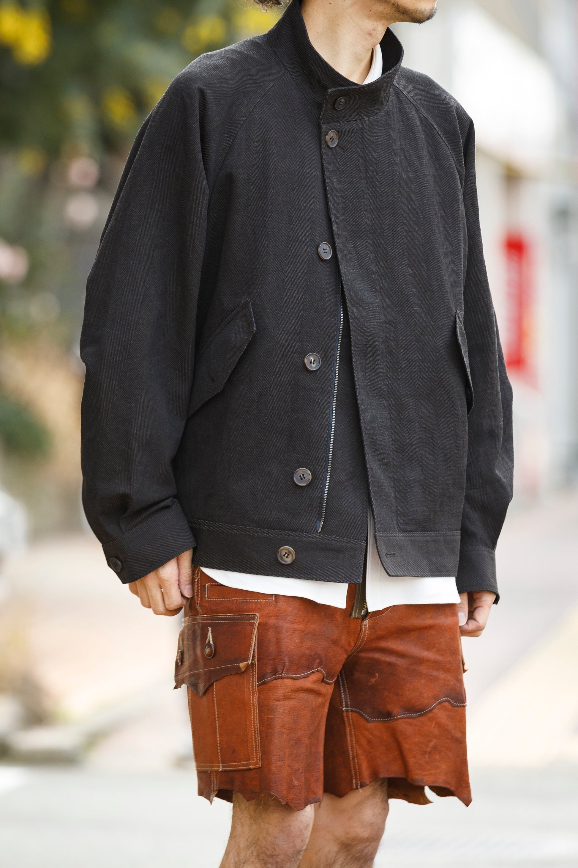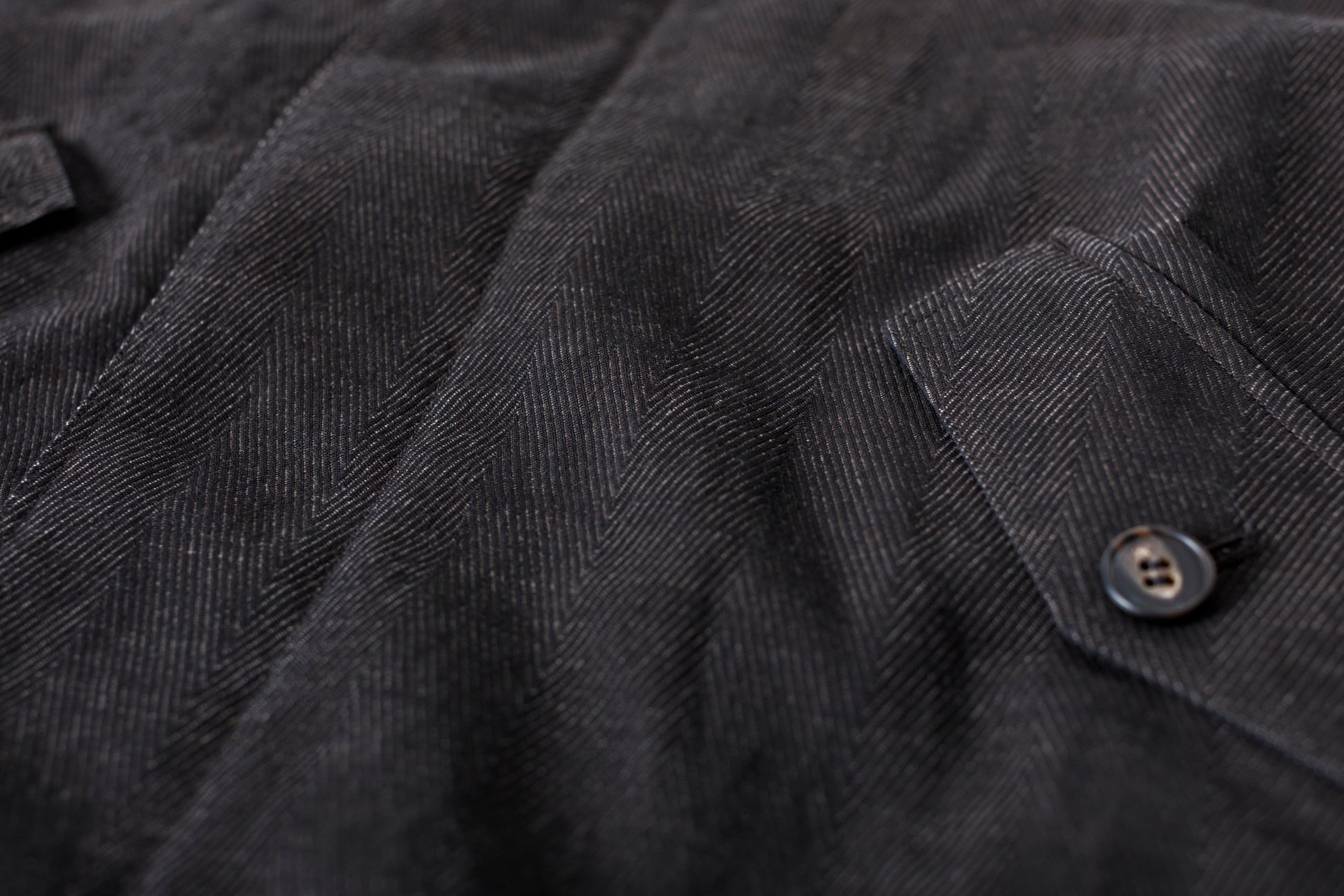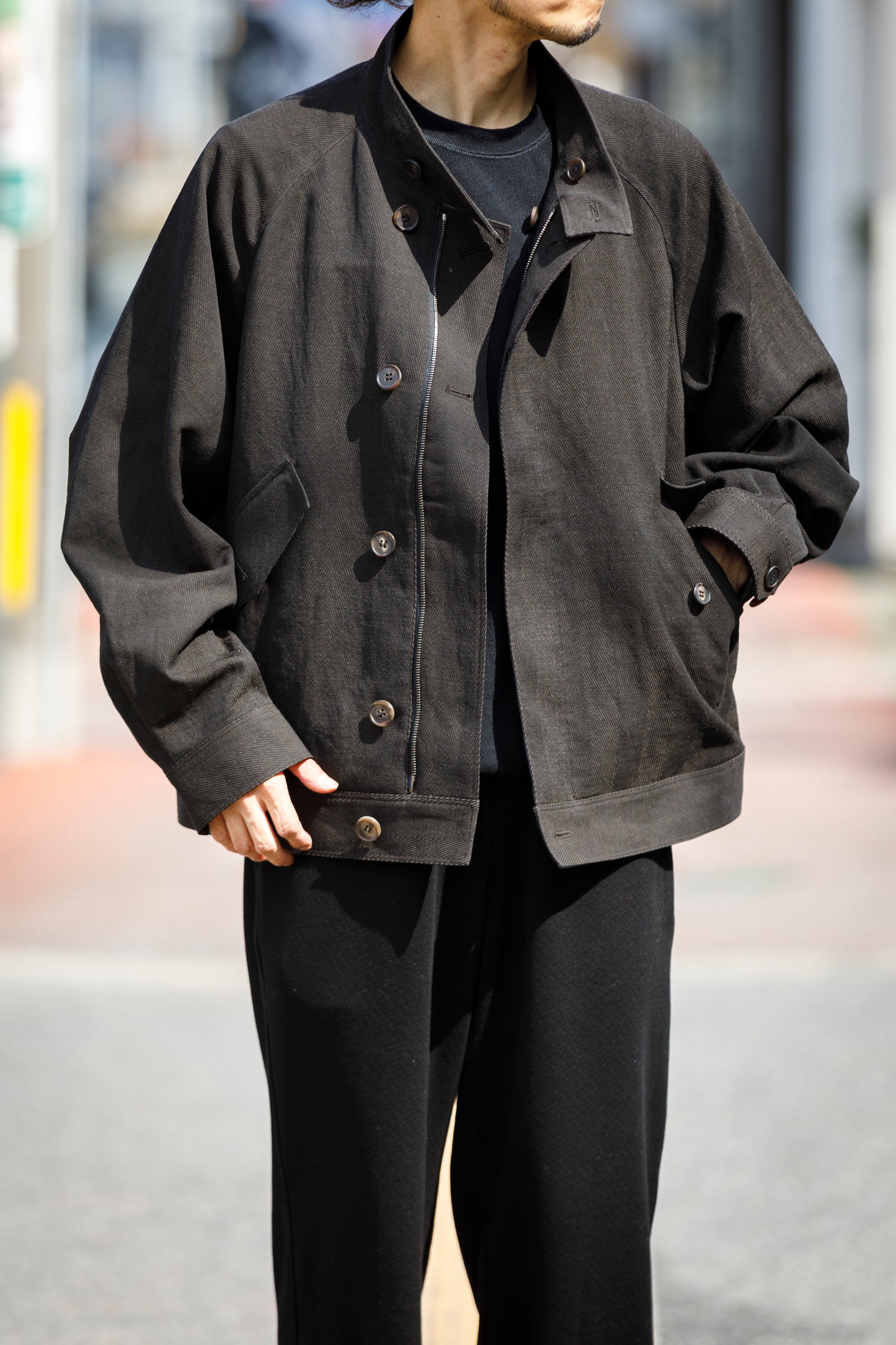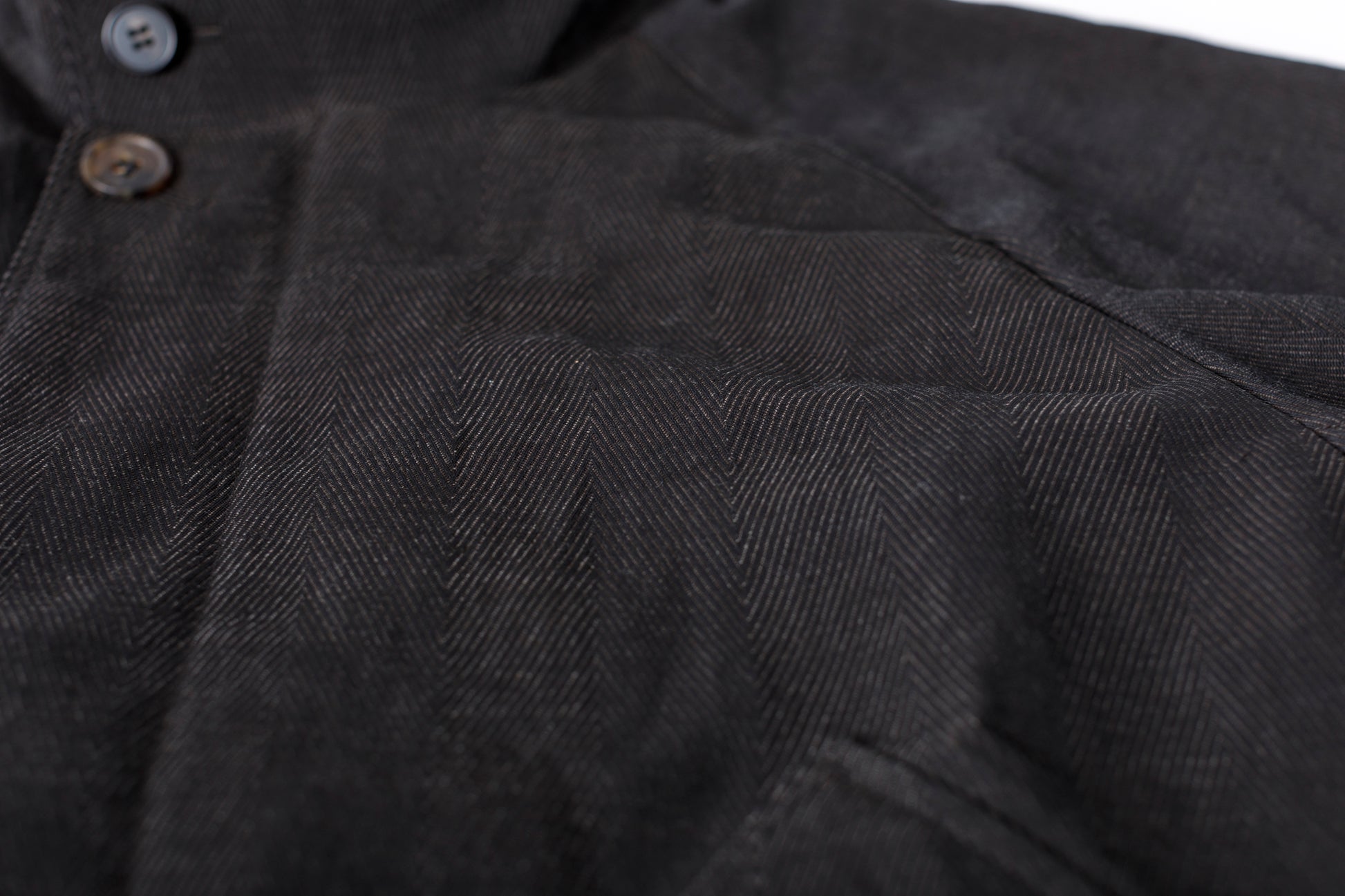 各所にタックを配置することで生まれる膨らみと、ばさっと羽織れるように身幅アームにボリューム感のある仕上がりを意識した1枚仕立てのジャケット、泥染ウールリネンヘリンボーン・セミダブルジップジャケット -doro。