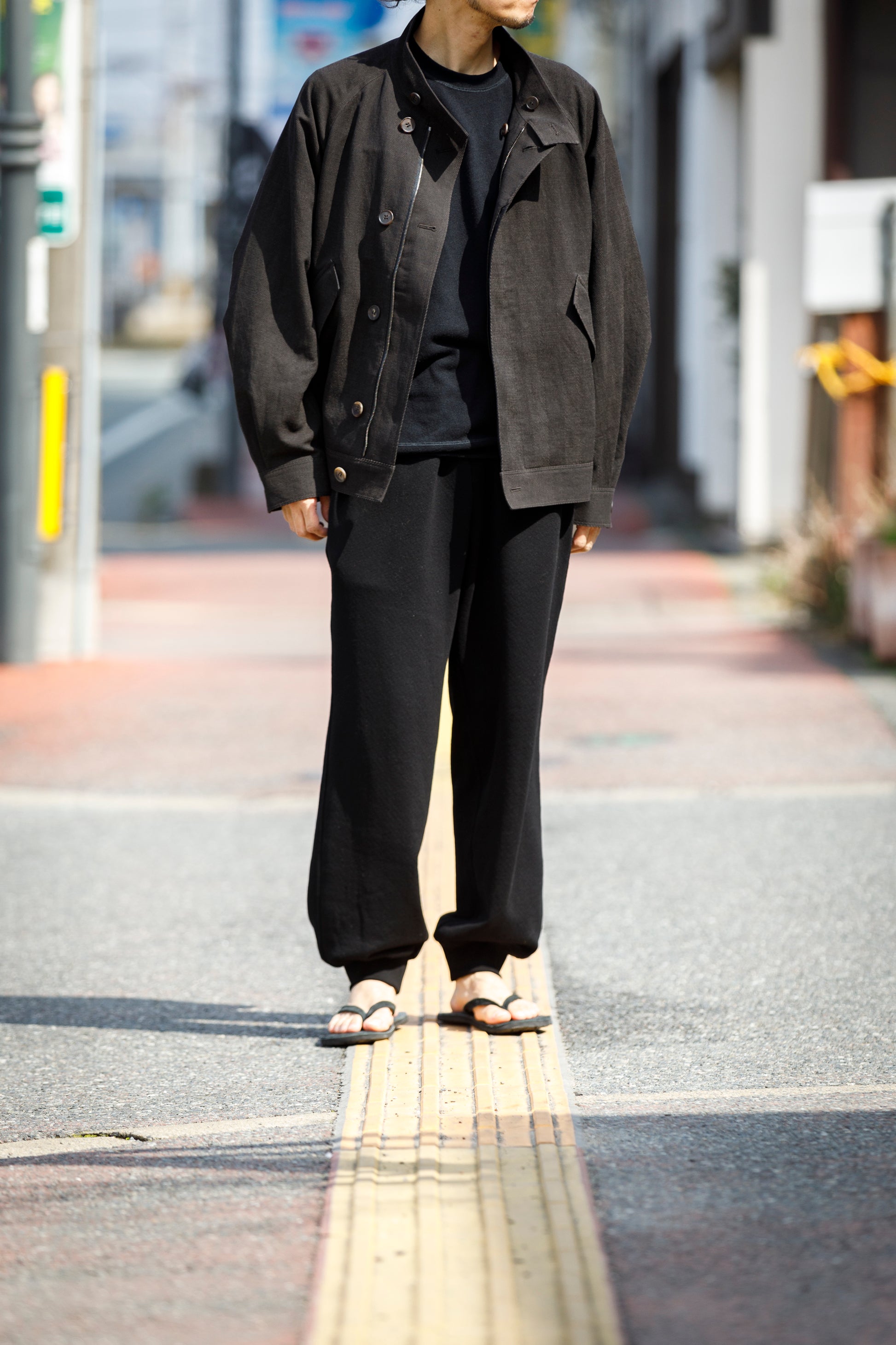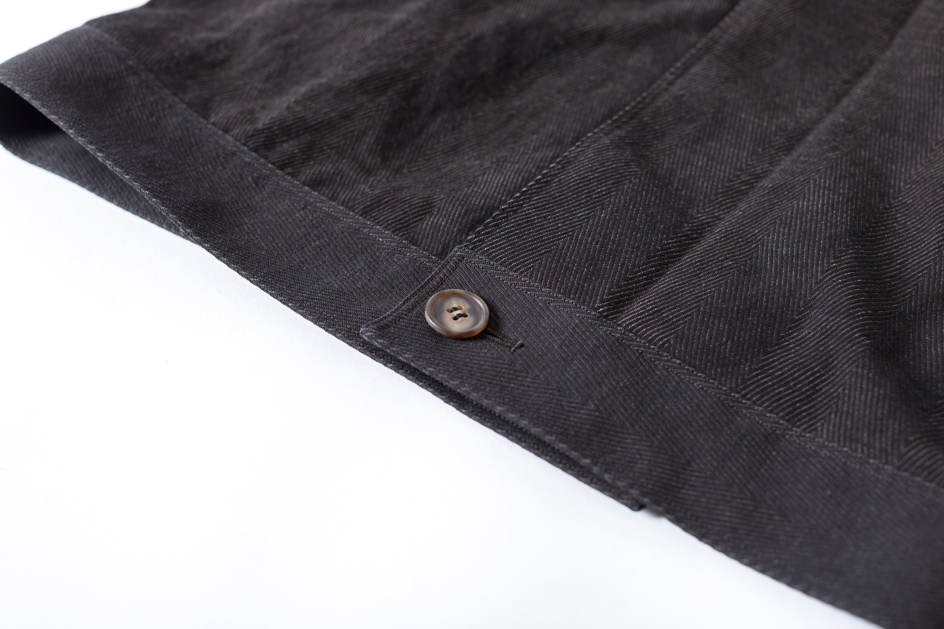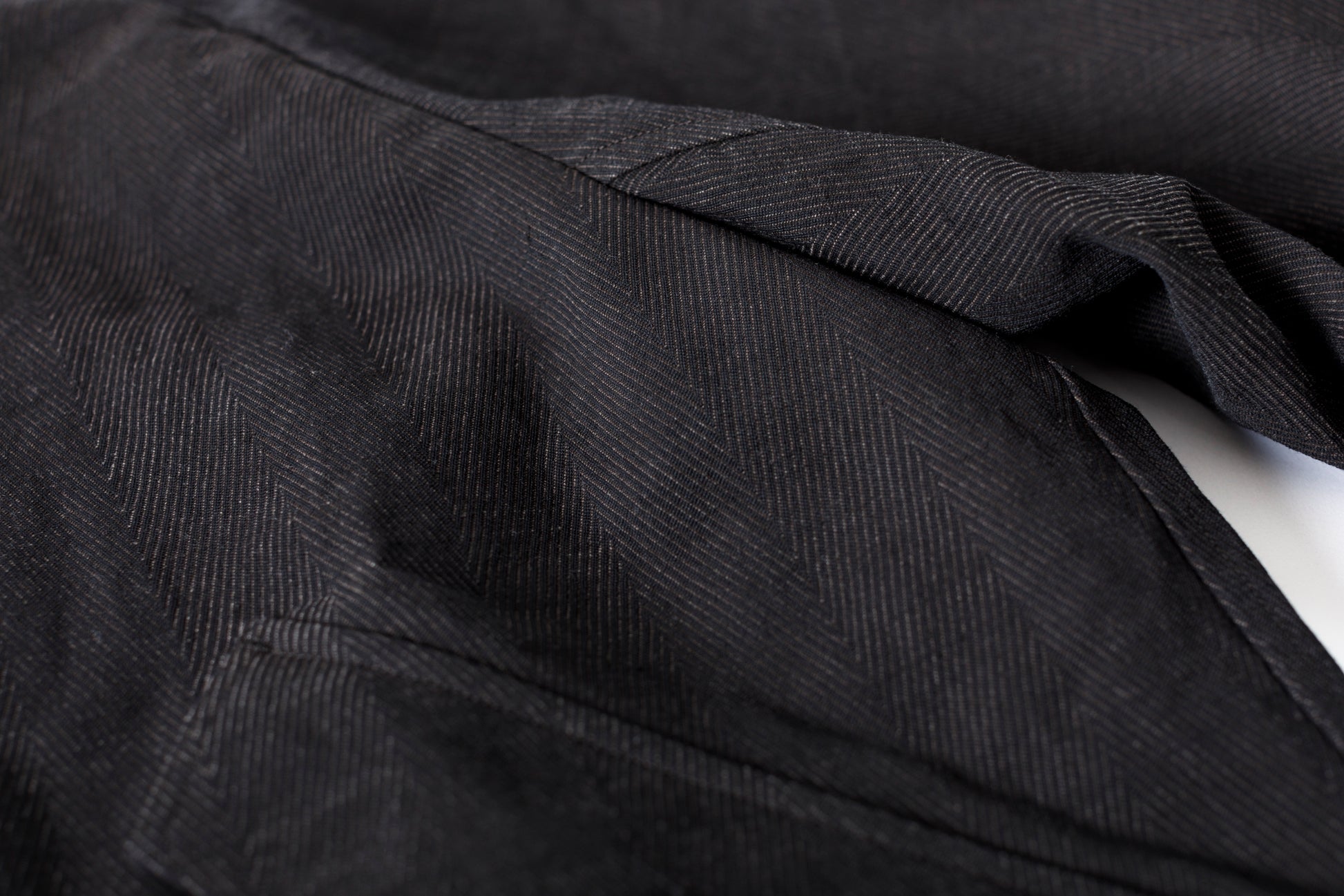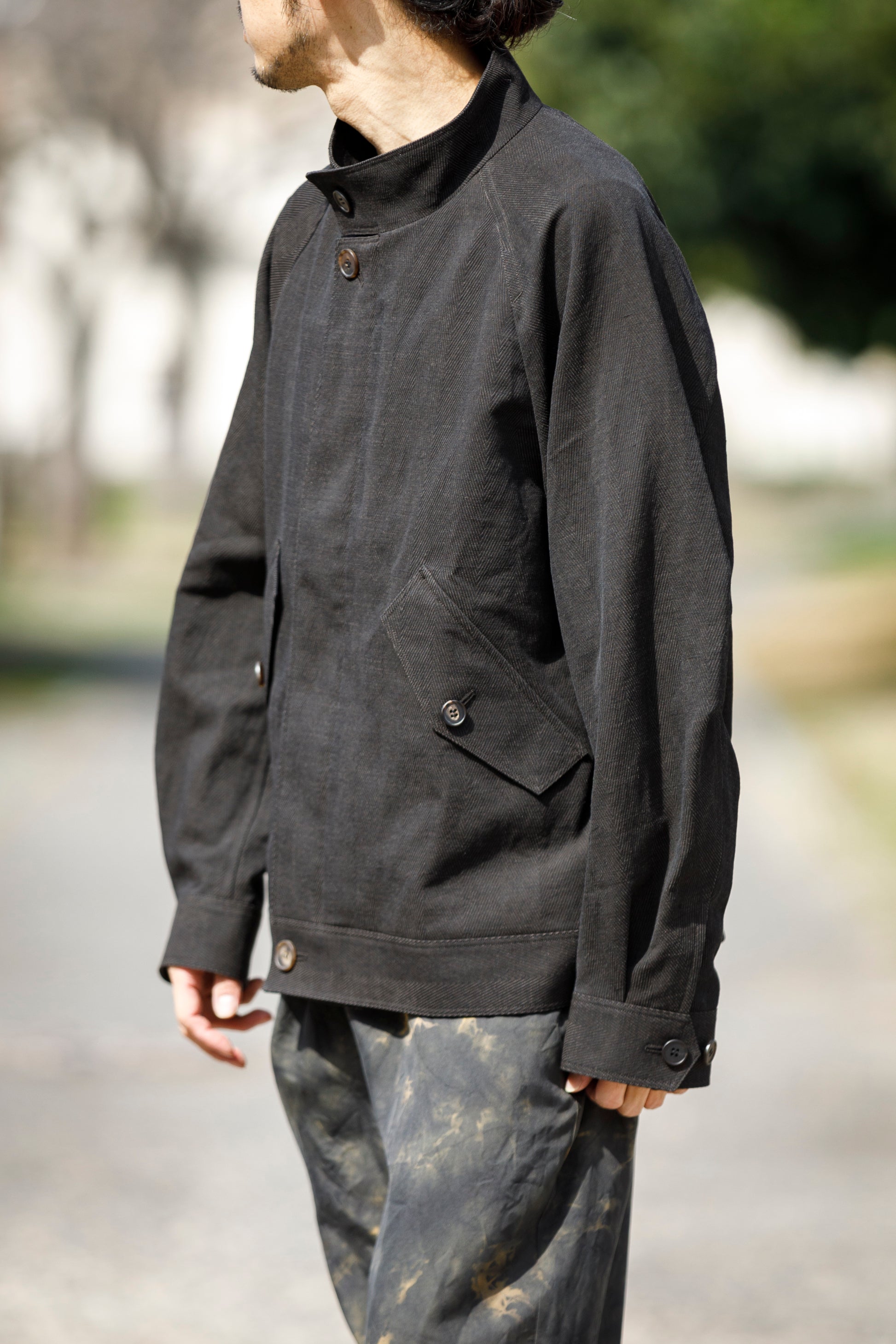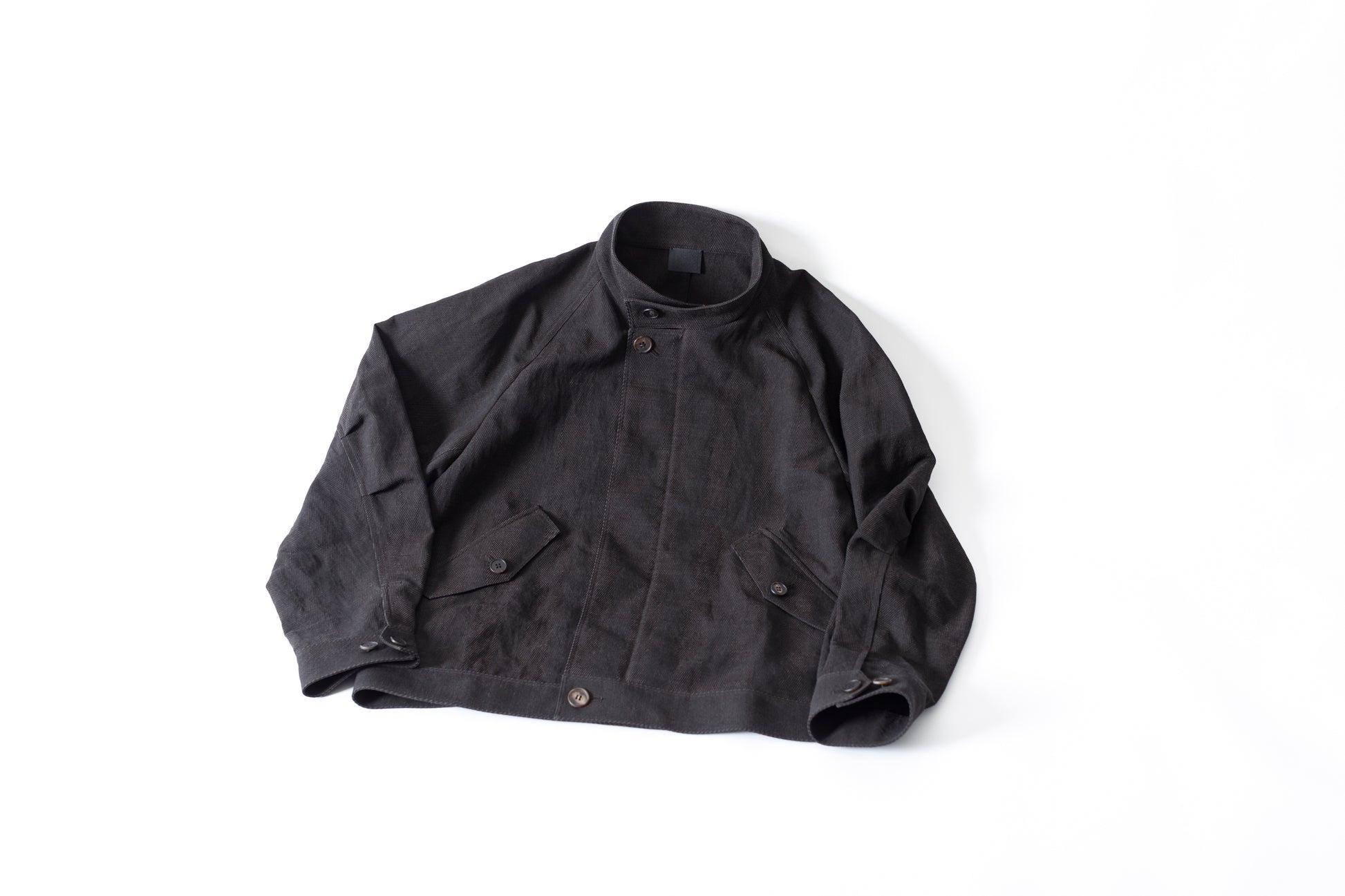 各所にタックを配置することで生まれる膨らみと、ばさっと羽織れるように身幅アームにボリューム感のある仕上がりを意識した1枚仕立てのジャケット、泥染ウールリネンヘリンボーン・セミダブルジップジャケット -doro。