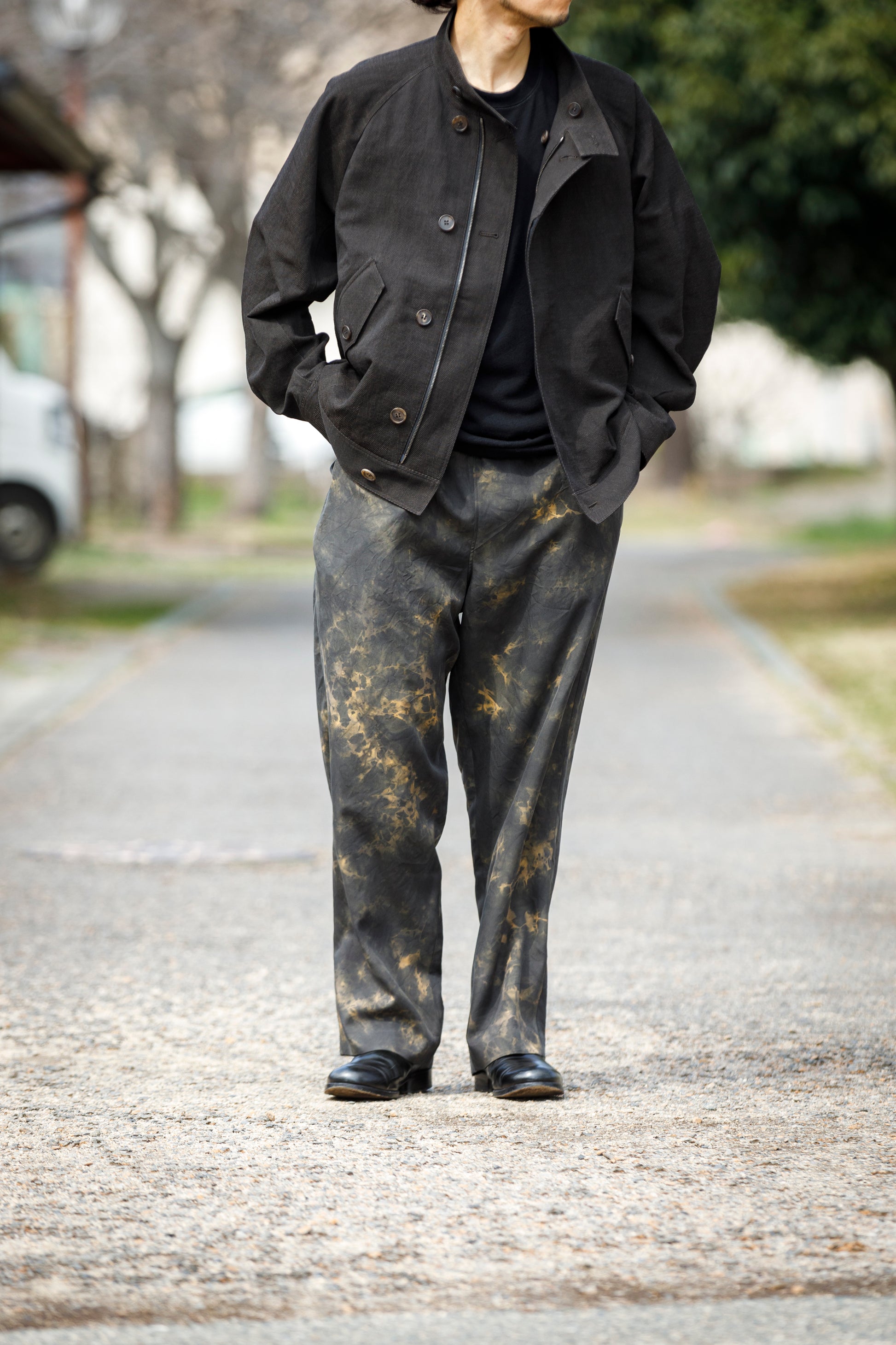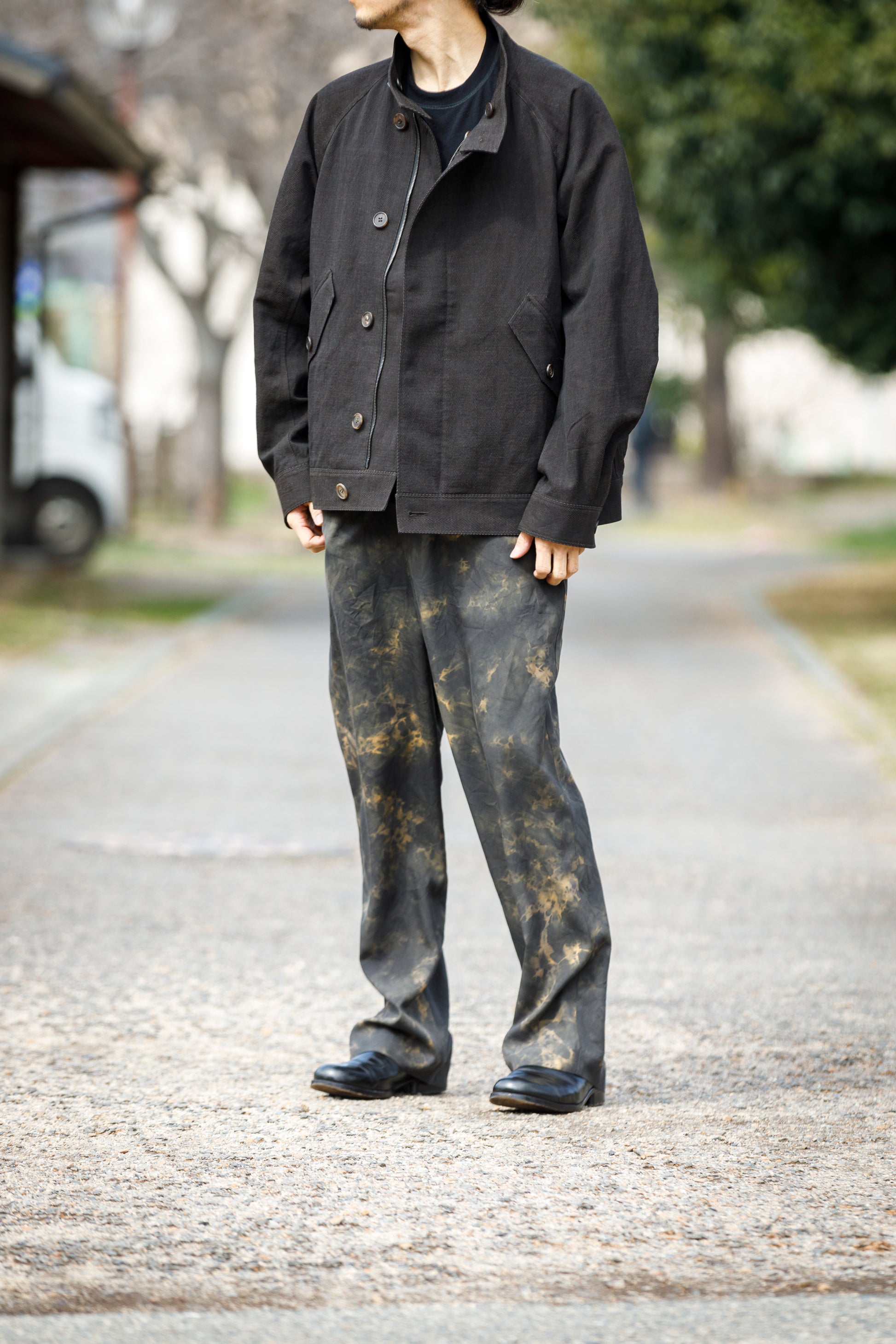 天然繊維ならではの吸湿性にも優れ、どちら共の糸の良さを引き立てた生地を山内がこの数年力を入れて提案している泥染め加工を施すことで美しくもクラフトな要素も兼ね備えた特別感のある生地に仕上がりました。