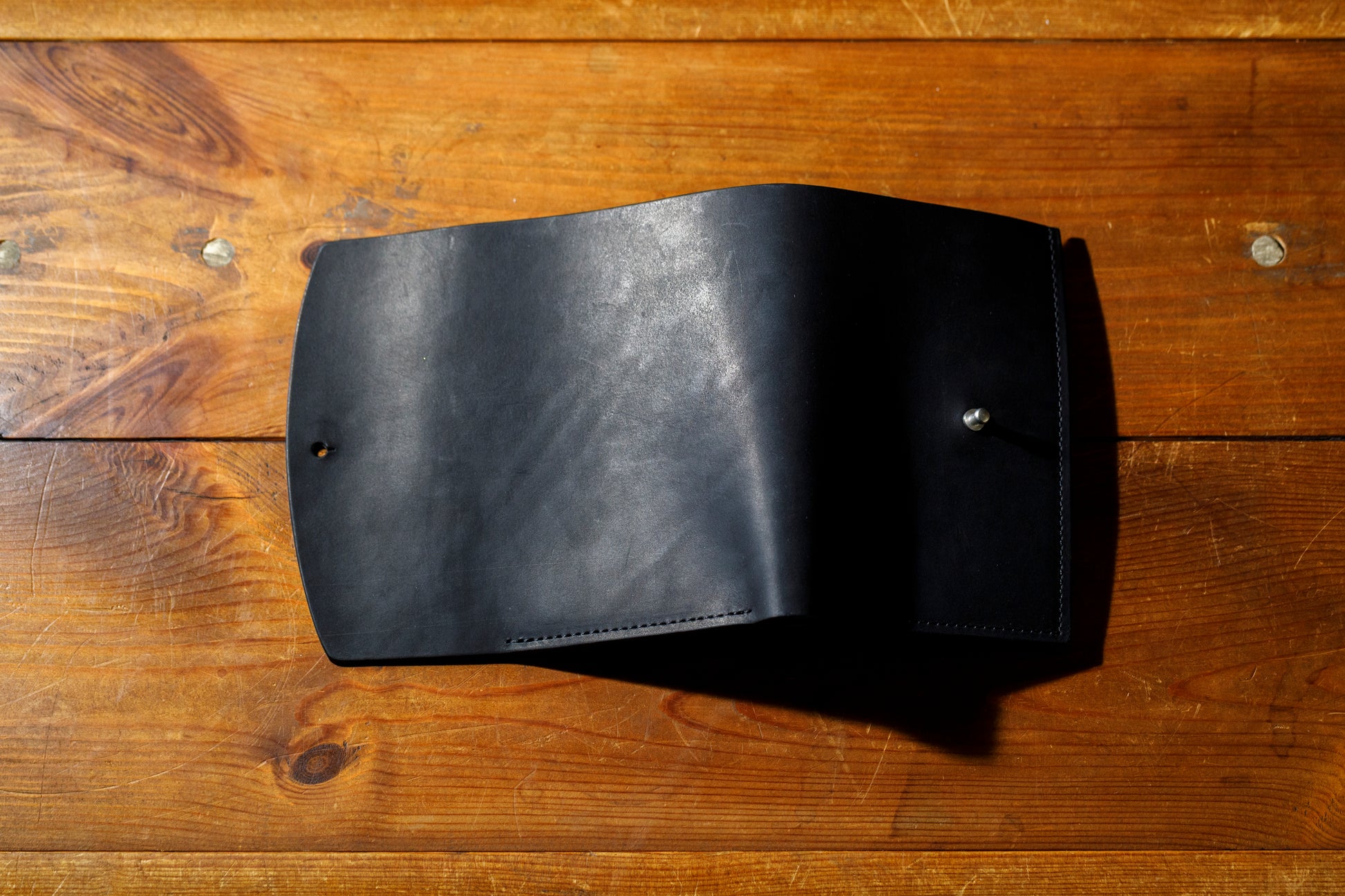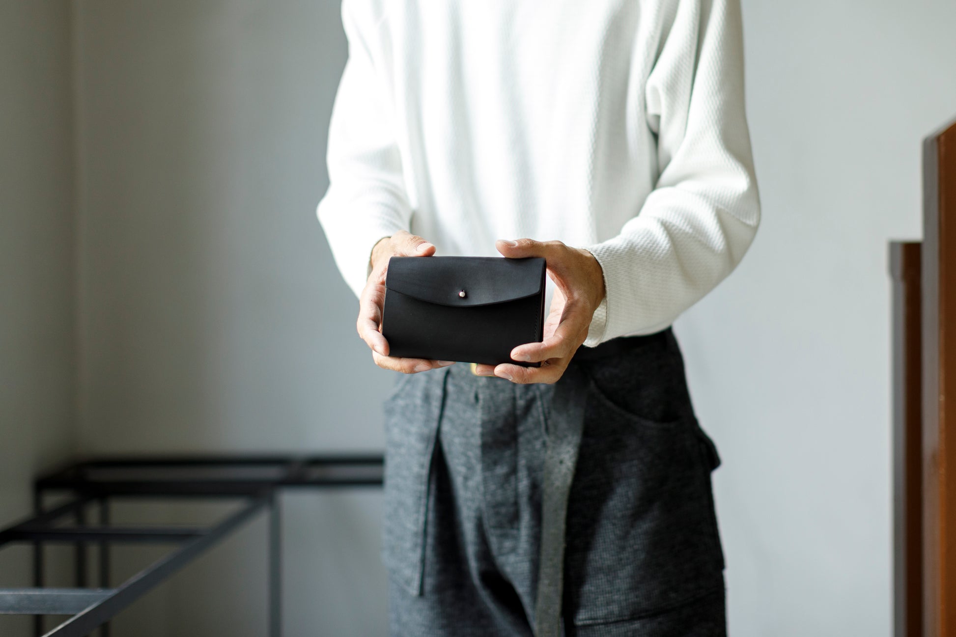 各箇所は丁寧に縫製が施されており、ギボシを使用した端正なビジュアルで制作されたウォレットです。