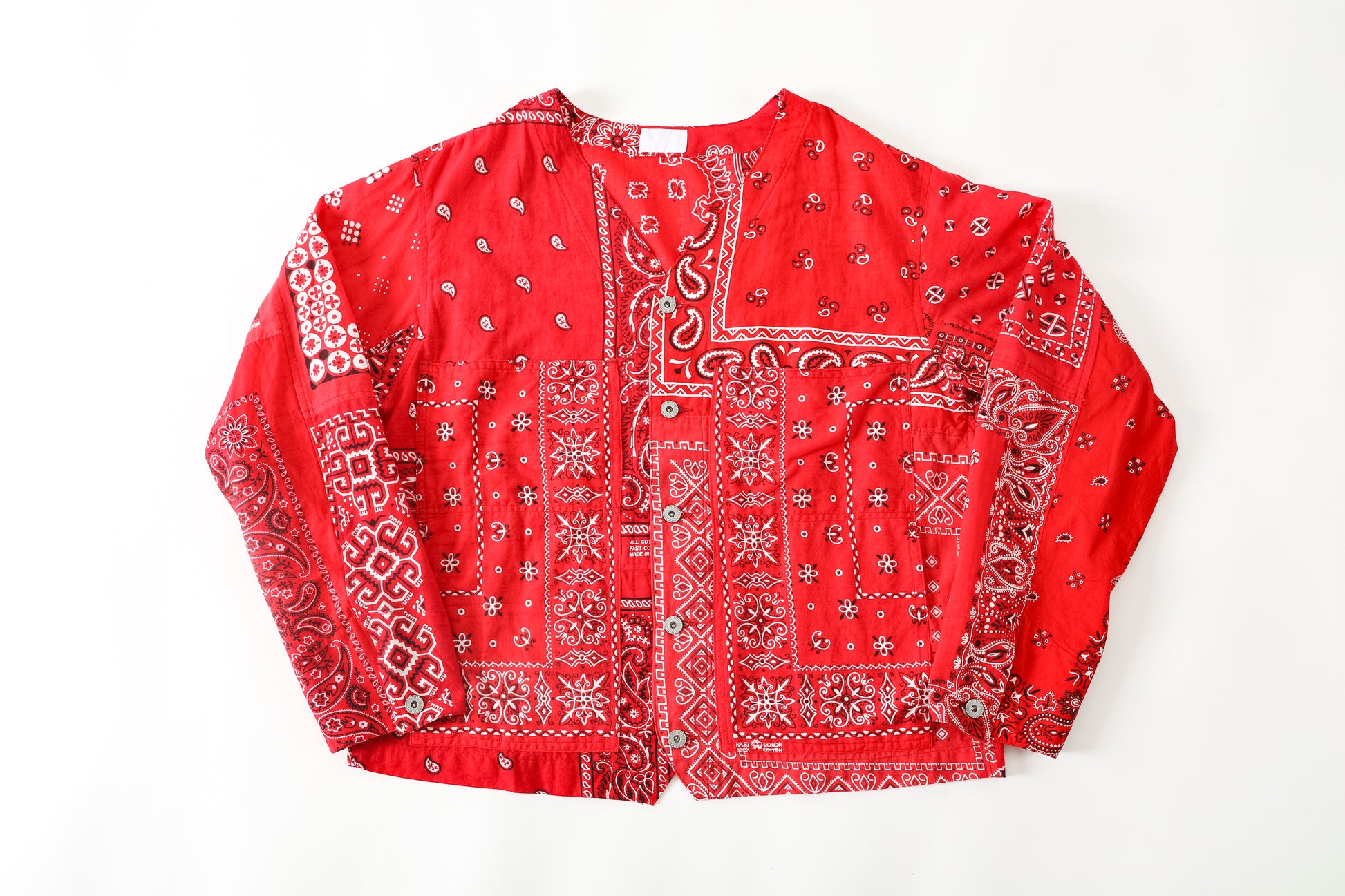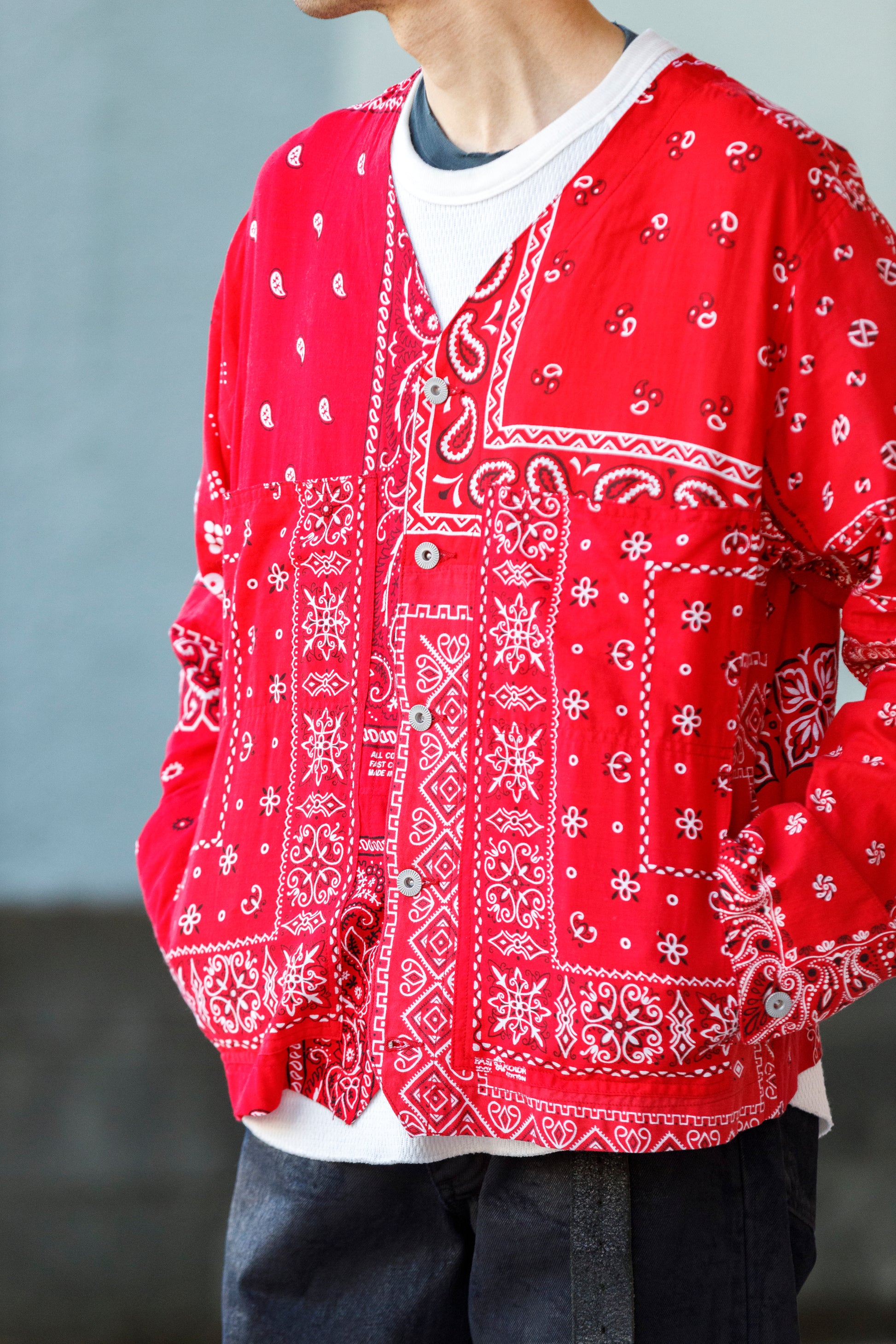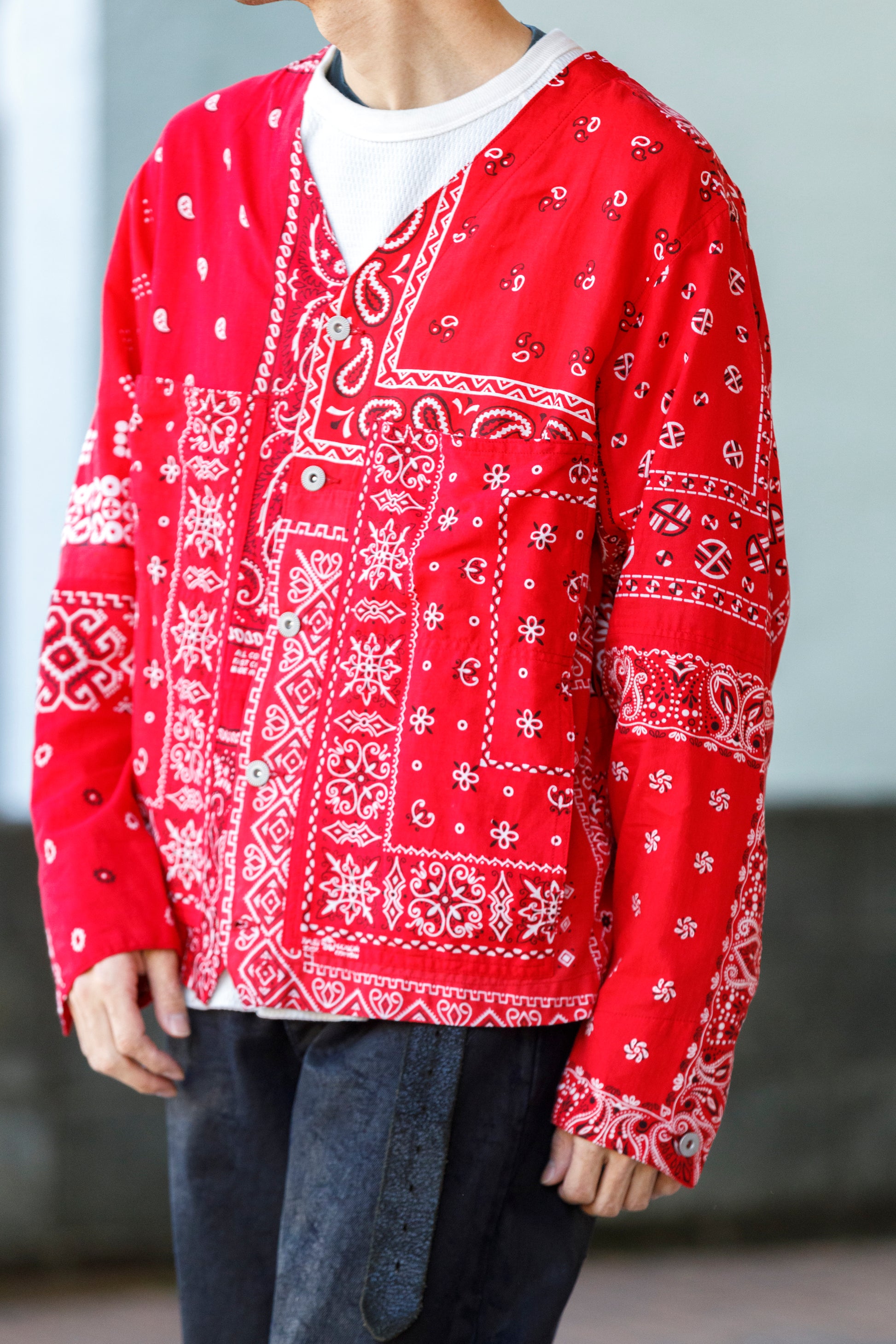 Usedのバンダナを複数枚解体し、エンジニアジャケットベースのノーカラージャケットに再構築した、Remake Engineer Jacket。