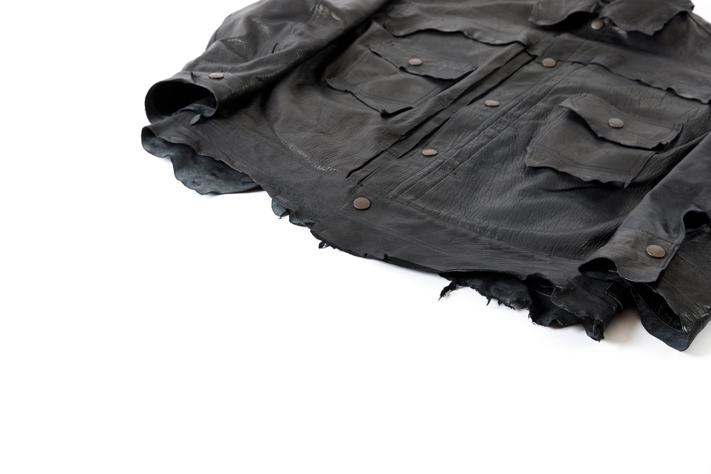全て断ち切り(切りっぱなし)で処理され、ボディはナチュラルエッジで切り替え裾やポケットのフラップは元々のレザーが持つナチュラルエッジも込みでデザインとして落とし込まれております。