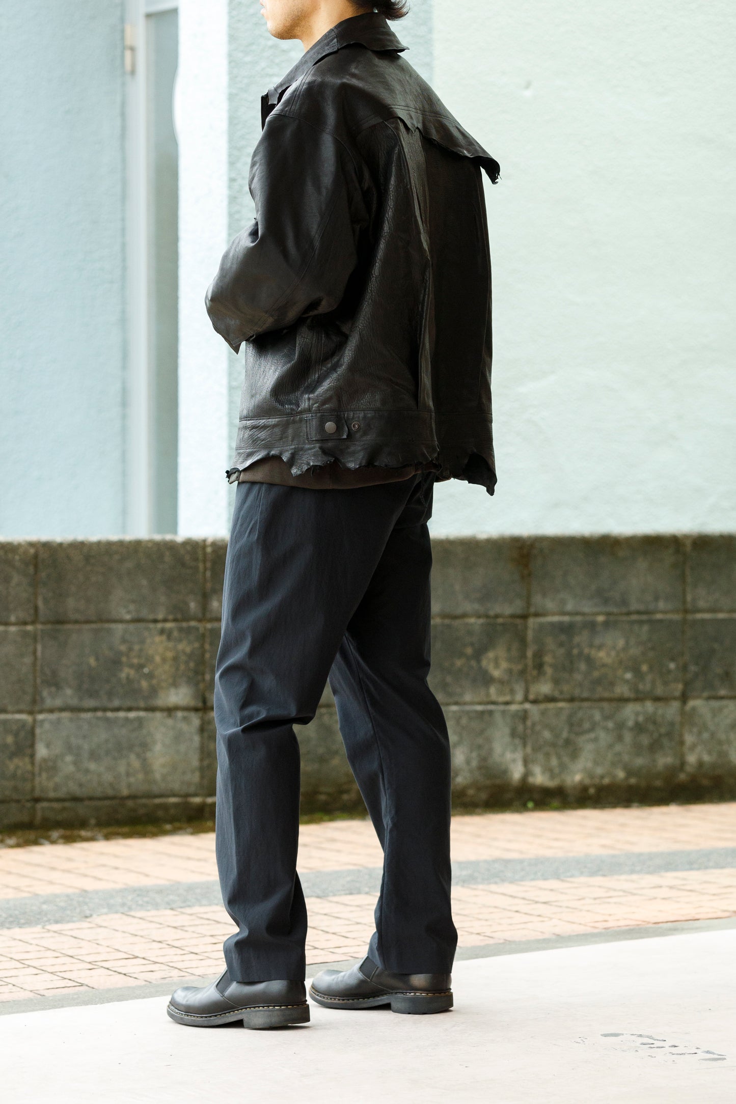 デザインとしてだけでなく、革の取りを考慮した意味のあるディテールとしても機能しており、着用時の背中の間が生まれブランドの全アイテムに共通する絶妙な落ち感、シルエットバランスを生み出しております。
