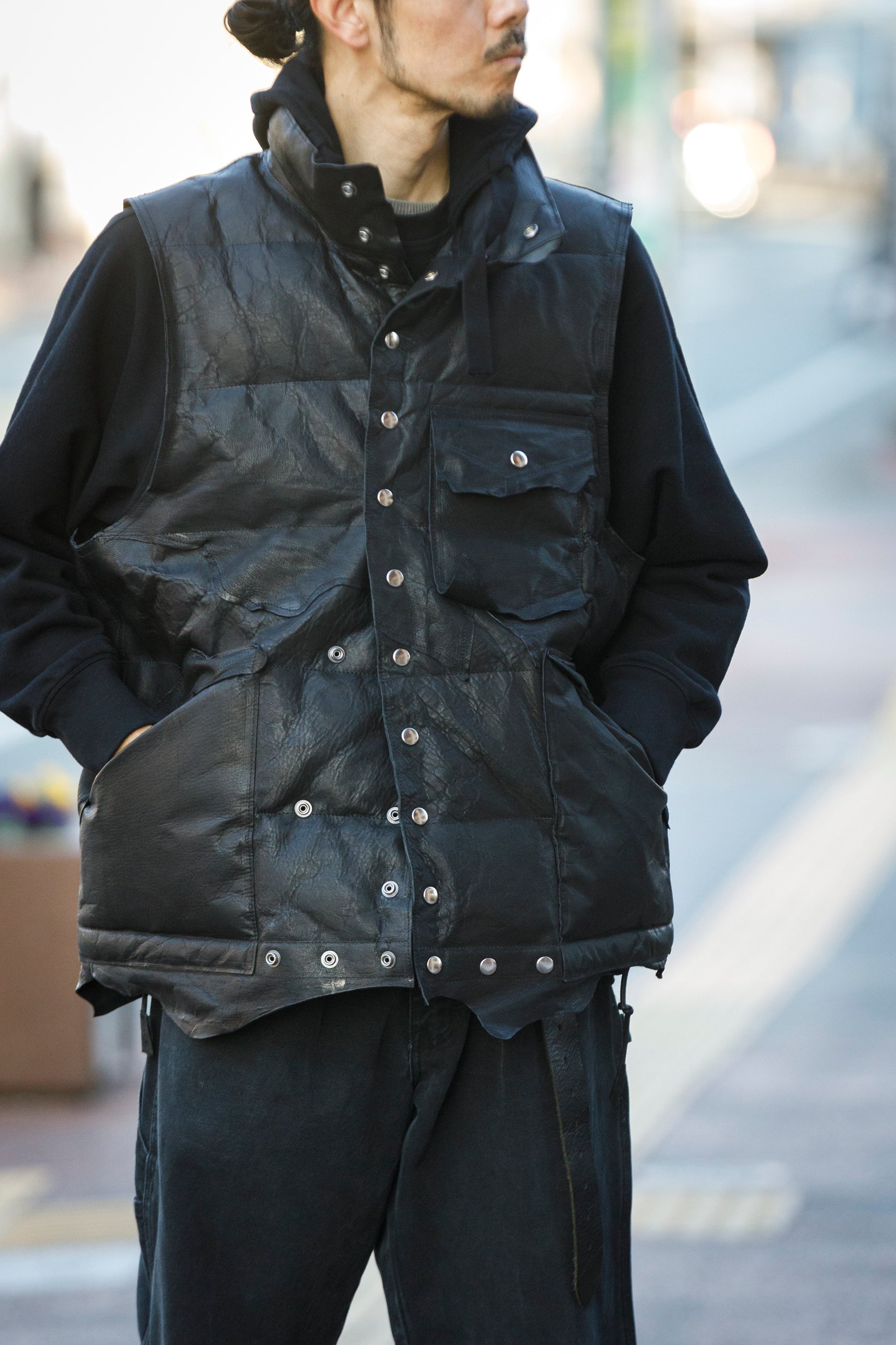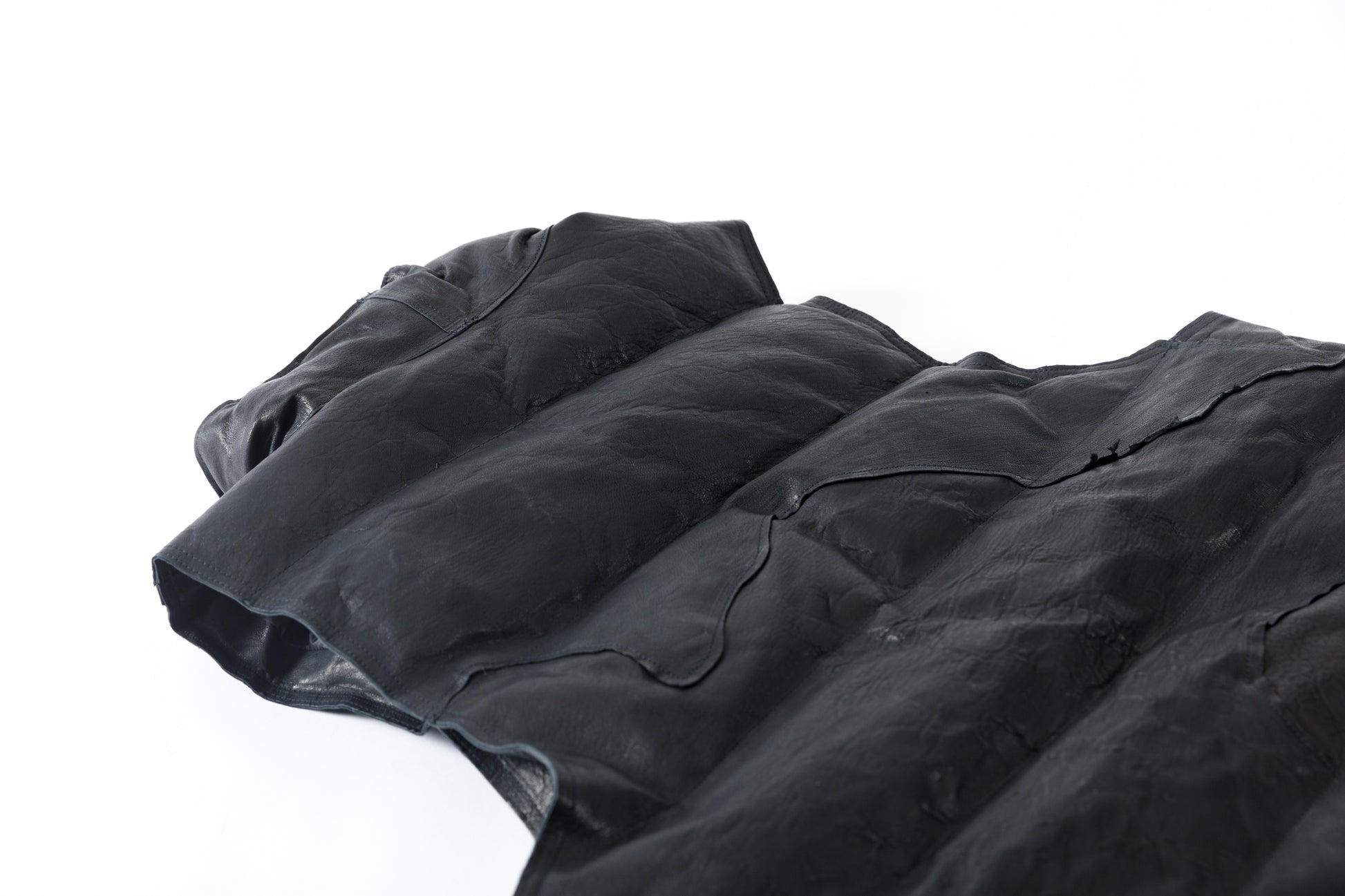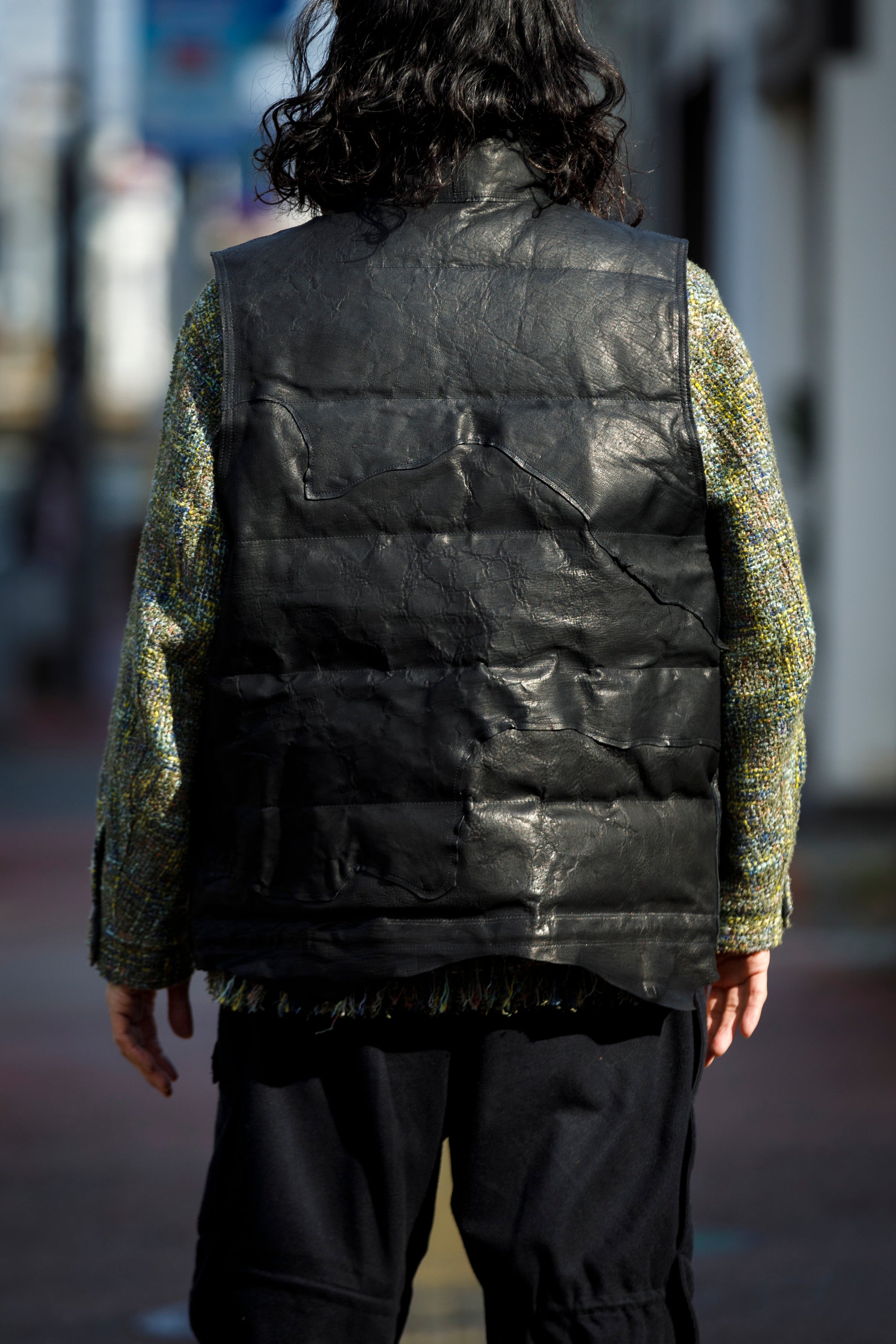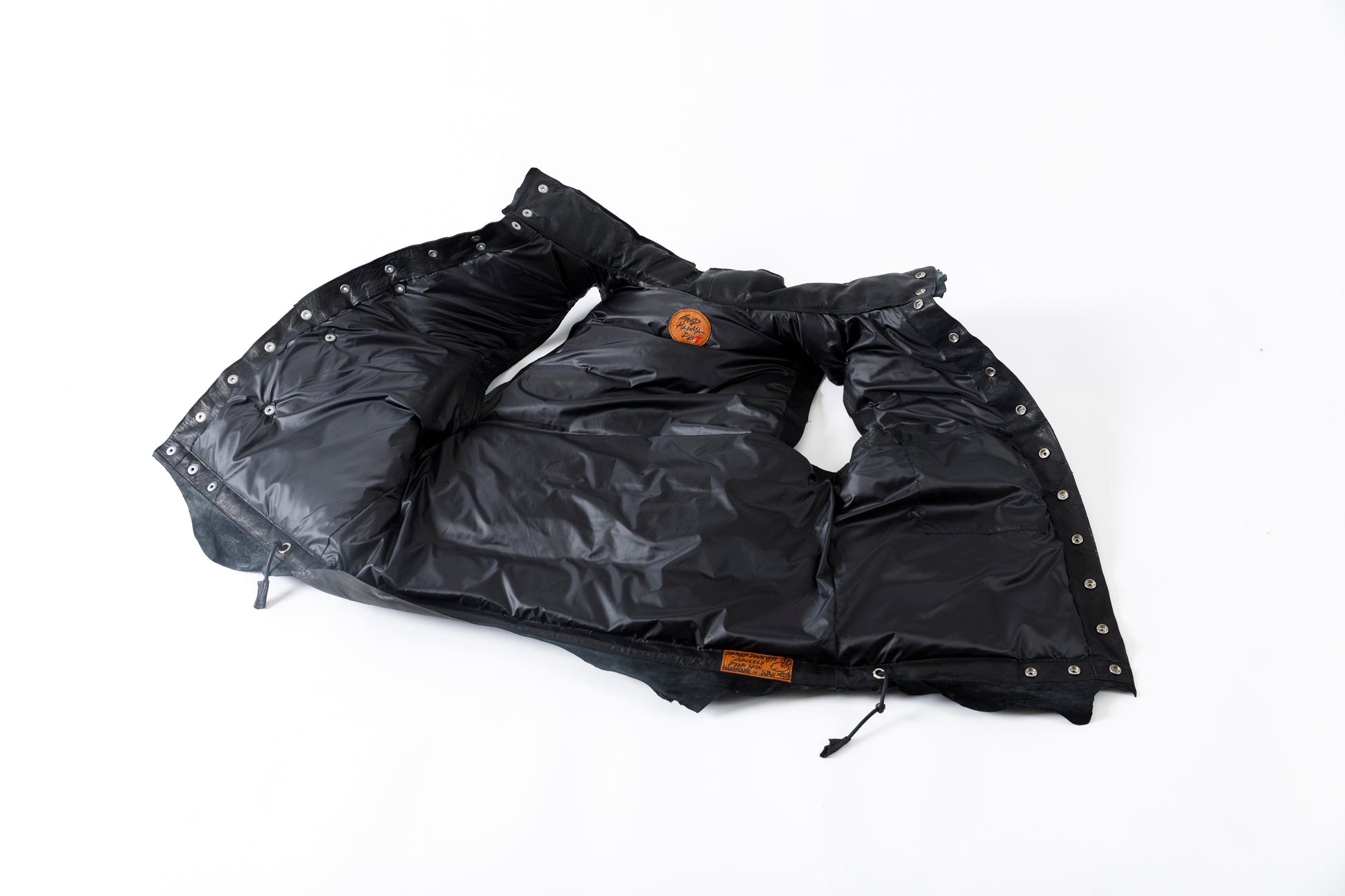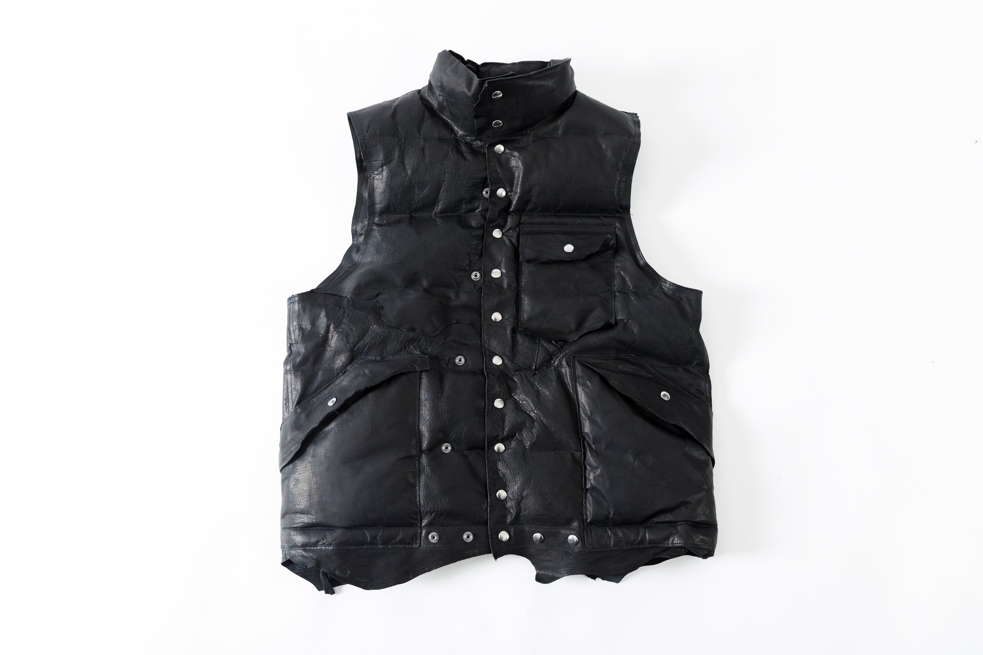 バイヤー時代に偶然入手したダウンジャケットをモチーフにナチュラルエッジをデザインとして落とし込みクラフトレザーのような雰囲気で仕上げた、LEATHER DOWN VEST"GRIZZLY" - BACK。