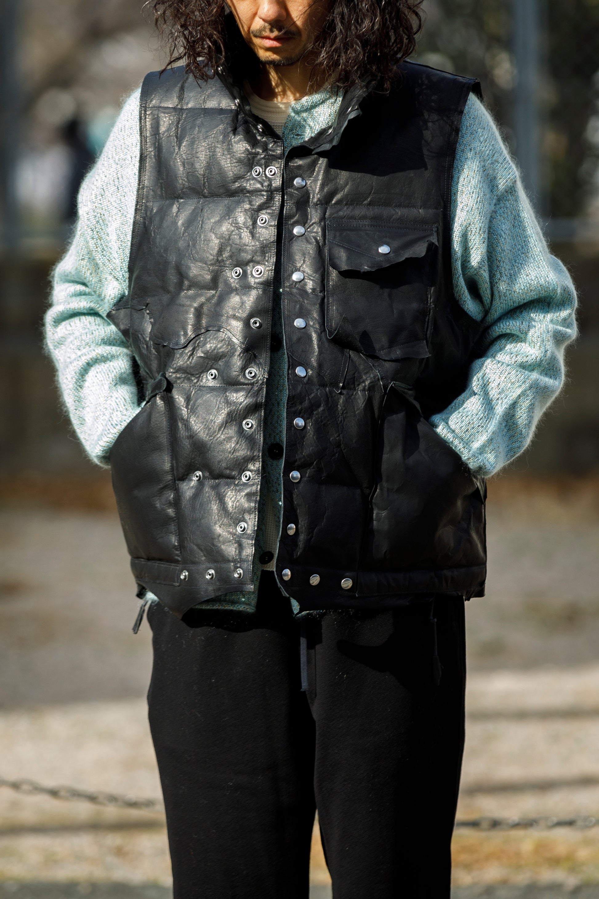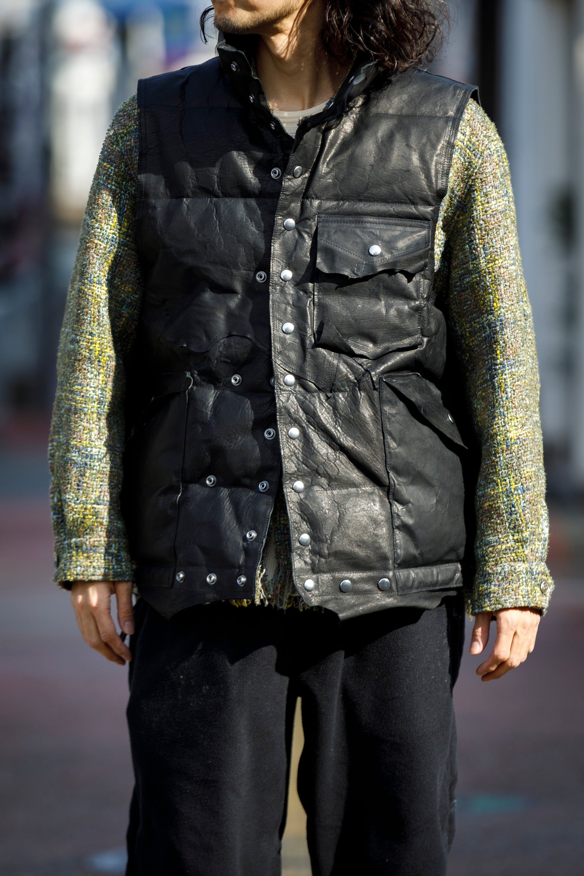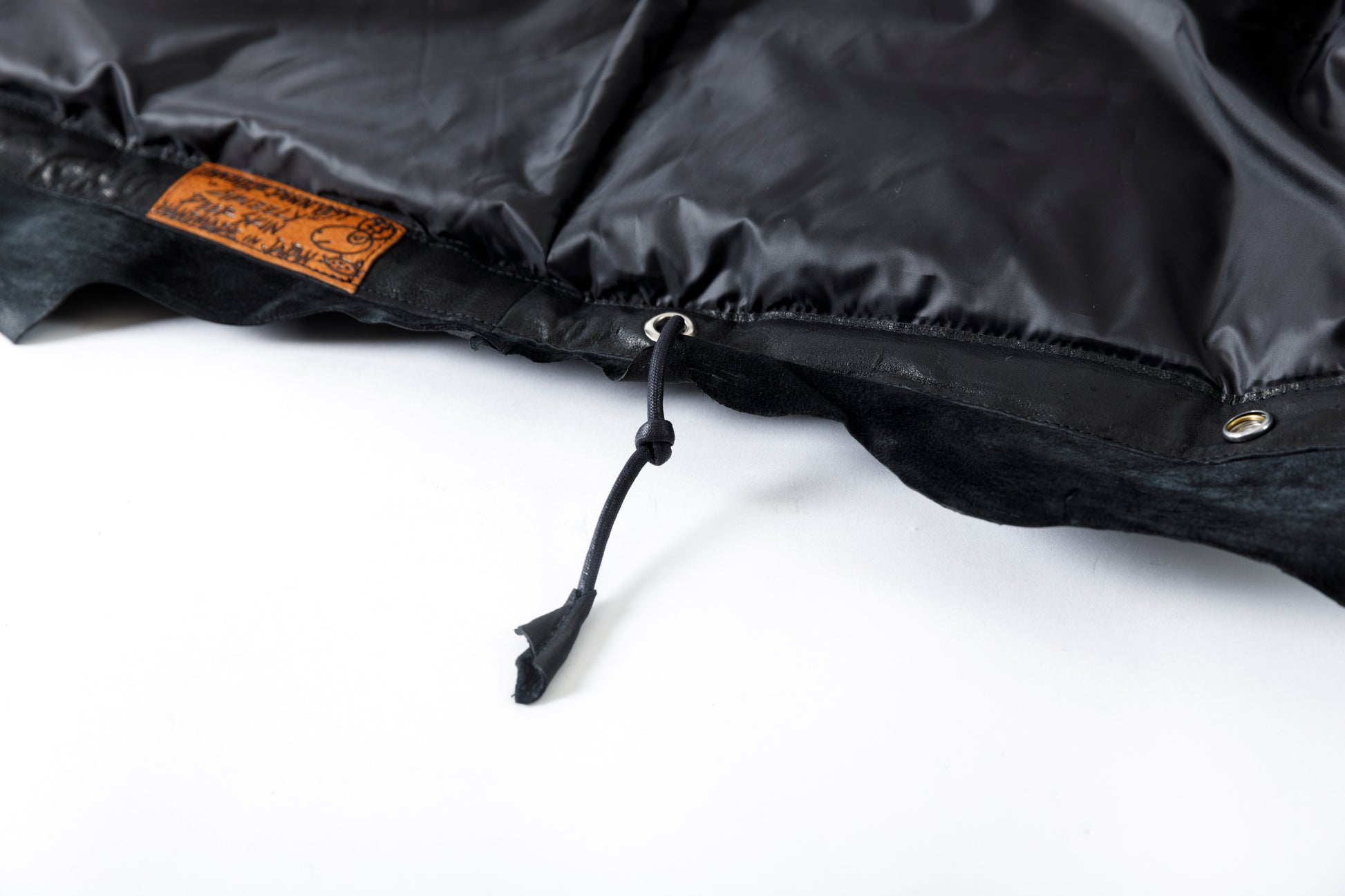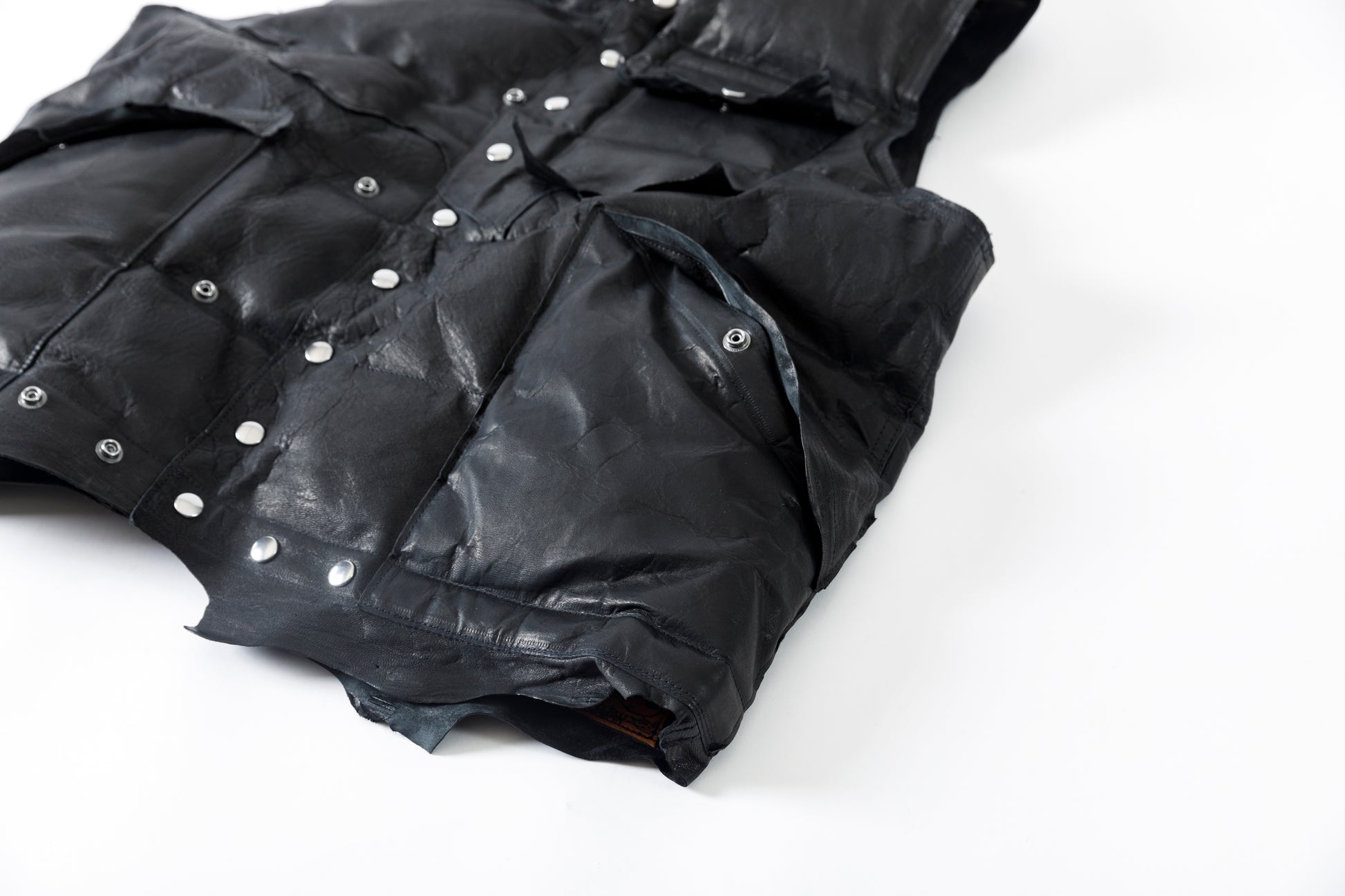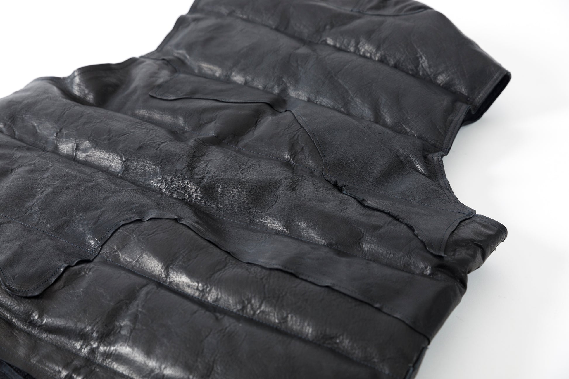 バイヤー時代に偶然入手したダウンジャケットをモチーフにナチュラルエッジをデザインとして落とし込みクラフトレザーのような雰囲気で仕上げた、LEATHER DOWN VEST"GRIZZLY" - BACK。