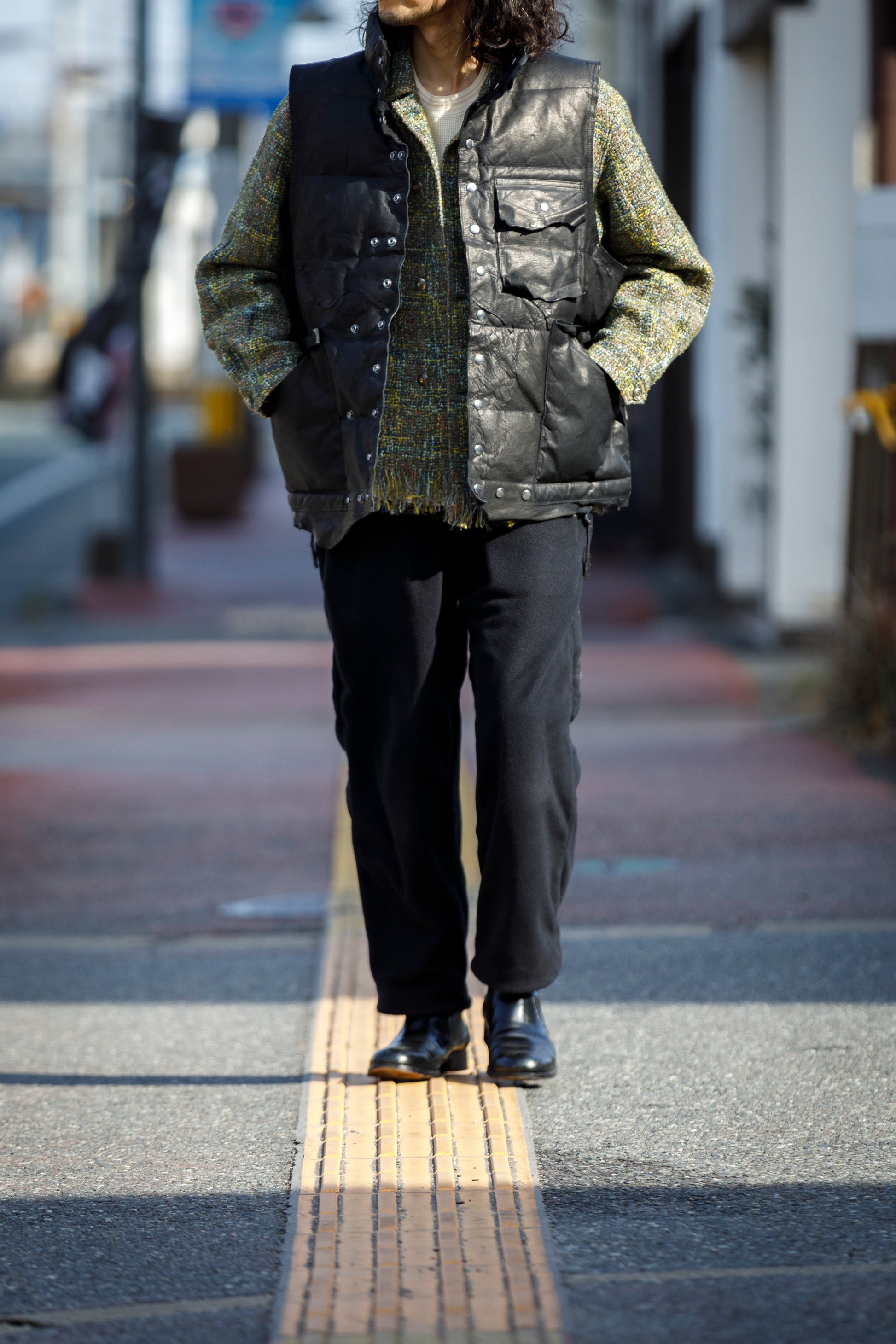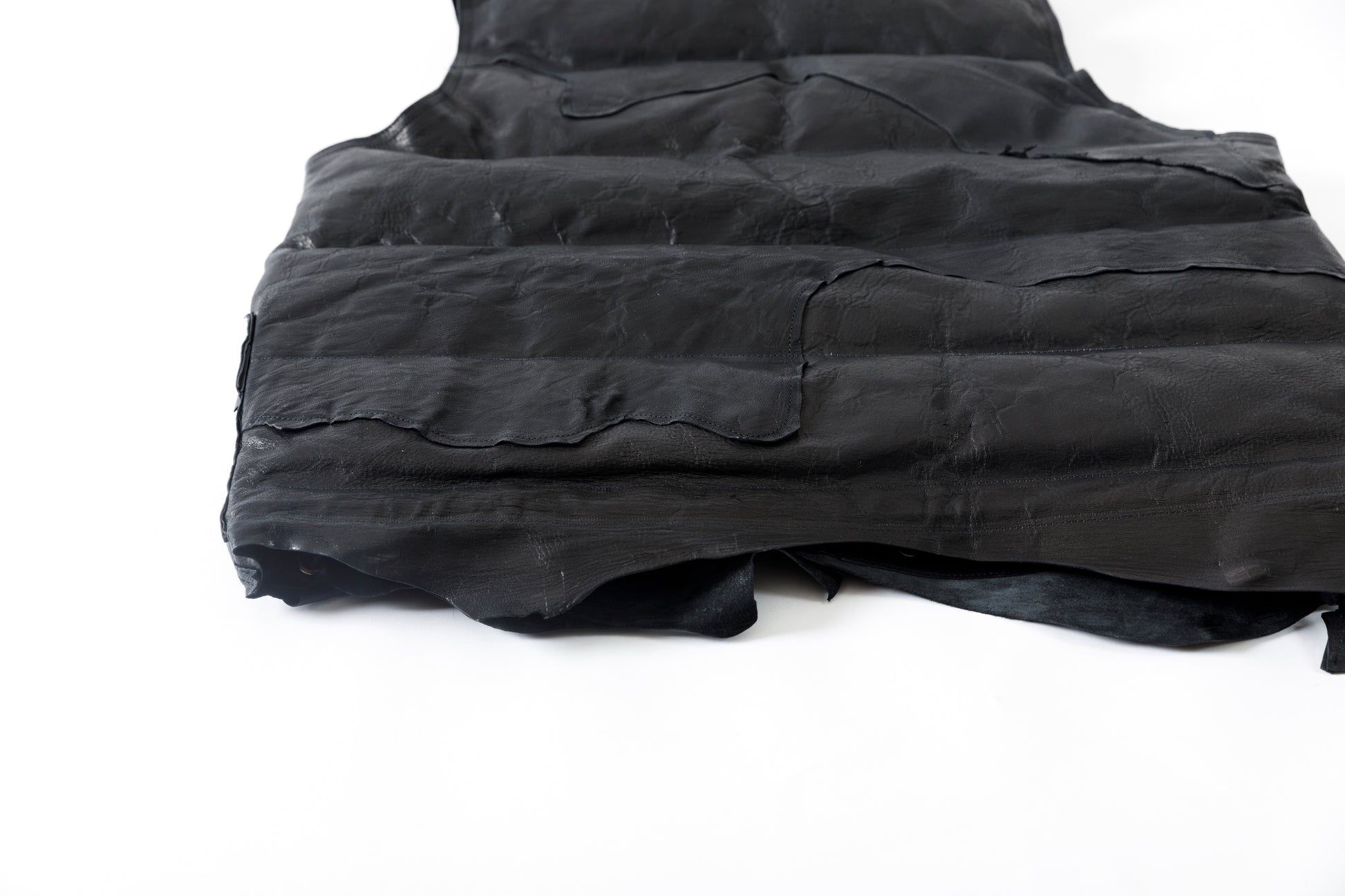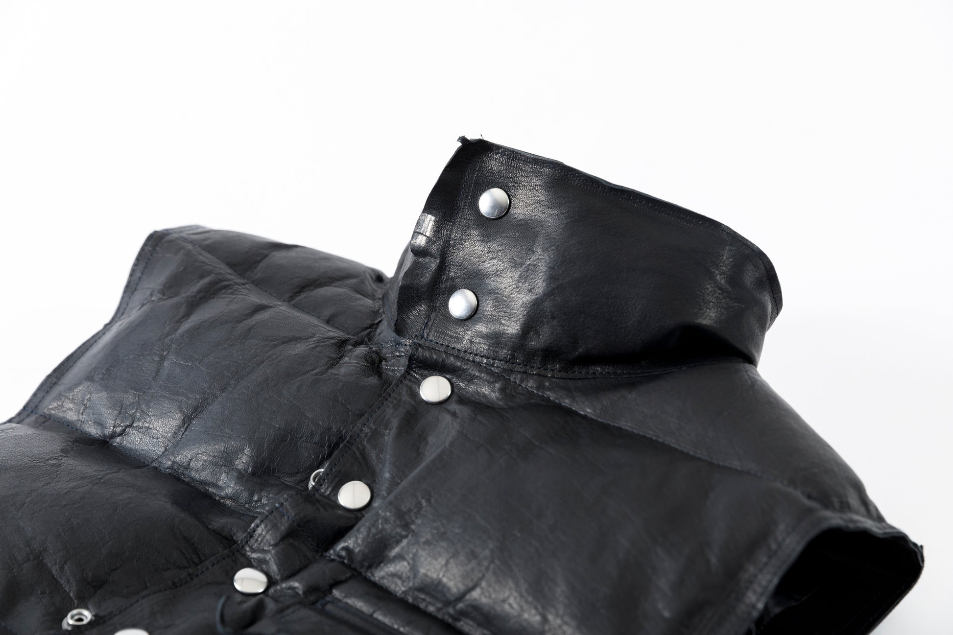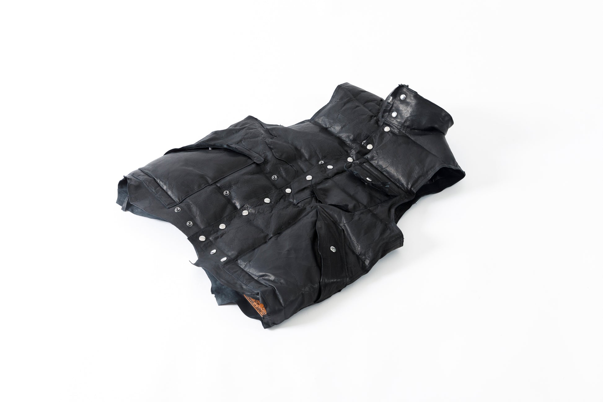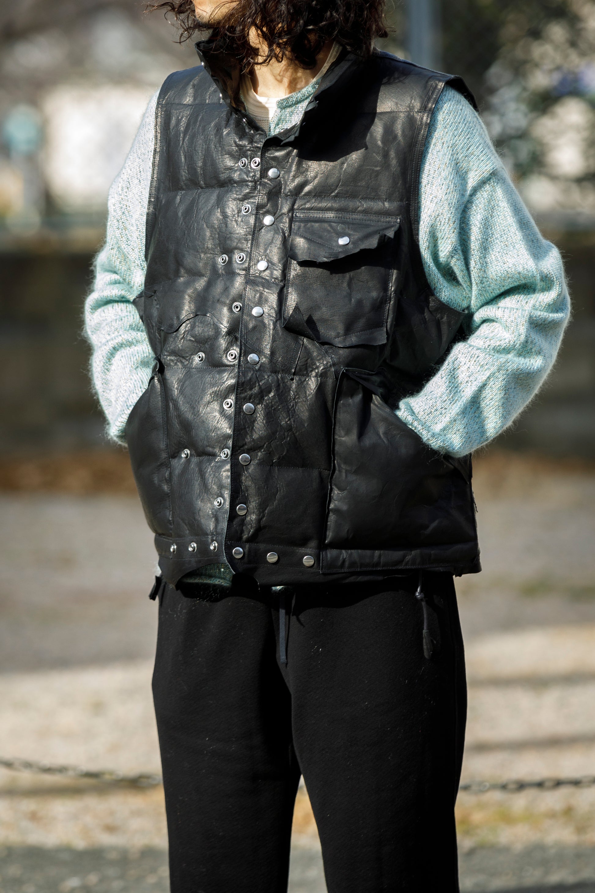 バイヤー時代に偶然入手したダウンジャケットをモチーフにナチュラルエッジをデザインとして落とし込みクラフトレザーのような雰囲気で仕上げた、LEATHER DOWN VEST"GRIZZLY" - BACK。