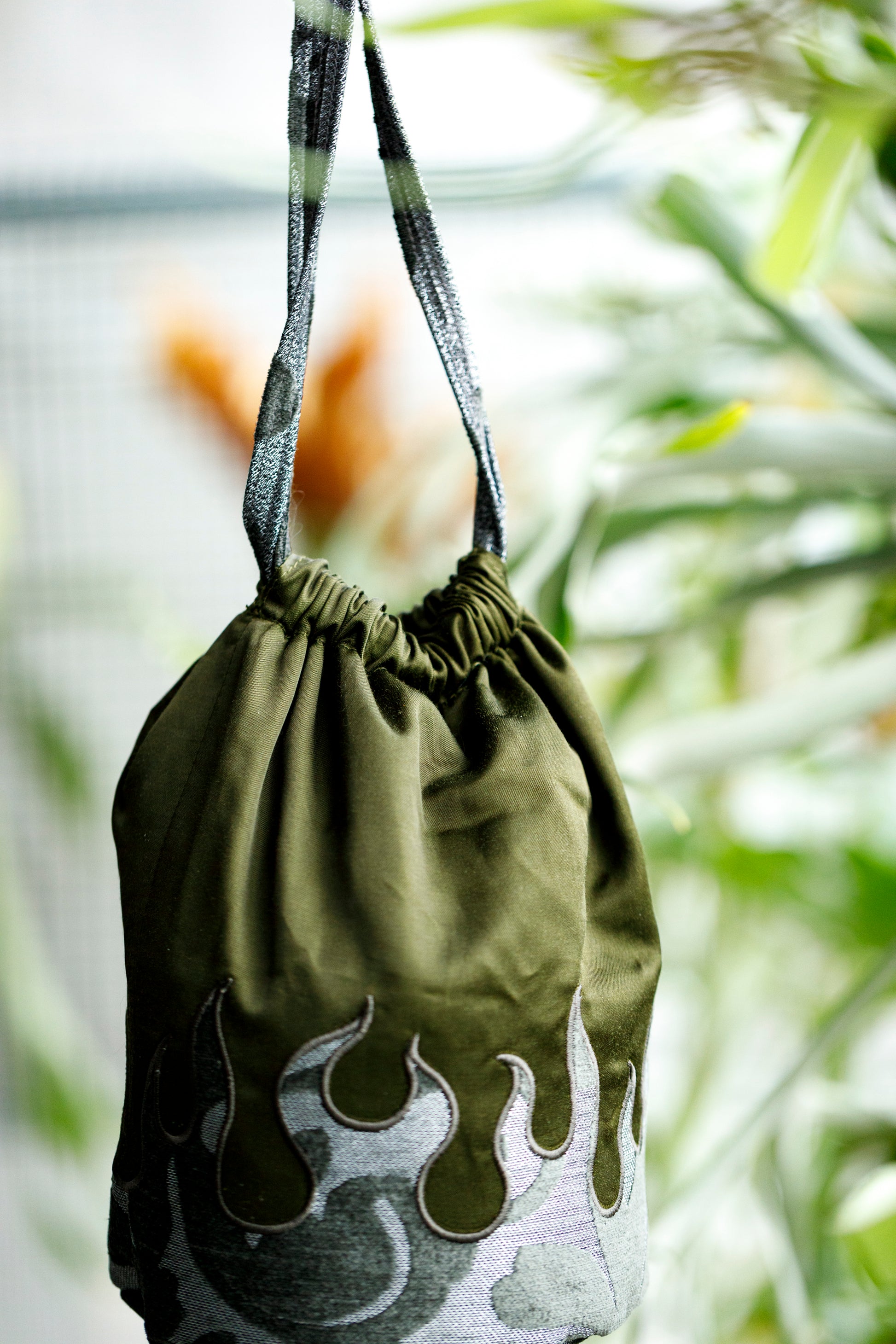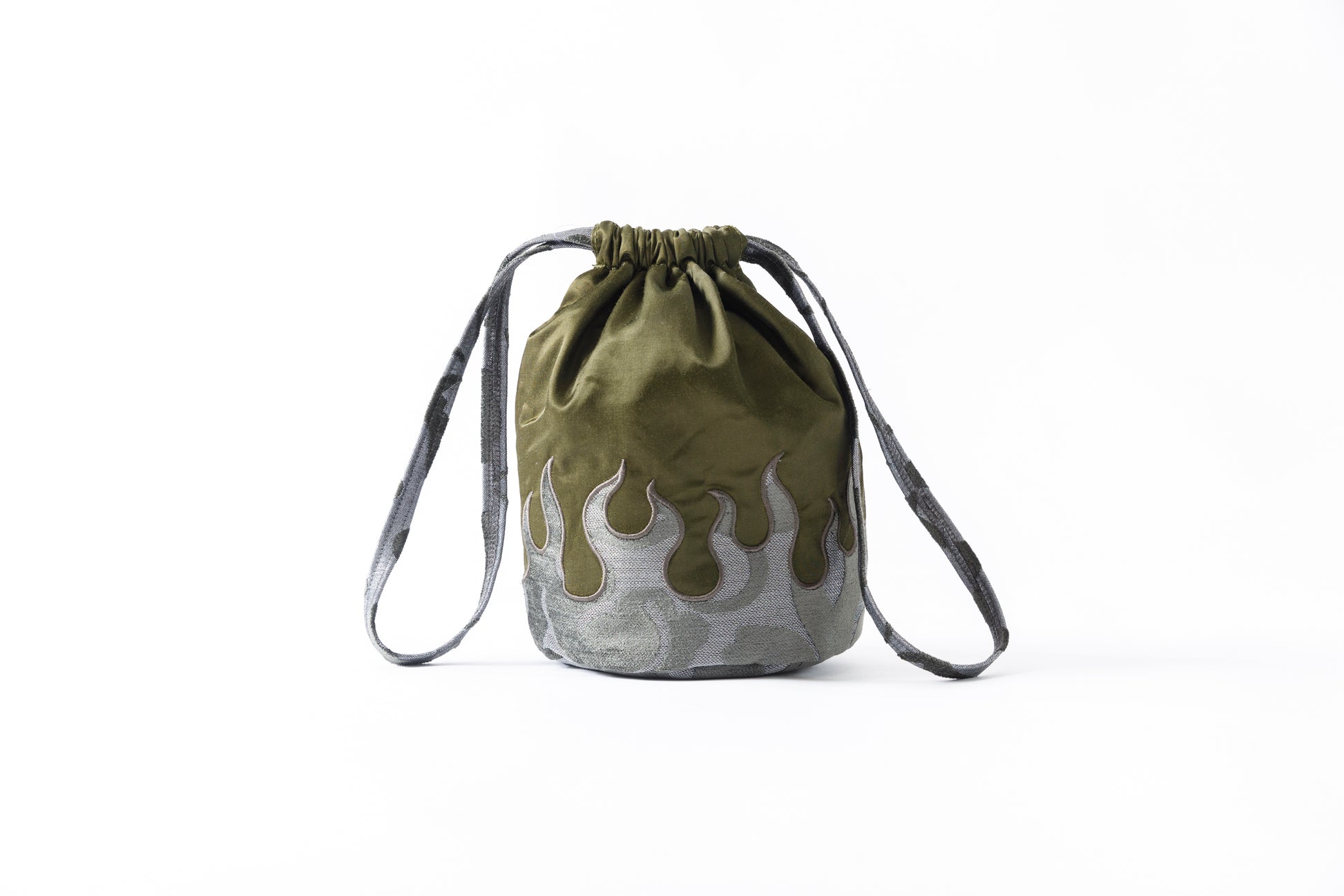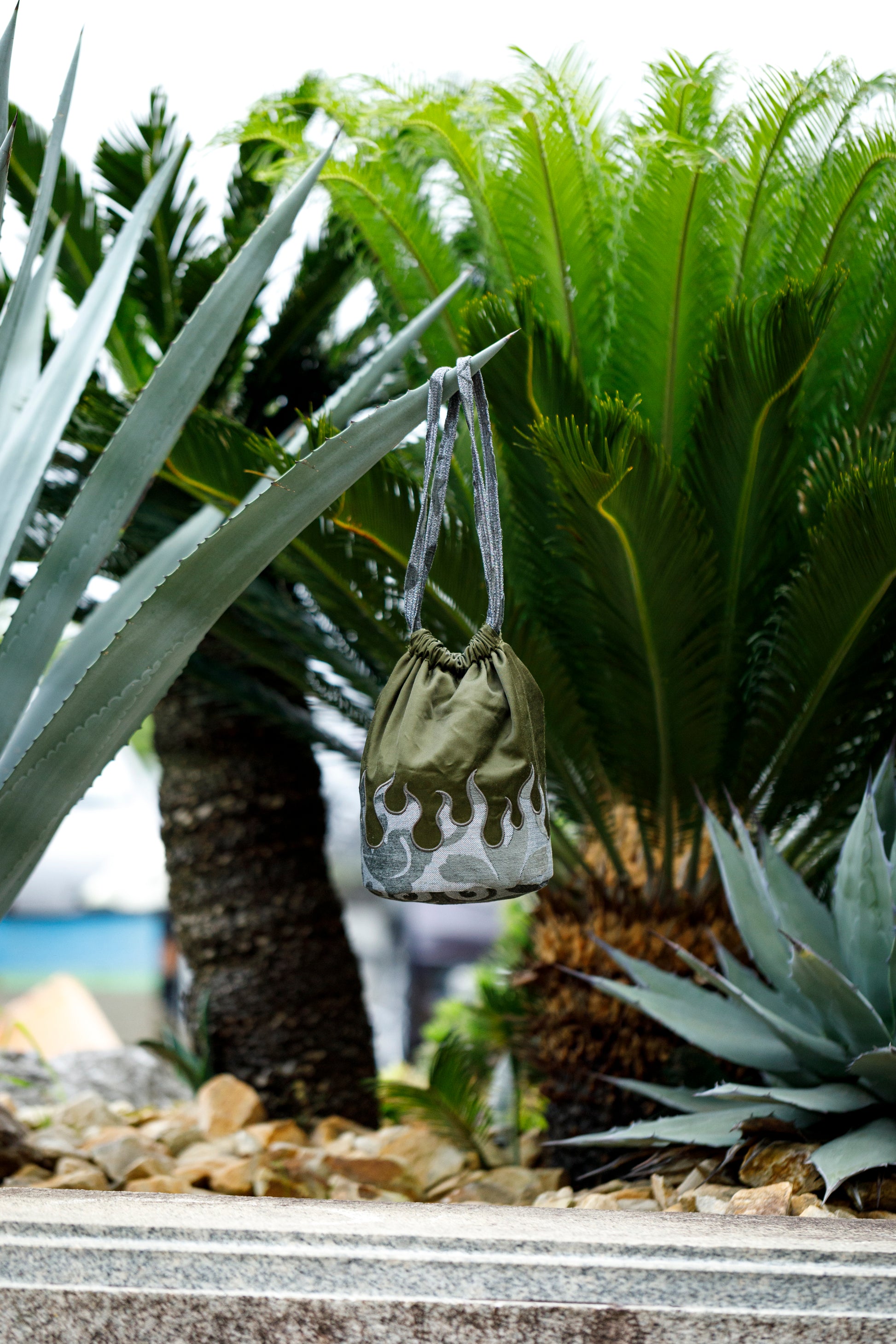 ファイヤーパターンのデザインが効いており、スタイリングのアクセントになる巾着袋です。