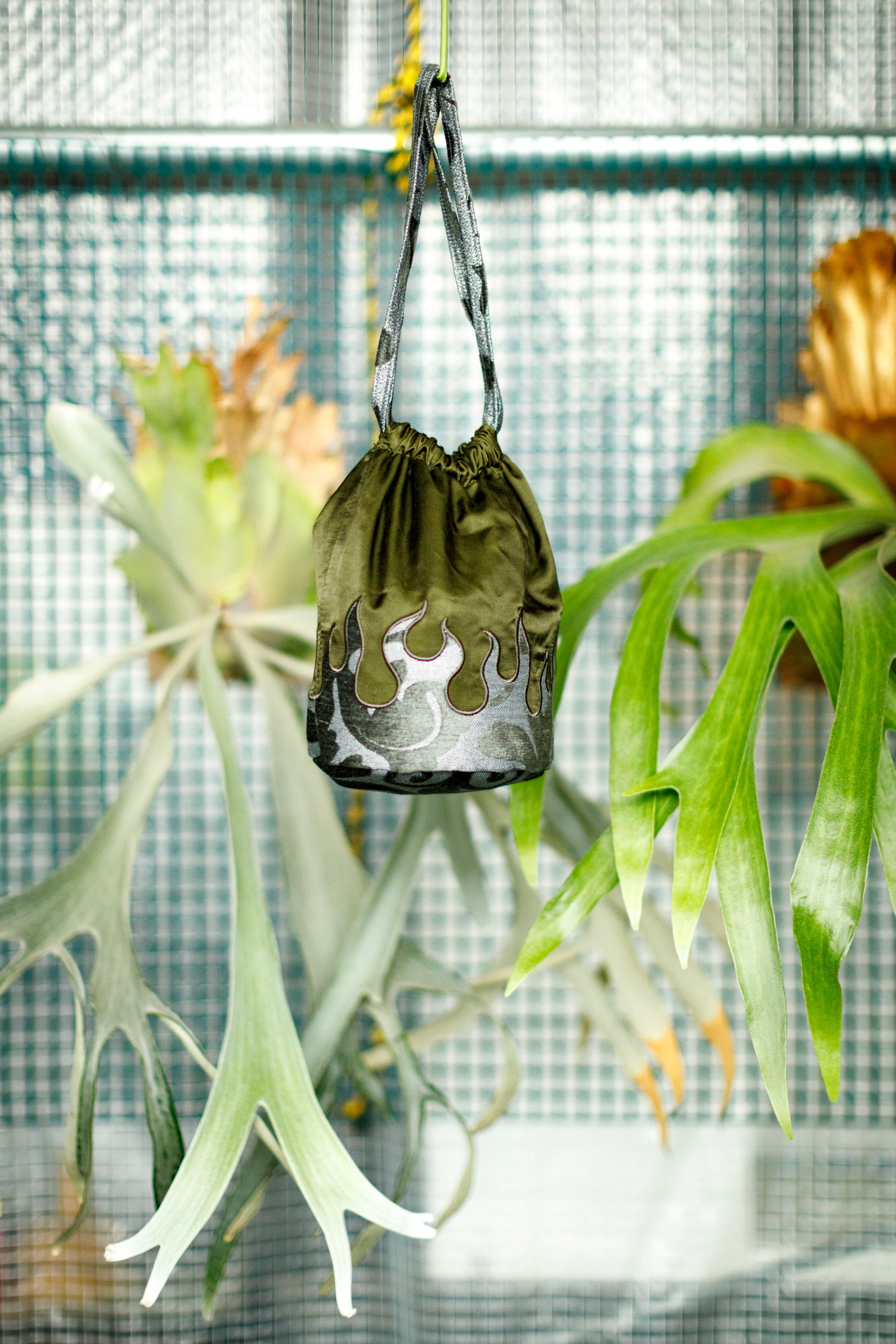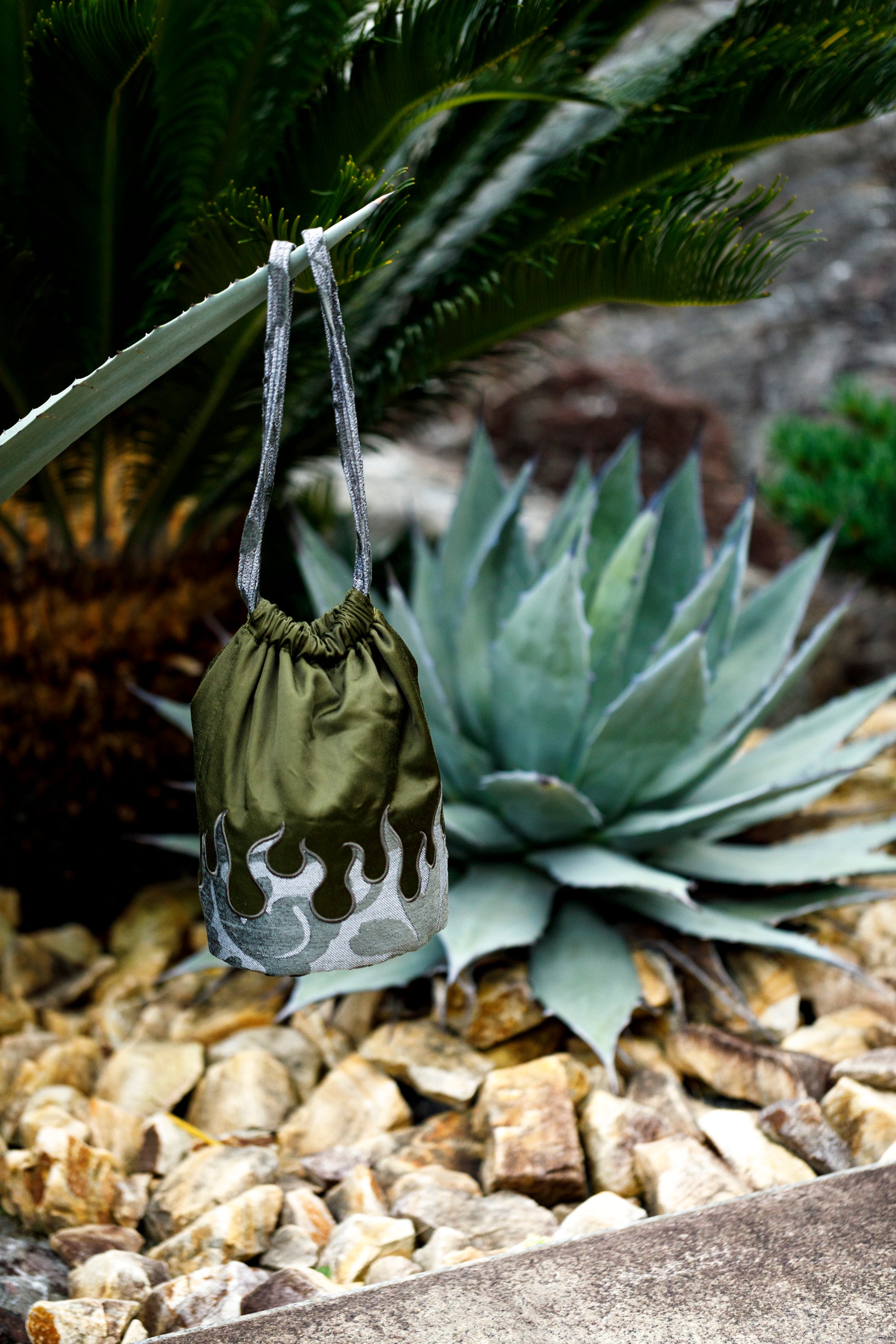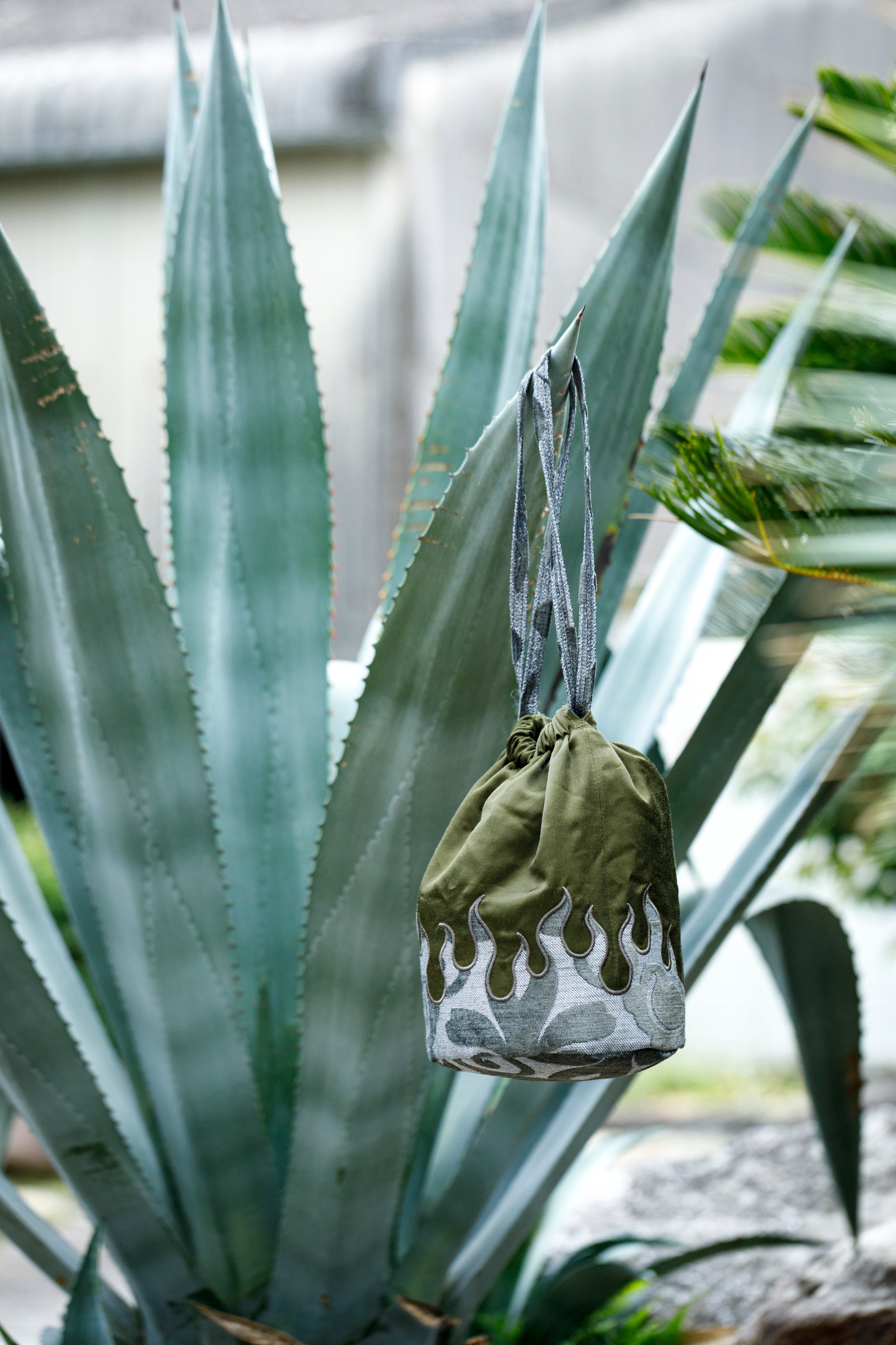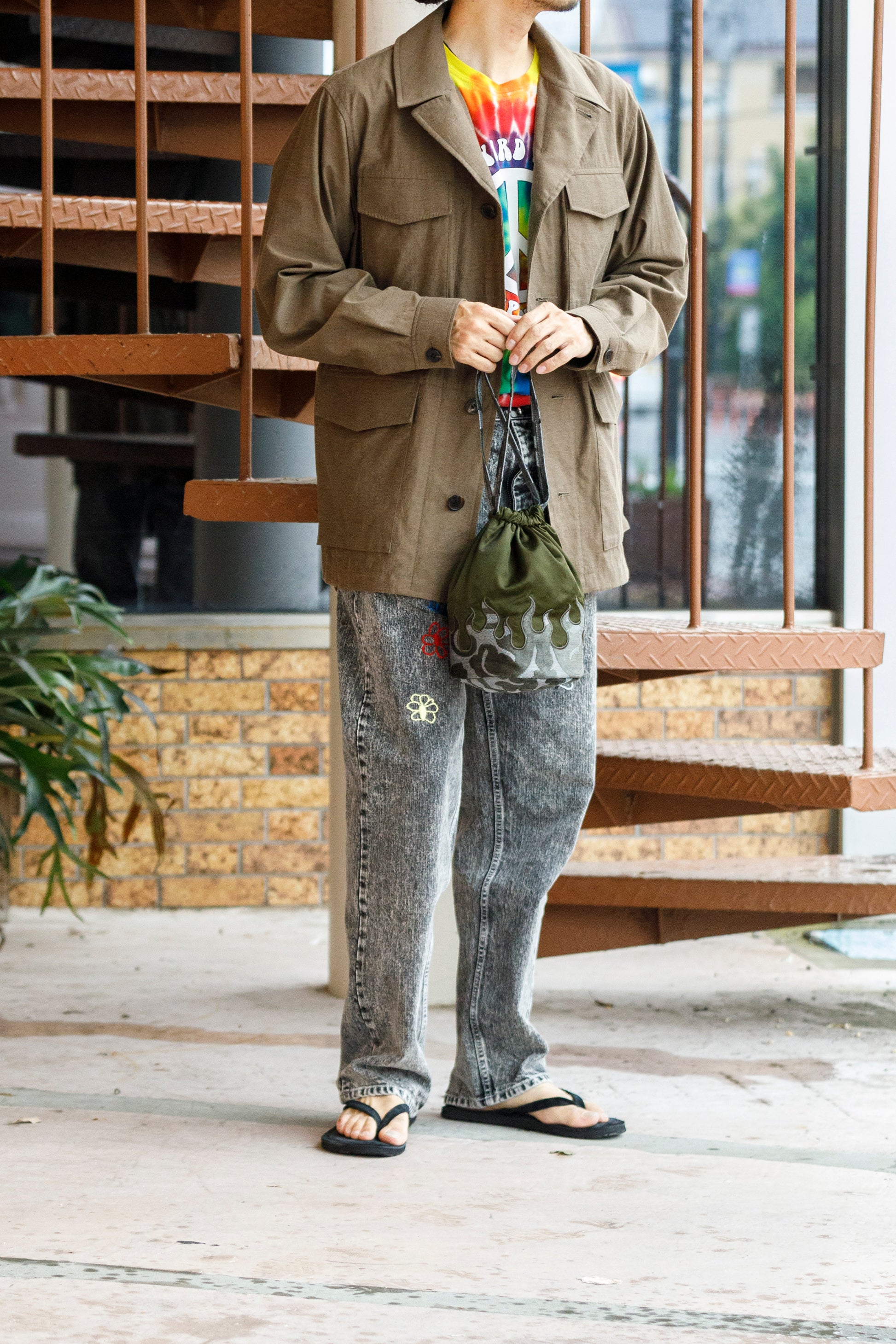 ファイヤーパターンのデザインが効いており、スタイリングのアクセントになる巾着袋です。