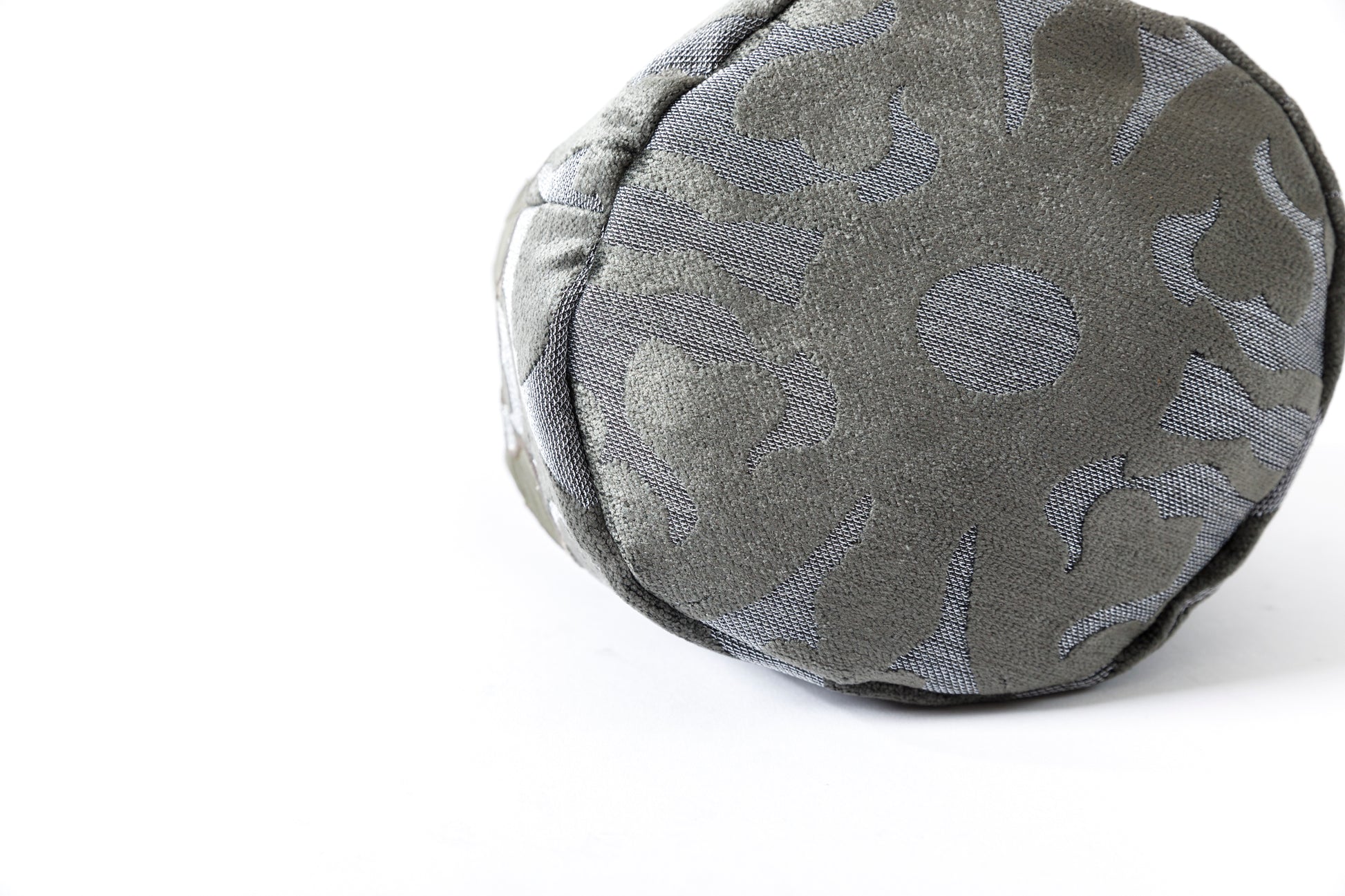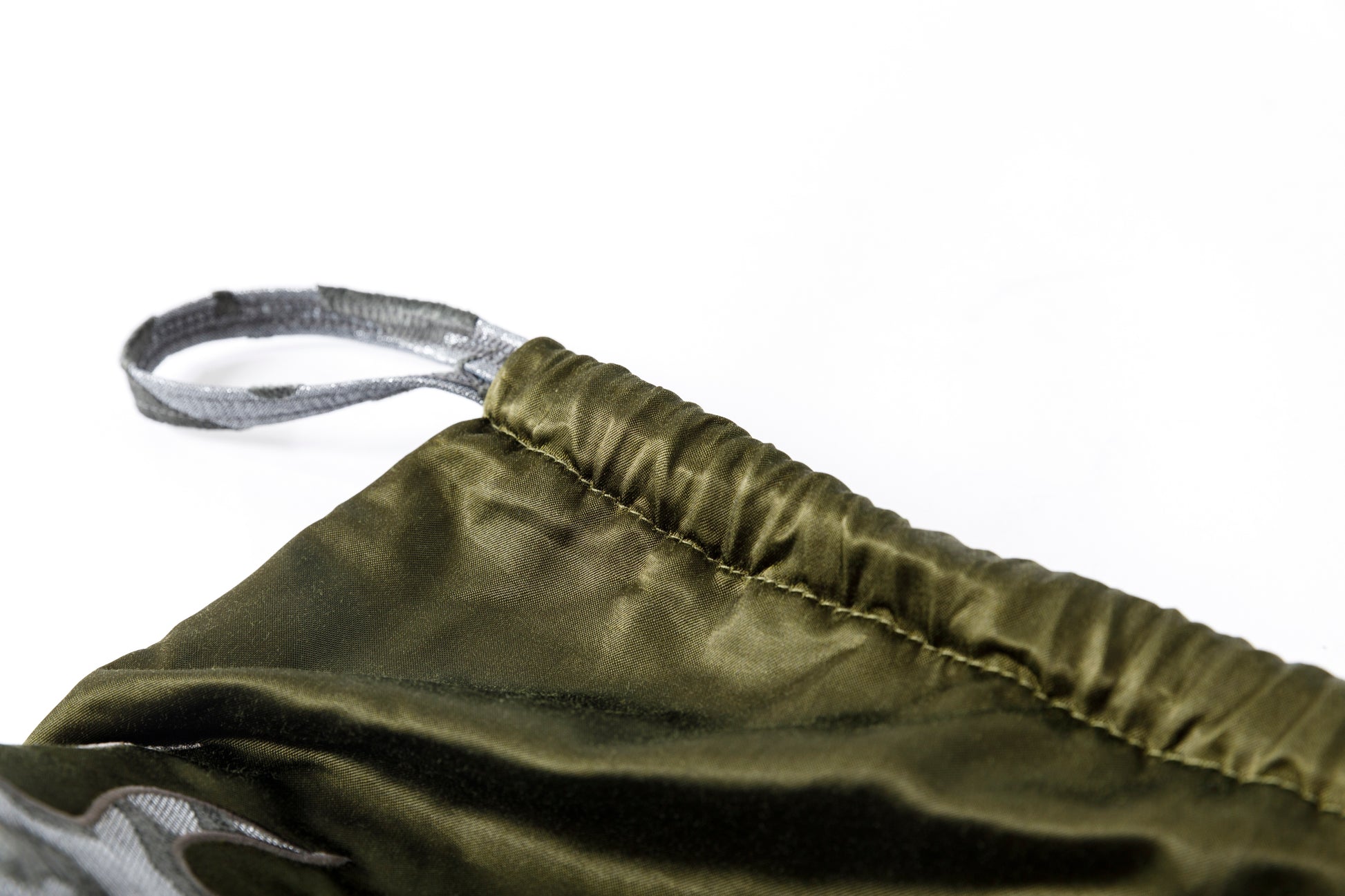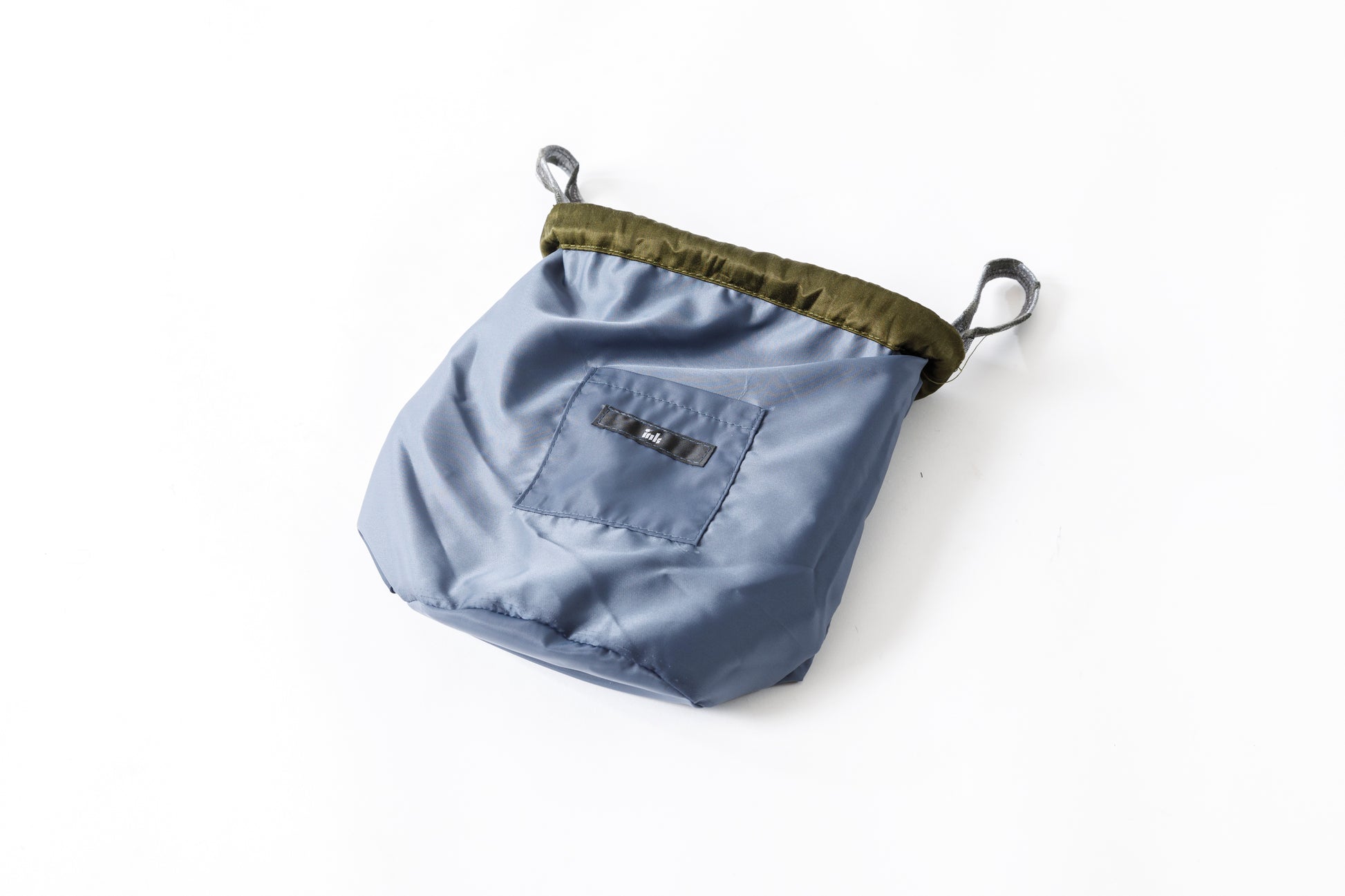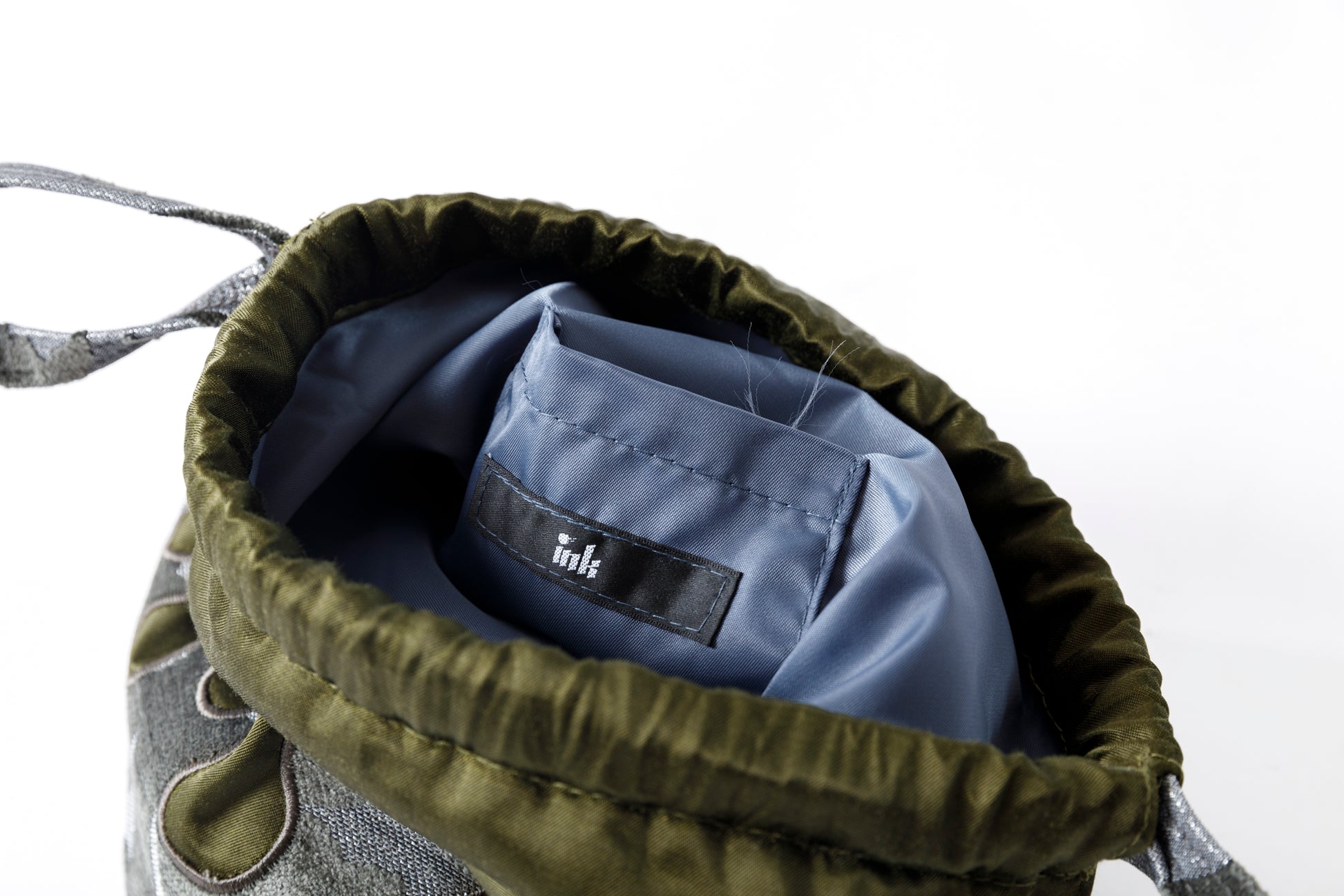 ボディには程よい光沢感を備えたオーリーブのサテン地に、内側はサイドポケットを配し、表同様グレーがかったブルーのサテン地を使用。