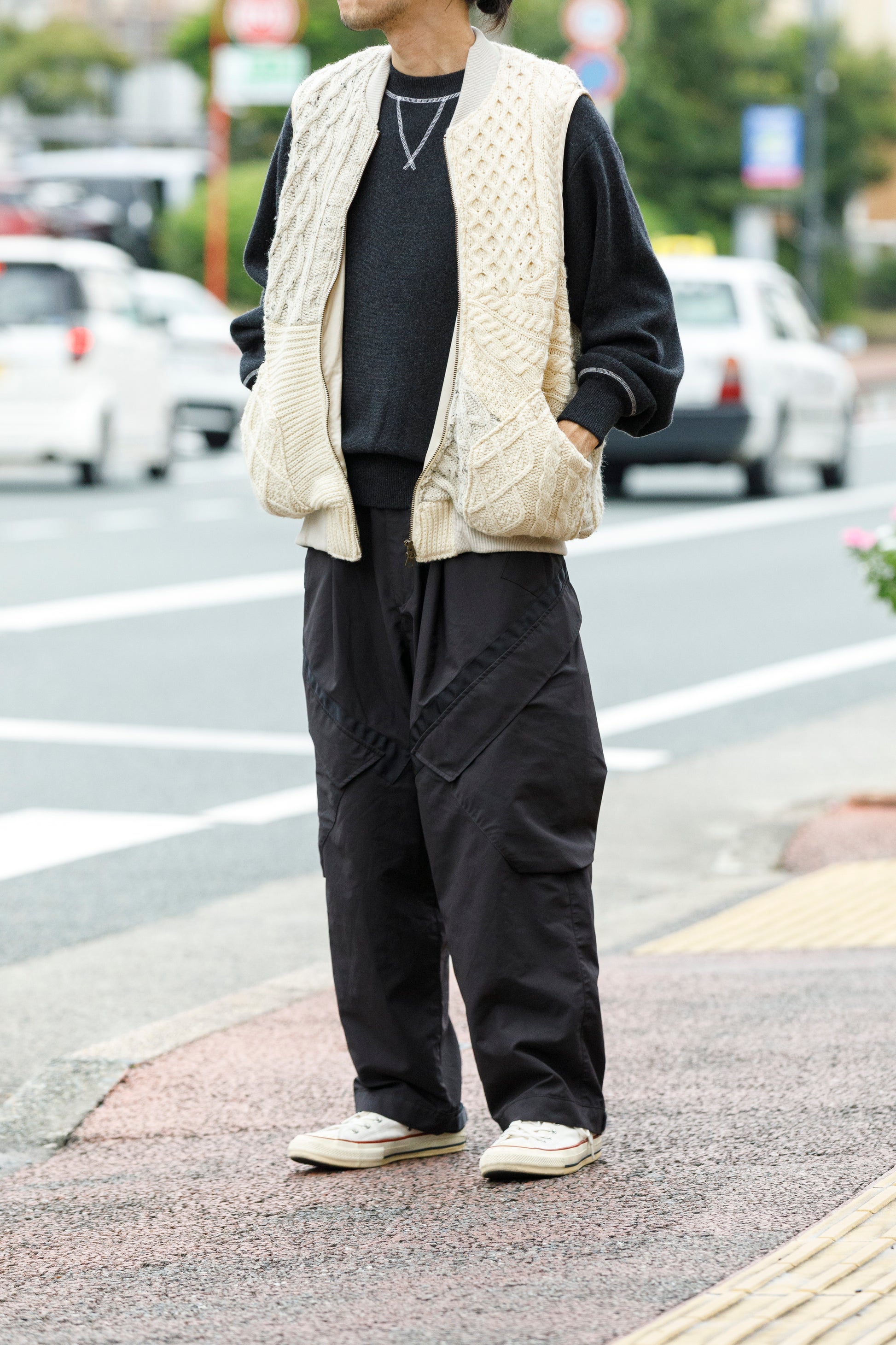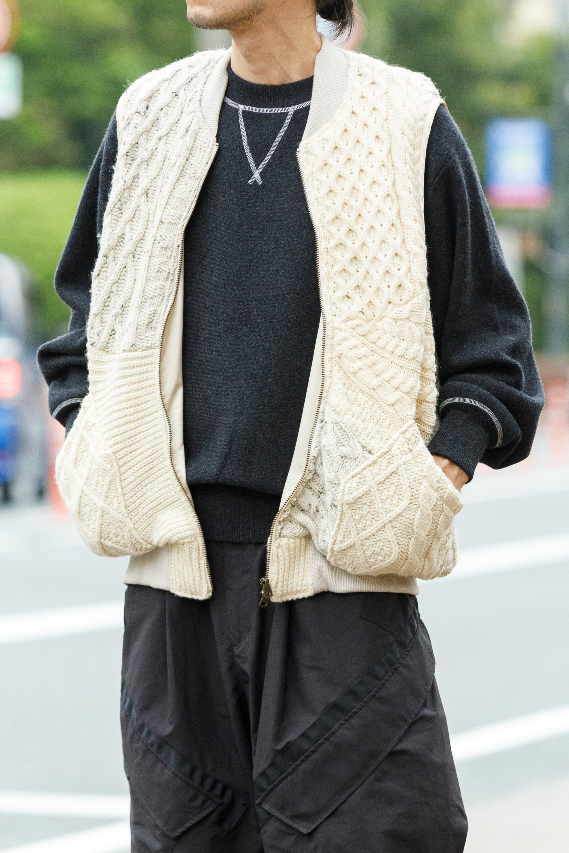 いい素材のニットももちろんオススメですが、古着のフィッシャーマンニットならではの温もりのある表情を体感でき、使いやすいベスト型に再構築されることで、ファッション的にもより幅を広げてお楽しみいただける1着ではないでしょうか。