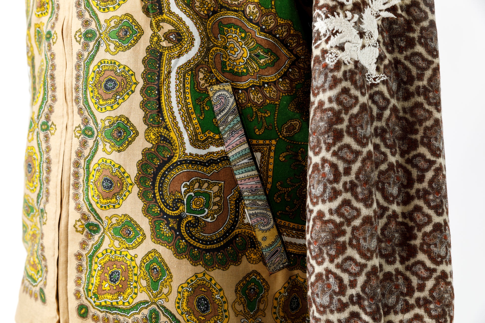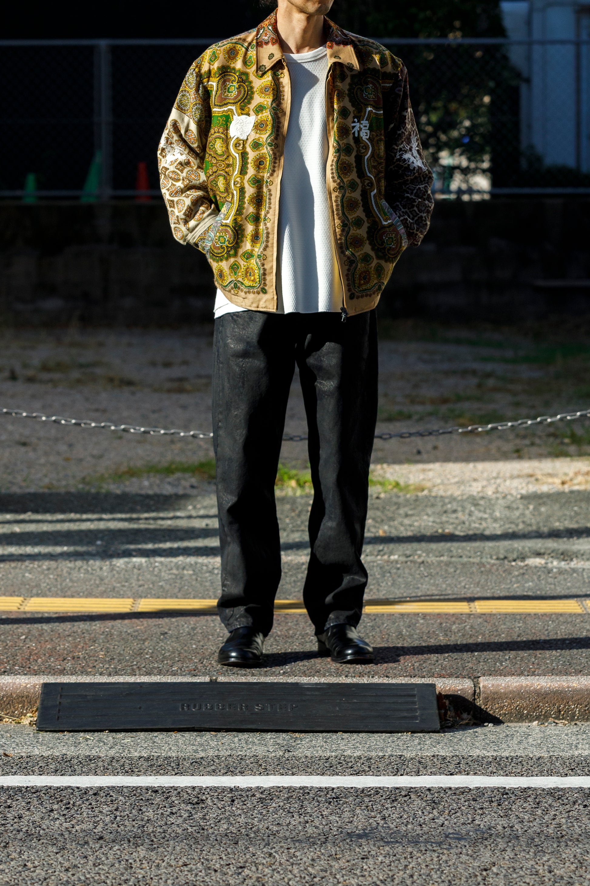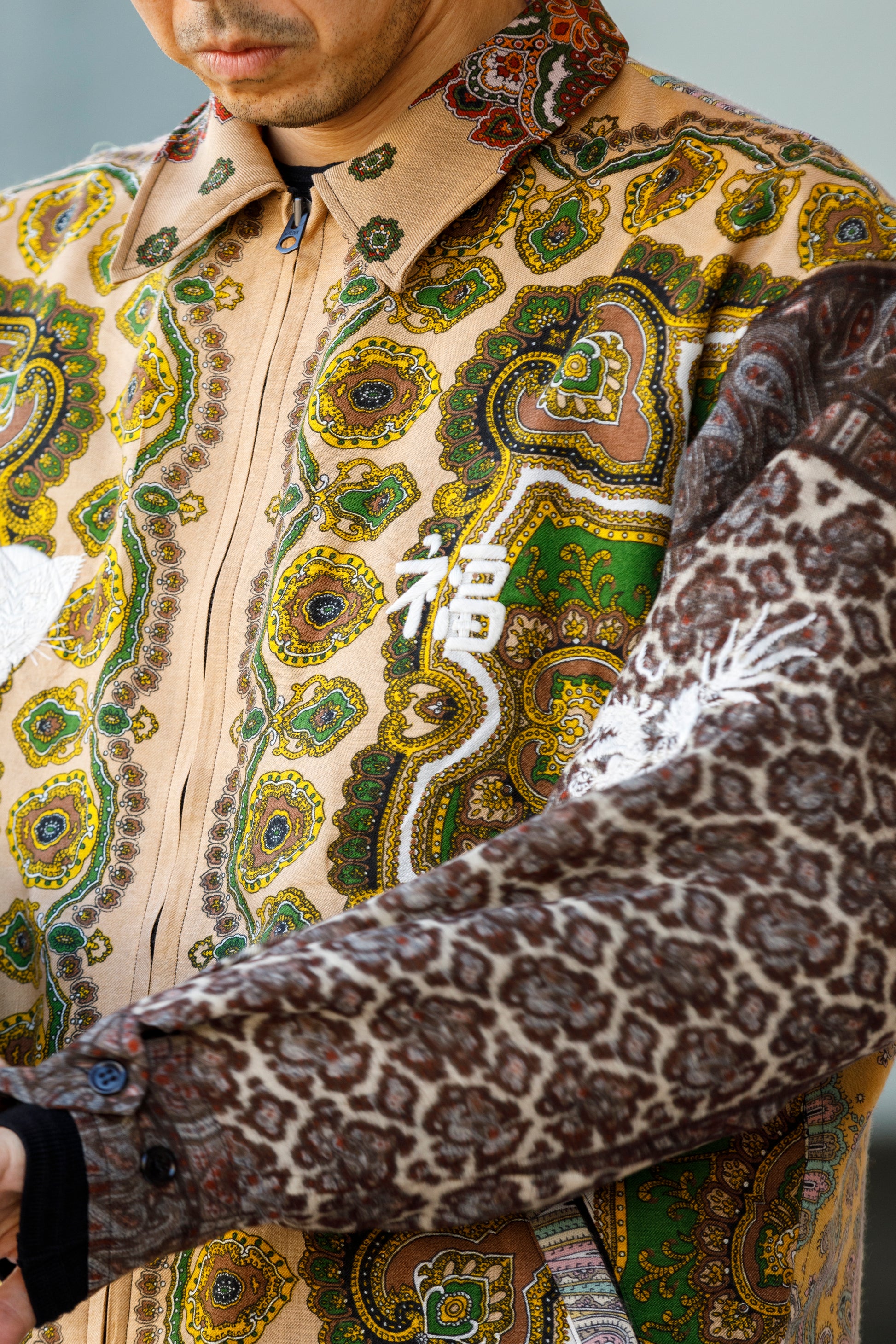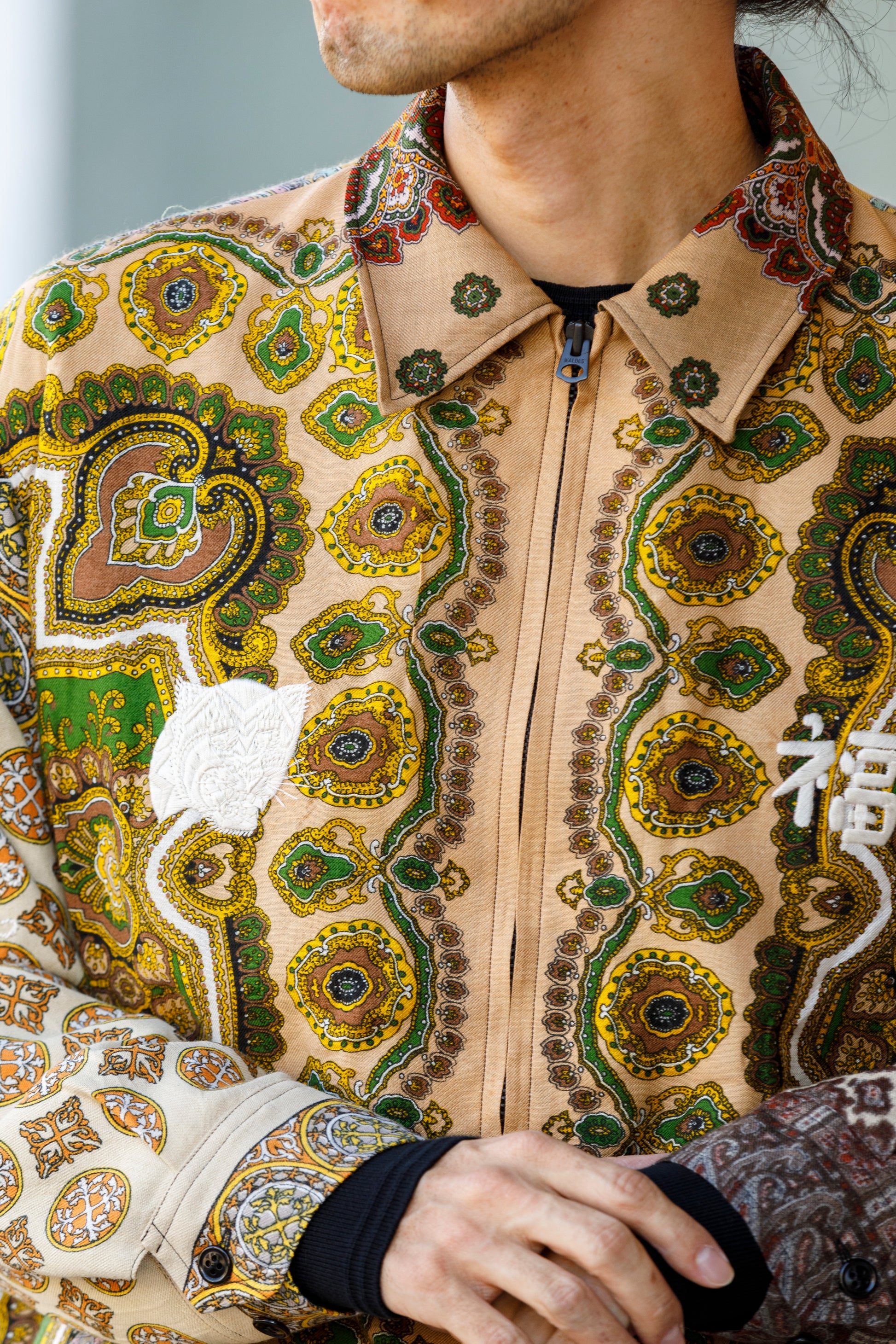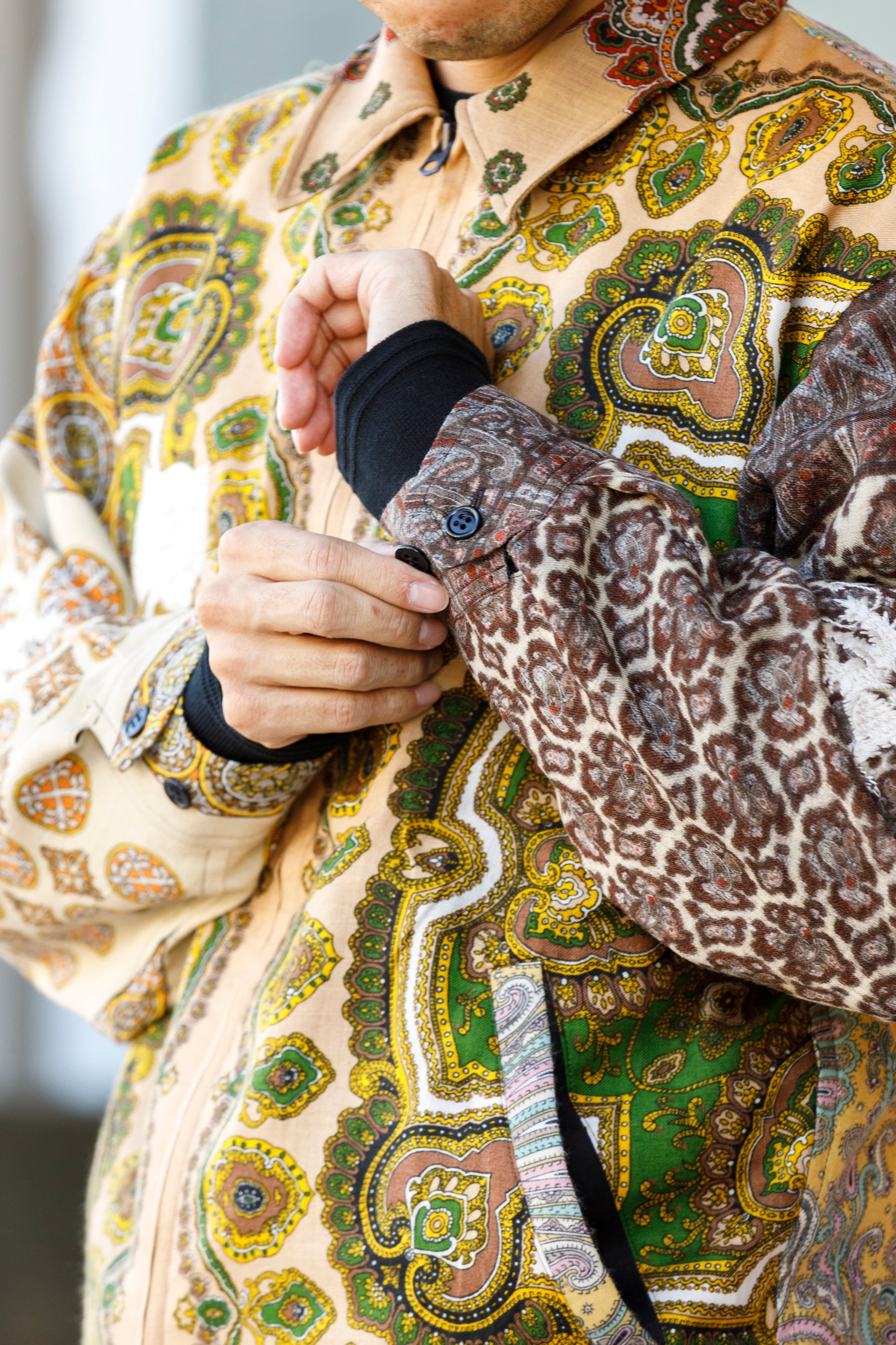生地の落ち感もあり軽くサラッとした着心地で、ペイズリーや幾何学模様のような存在感のある柄です。