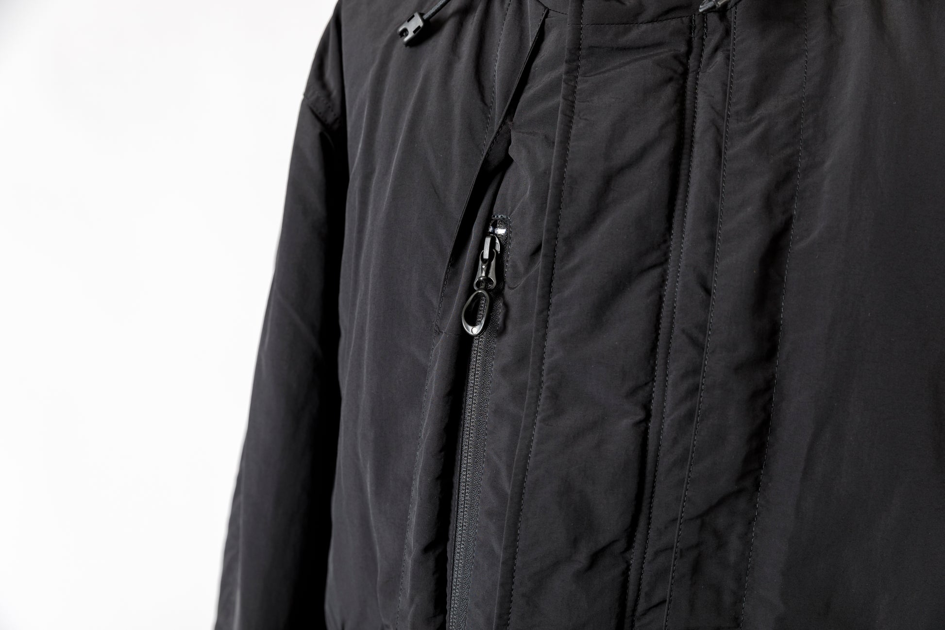 軍用バンジーコードを用いたフードはダーツと細かなパーツ割で構成され、視界を邪魔することなく防寒性が高められた形状です。