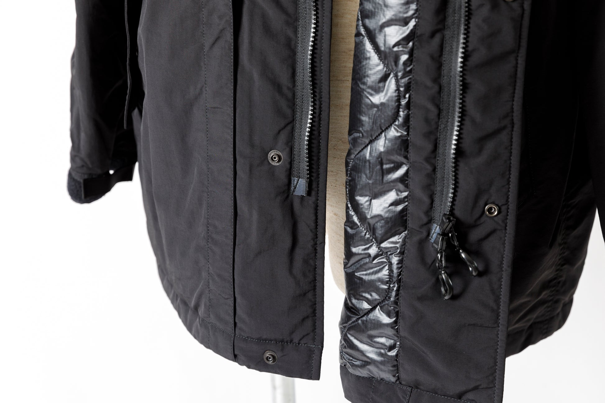 フロントはダブルジッパーとスナップボタンの仕様。