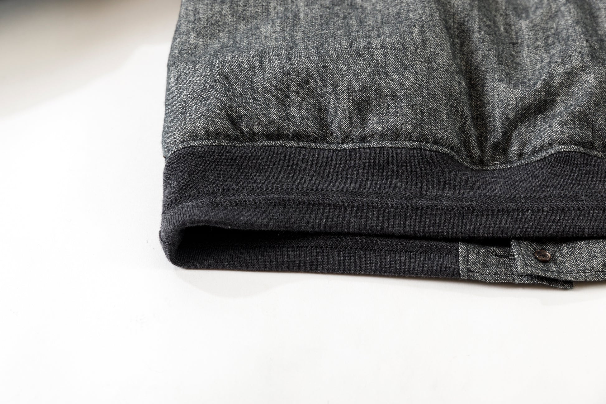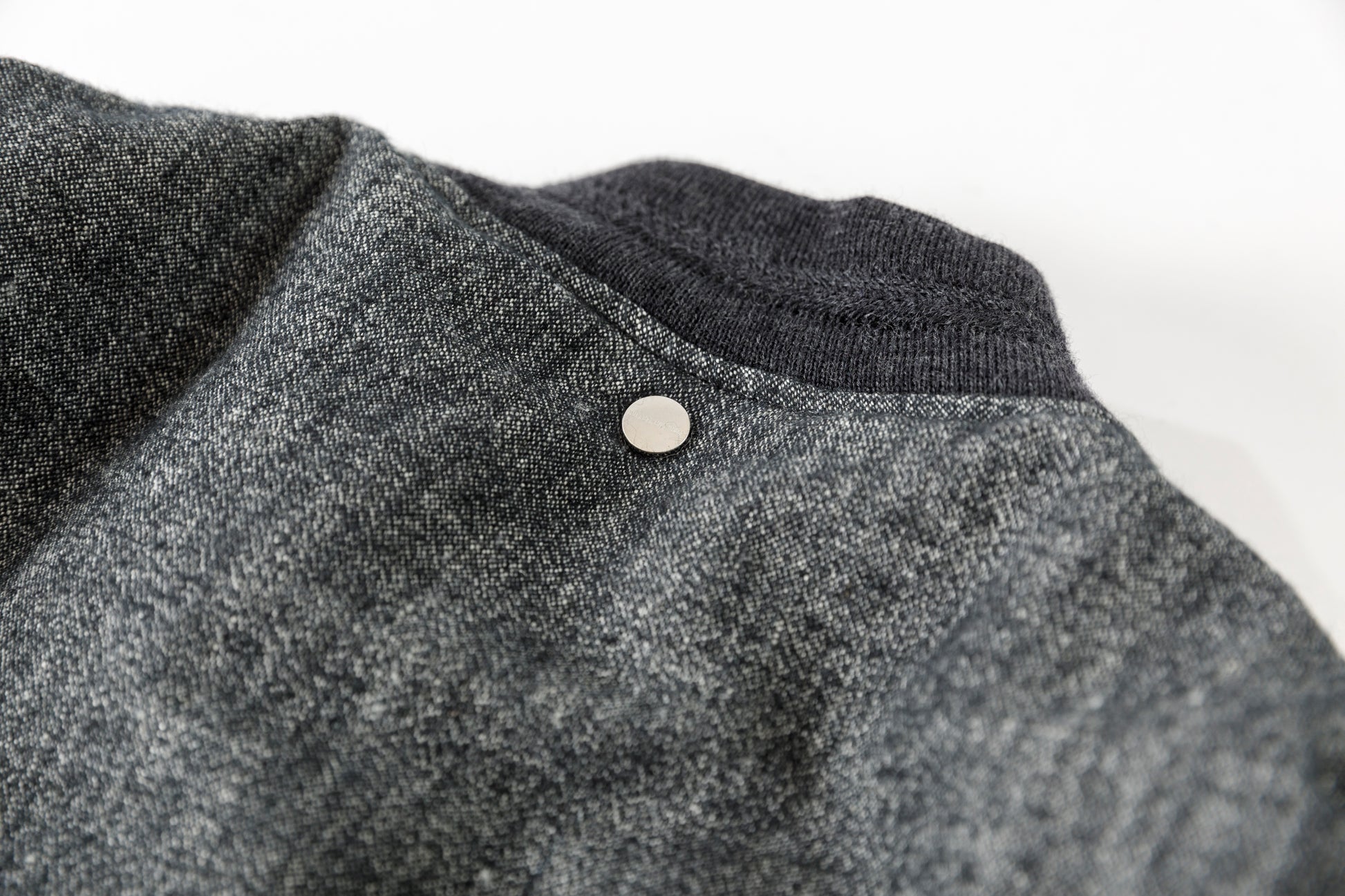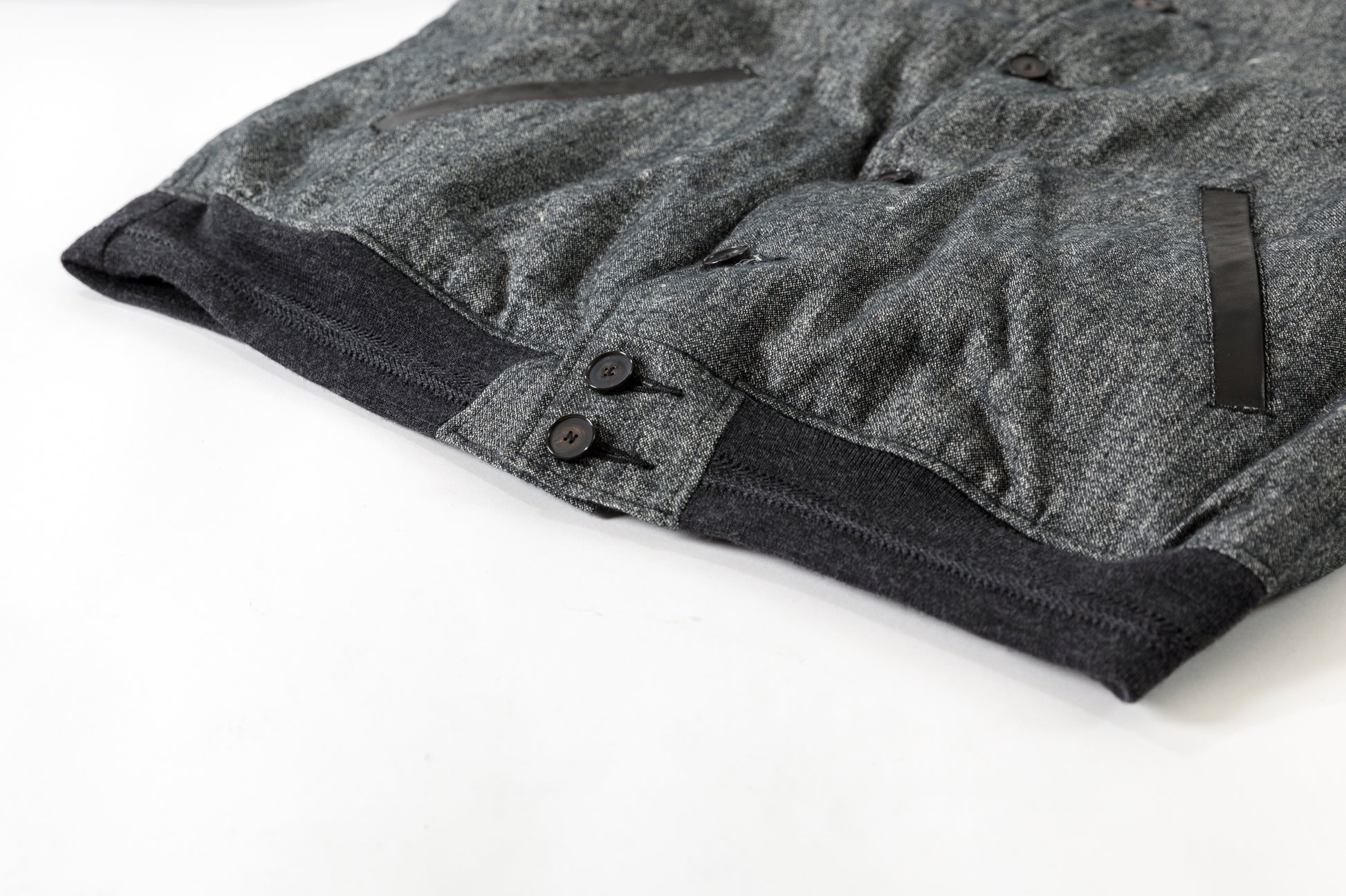 襟元、袖、裾のリブは伸縮性のあるウールが採用され、編み地による切り替えデザインが施されております。