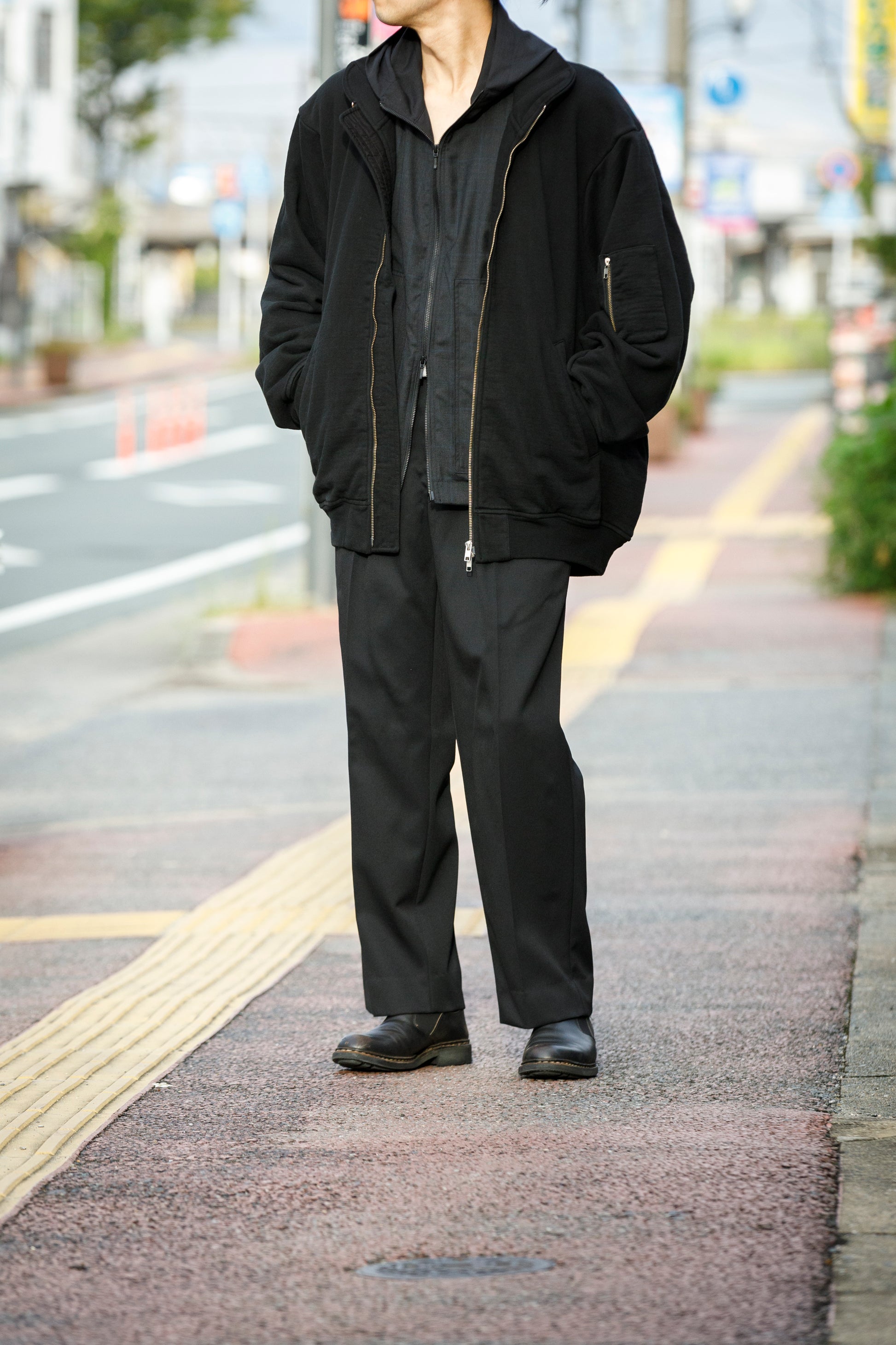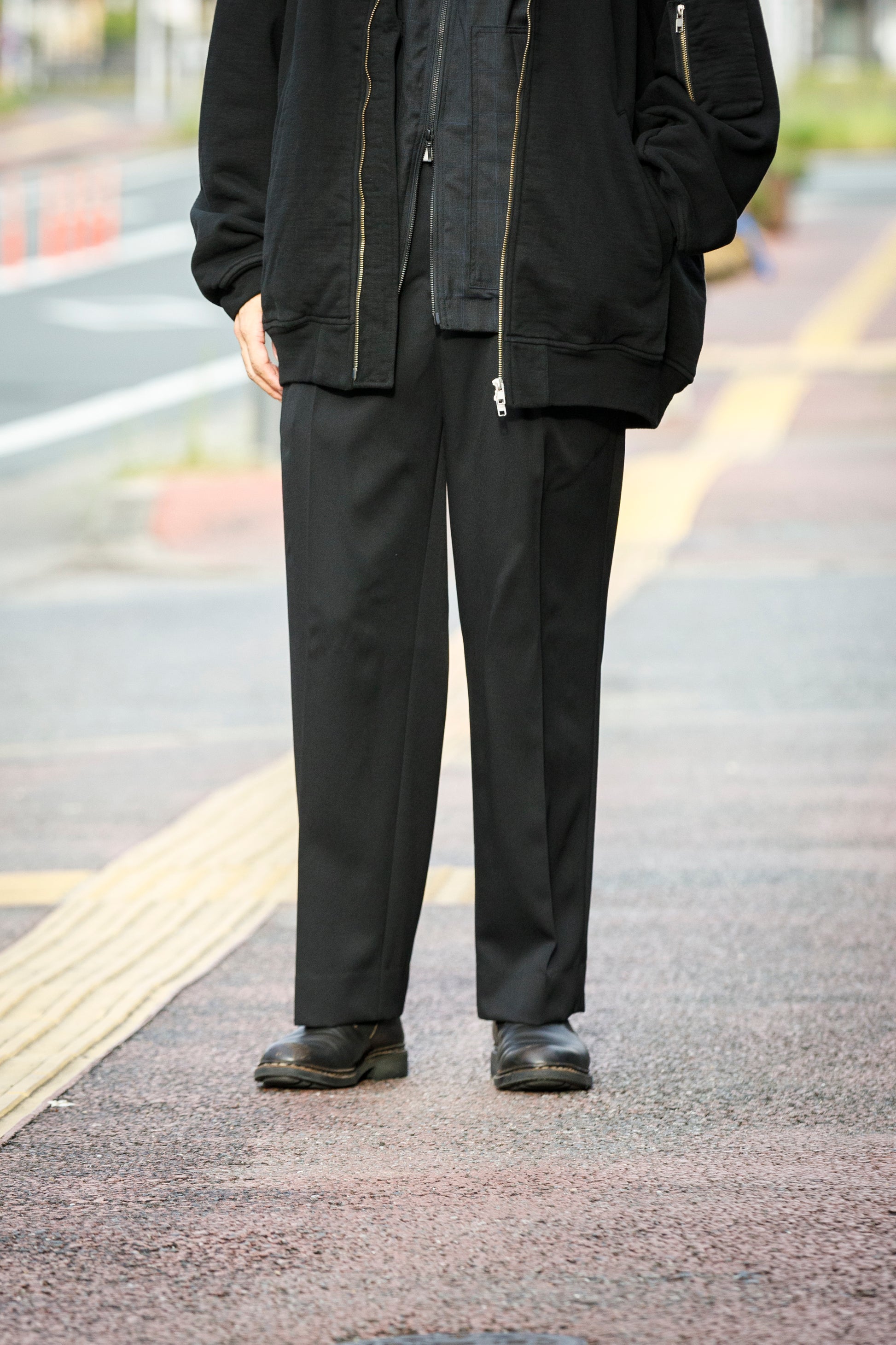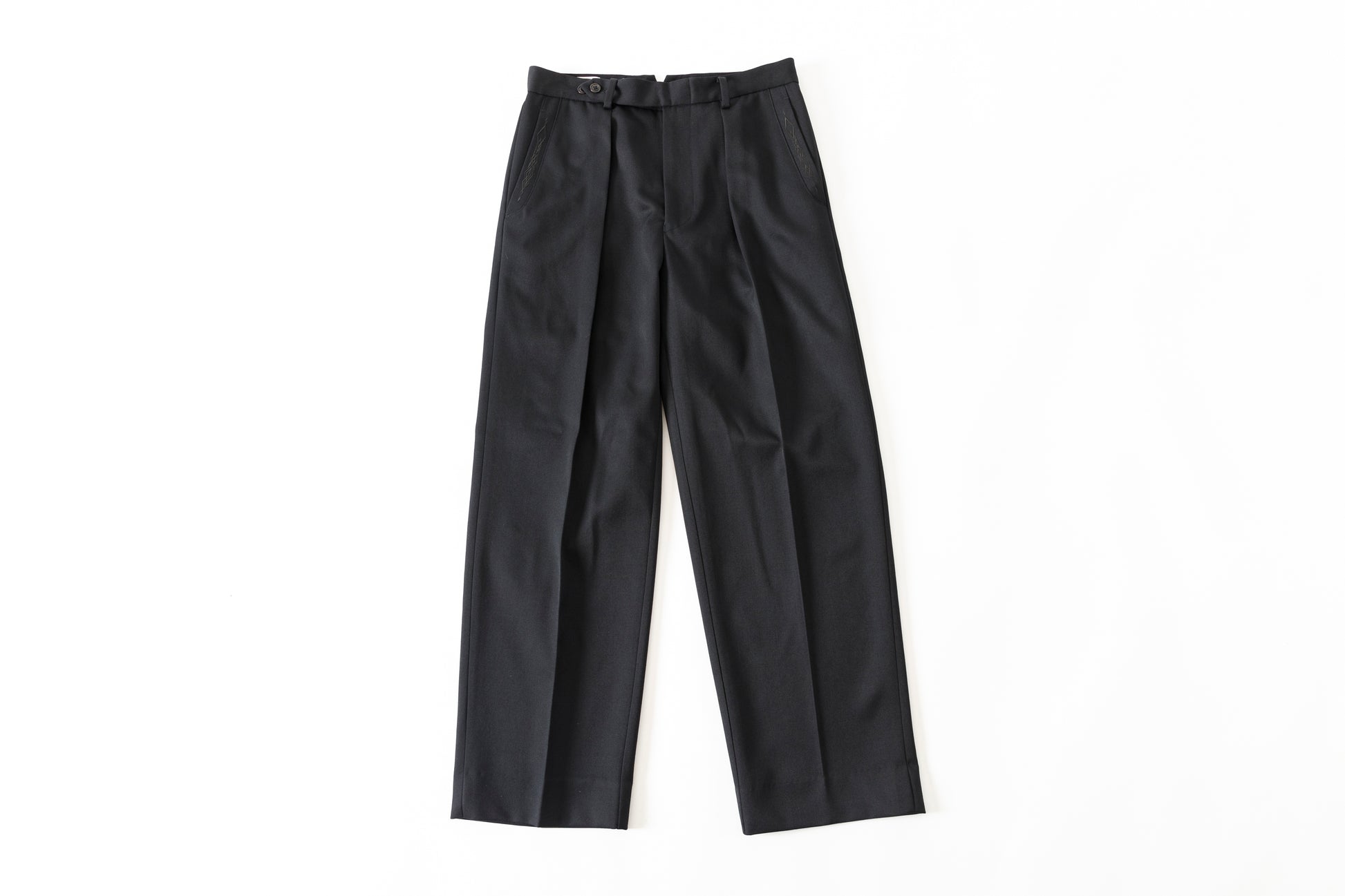 SARTOが提案するウールギャバジンのワイドスラックス品番、TUCKER EMBROIDERY SLACKS - BLACK。