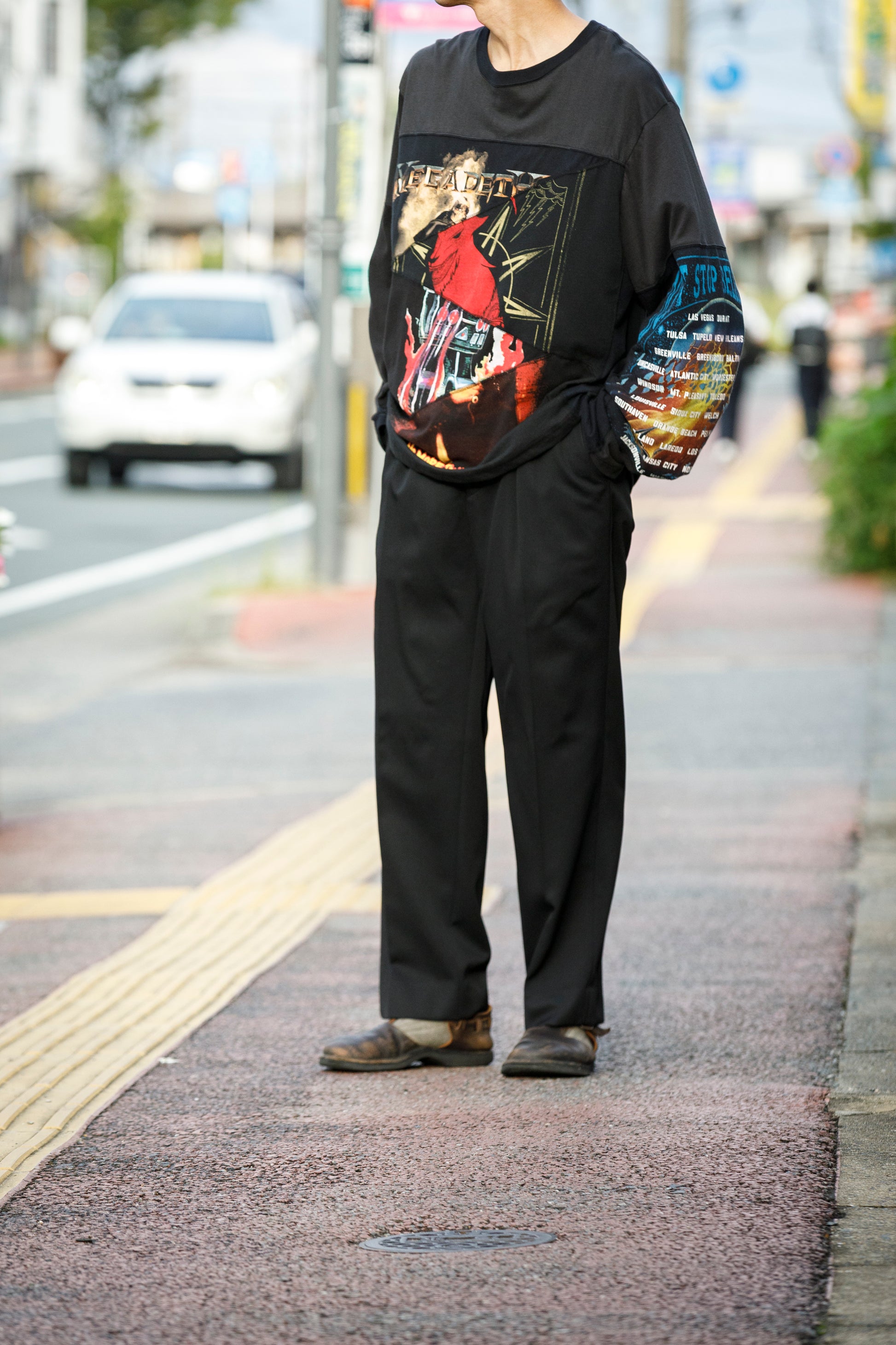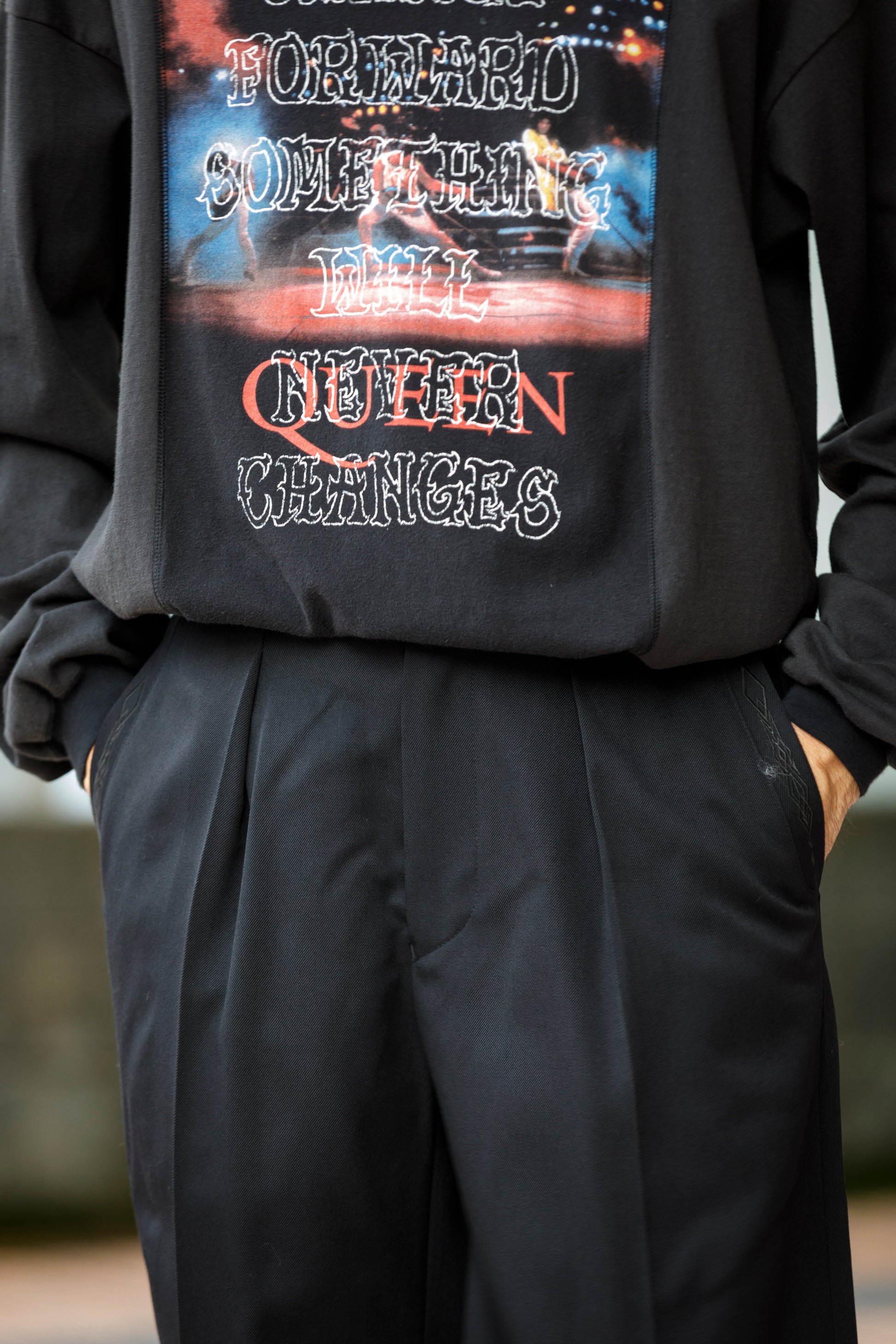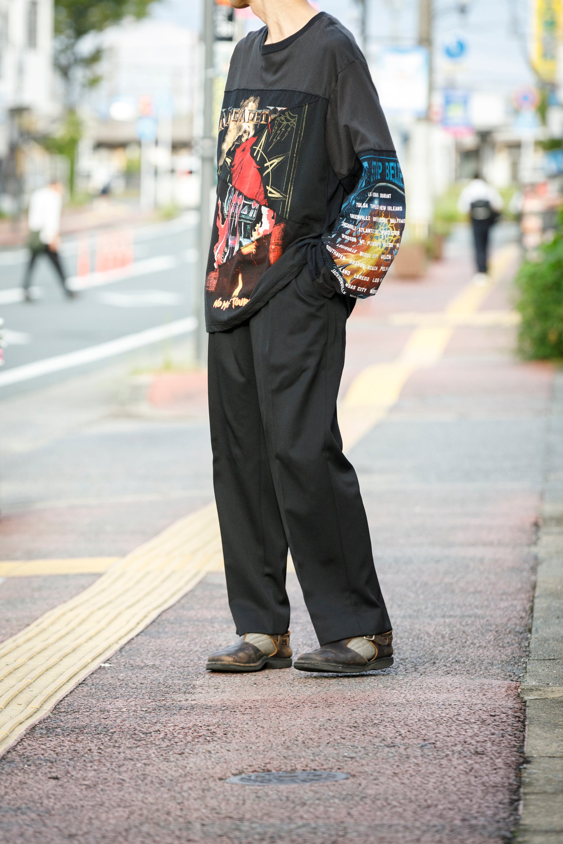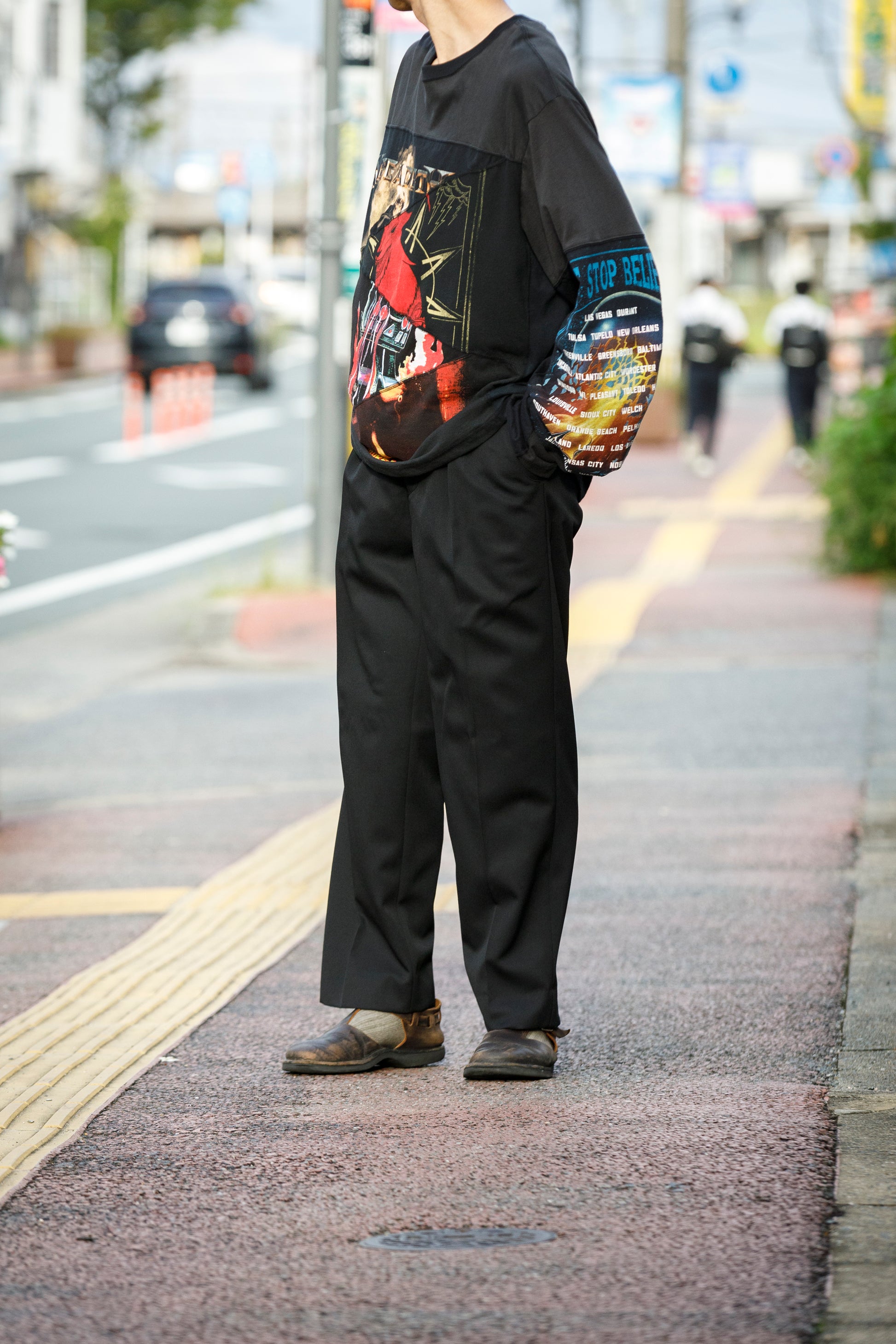 深めのワンタックにセンタークリースを設けており、腰回りは立体感のある形状で生地の落ち感が活かされたワイドシルエット。