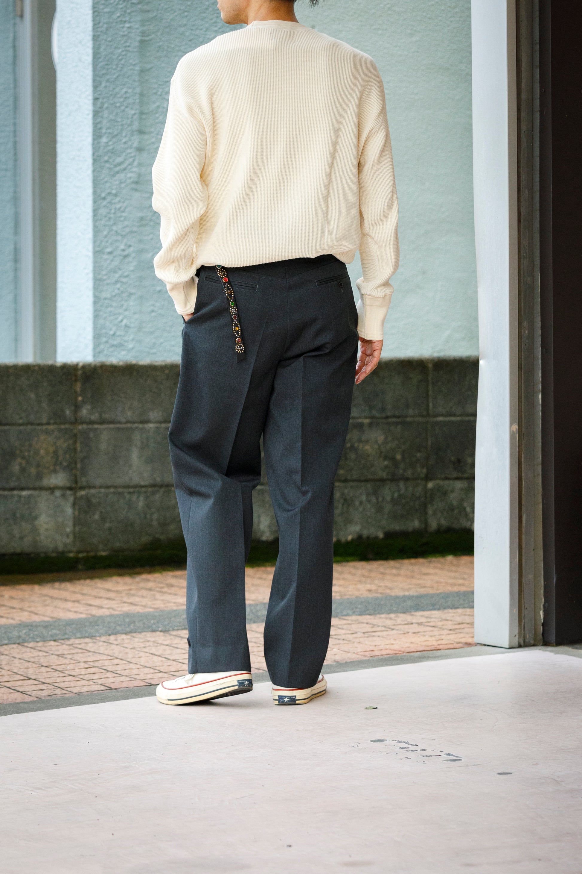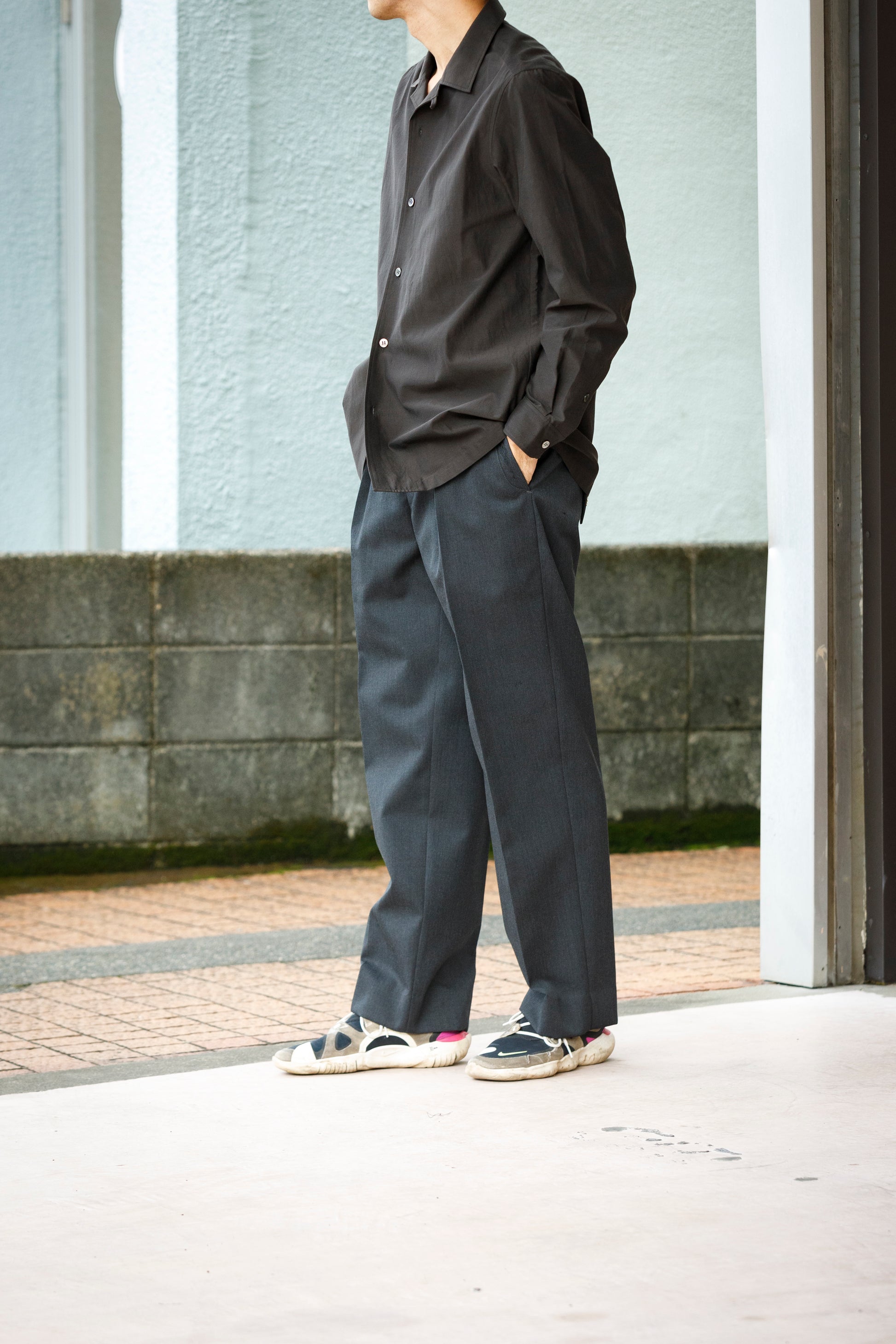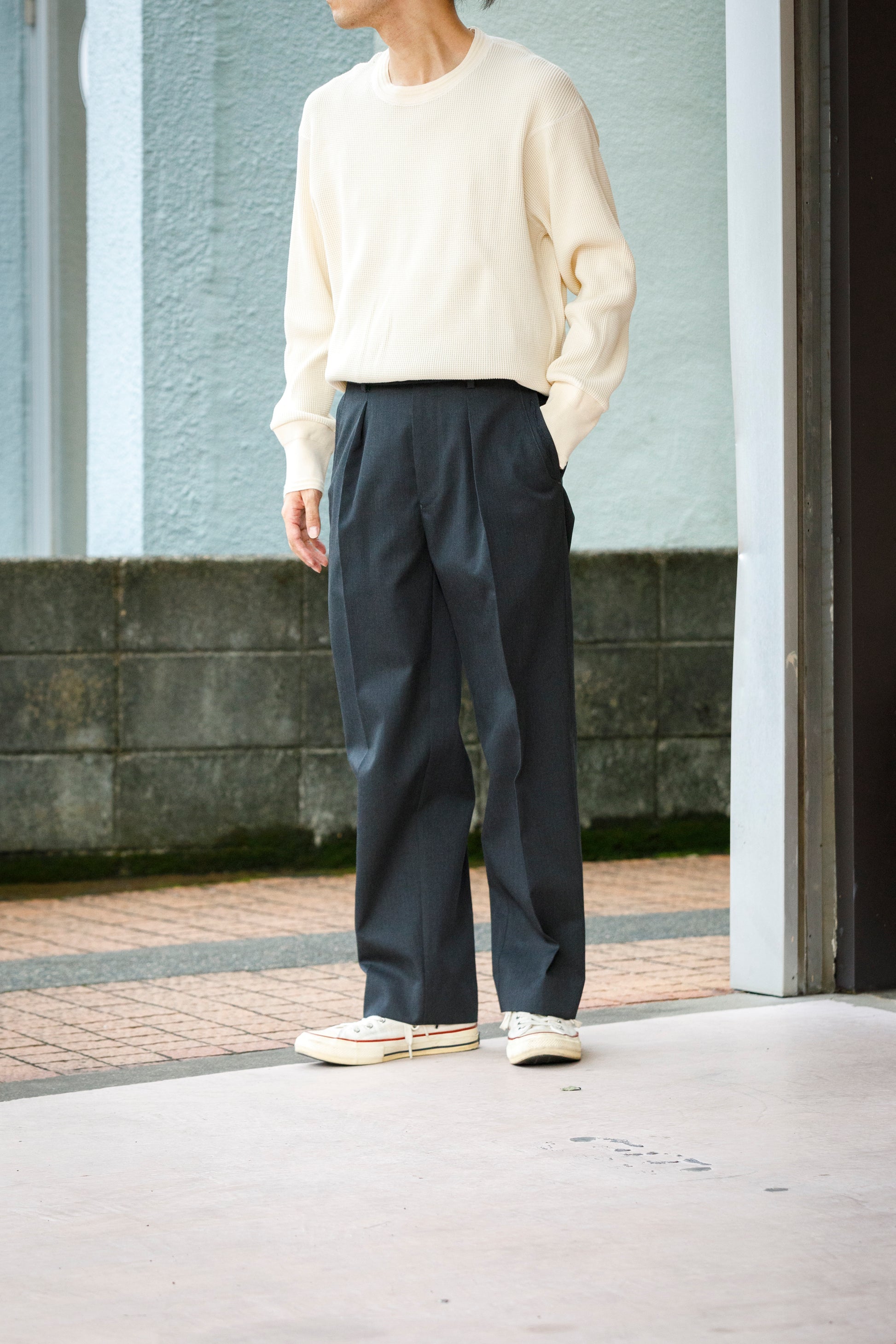 深めのワンタックにセンタークリースを設けており、腰回りは立体感のある形状で生地の落ち感が活かされたワイドシルエット。