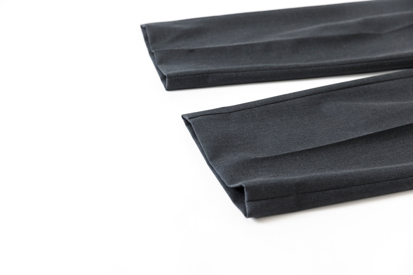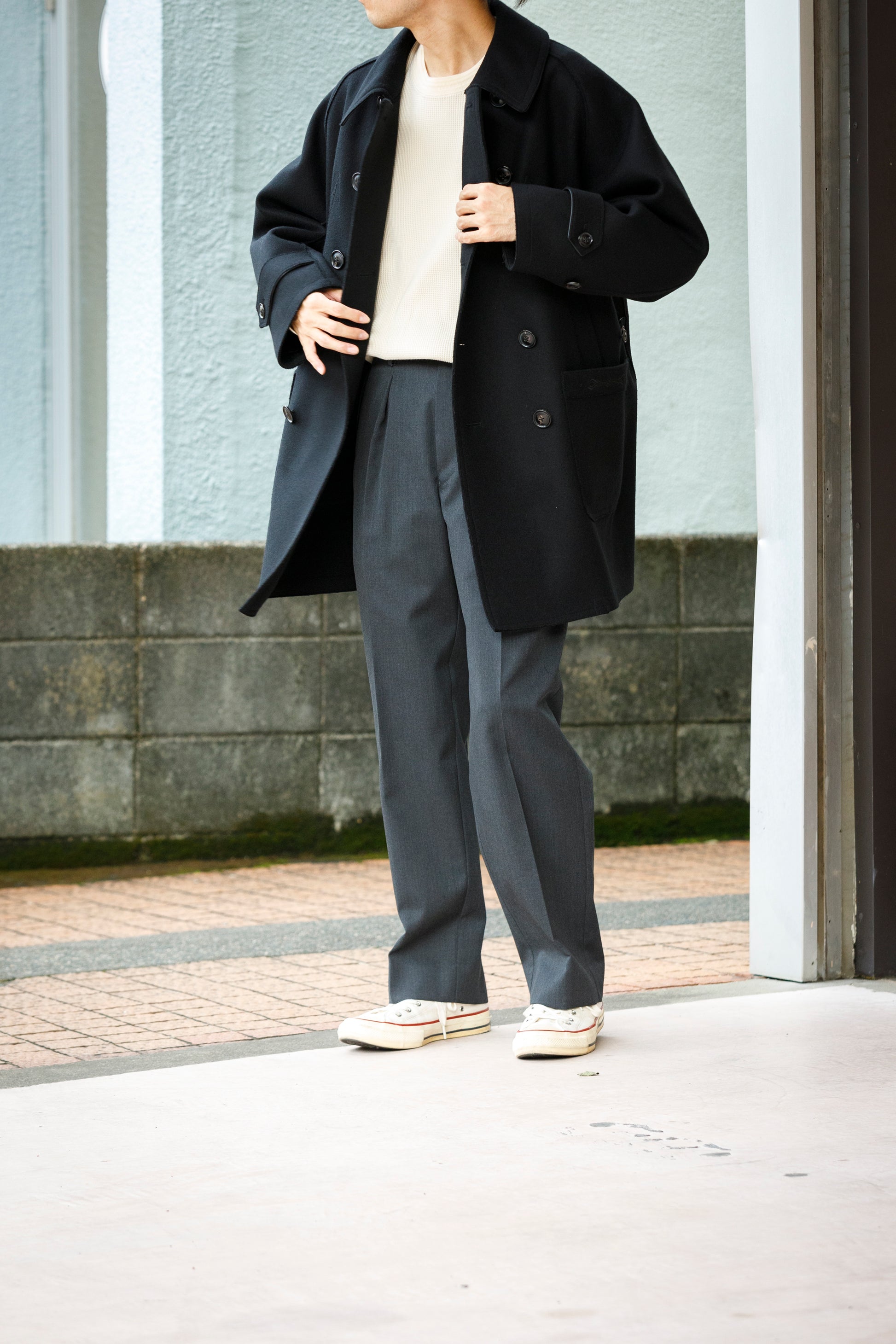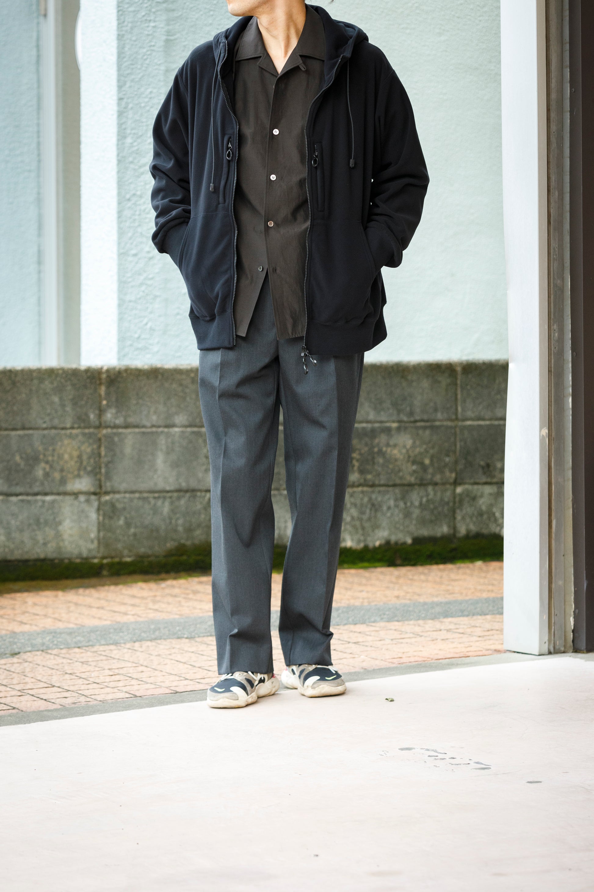 深めのワンタックにセンタークリースを設けており、腰回りは立体感のある形状で生地の落ち感が活かされたワイドシルエット。