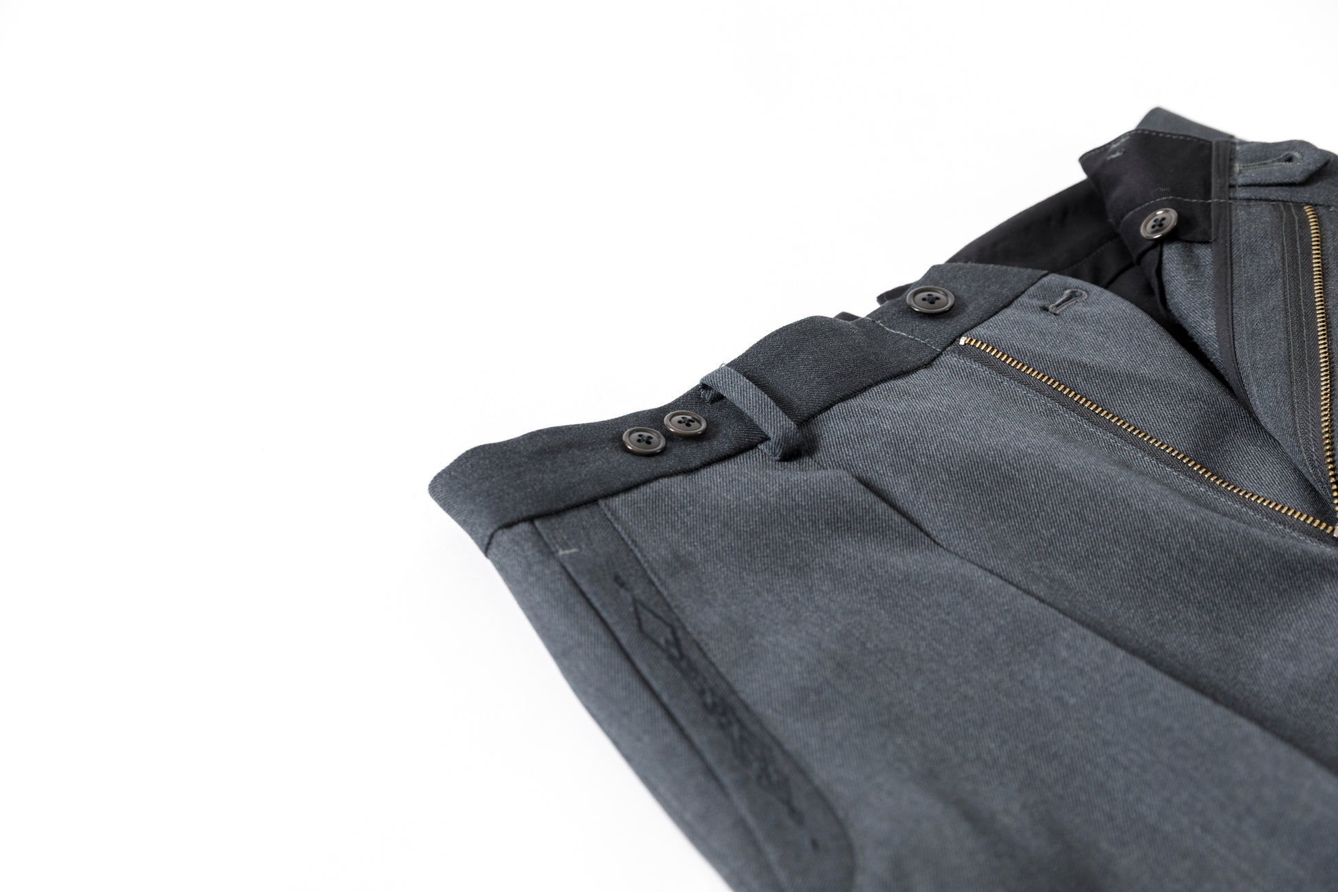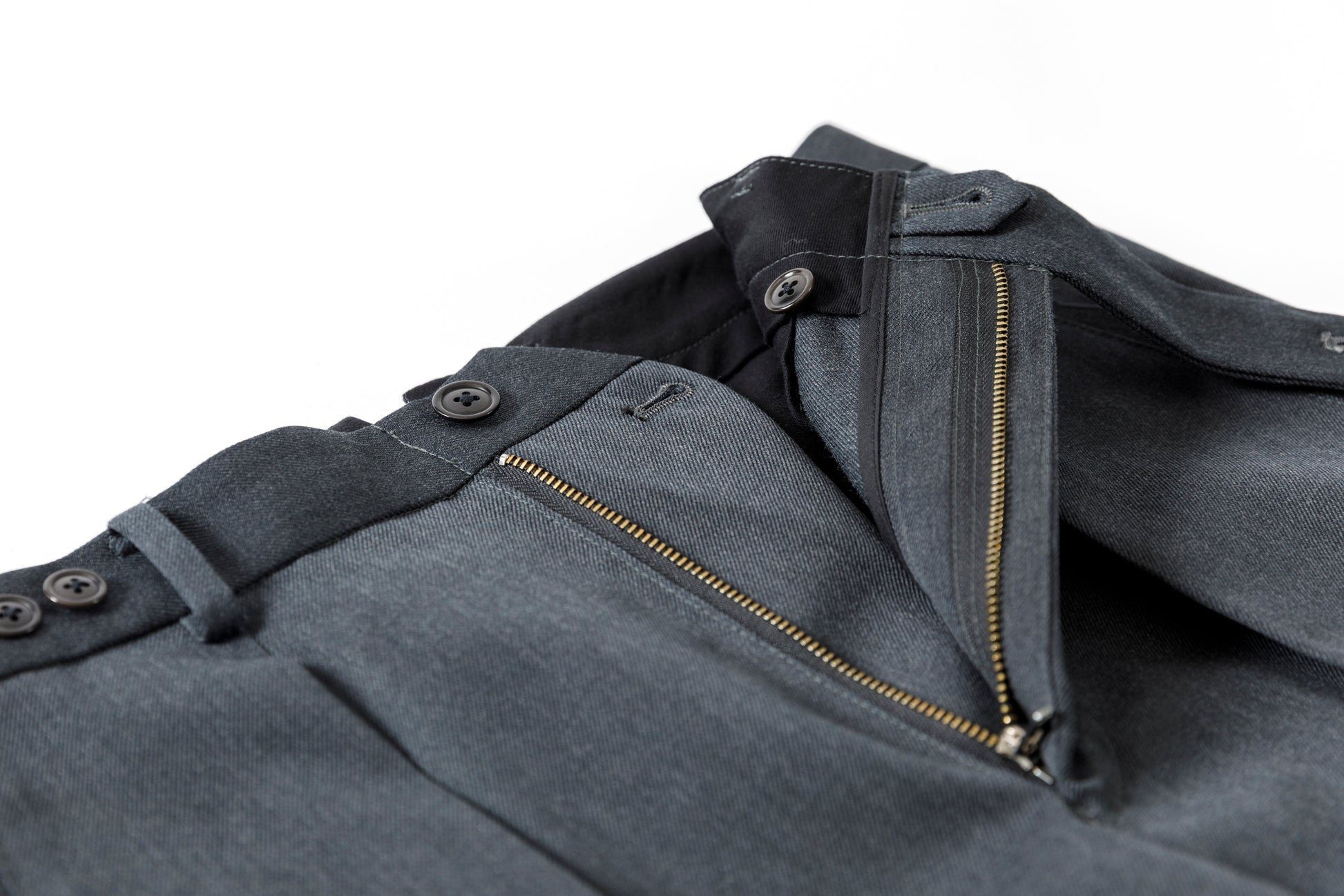 トップボタンとジップによる天狗仕様で、トップボタンの上に被るパーツはグルカパンツのデザインを彷彿とさせます。