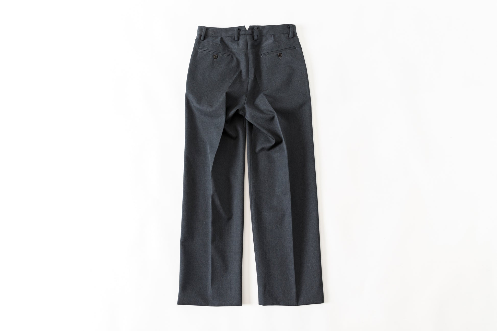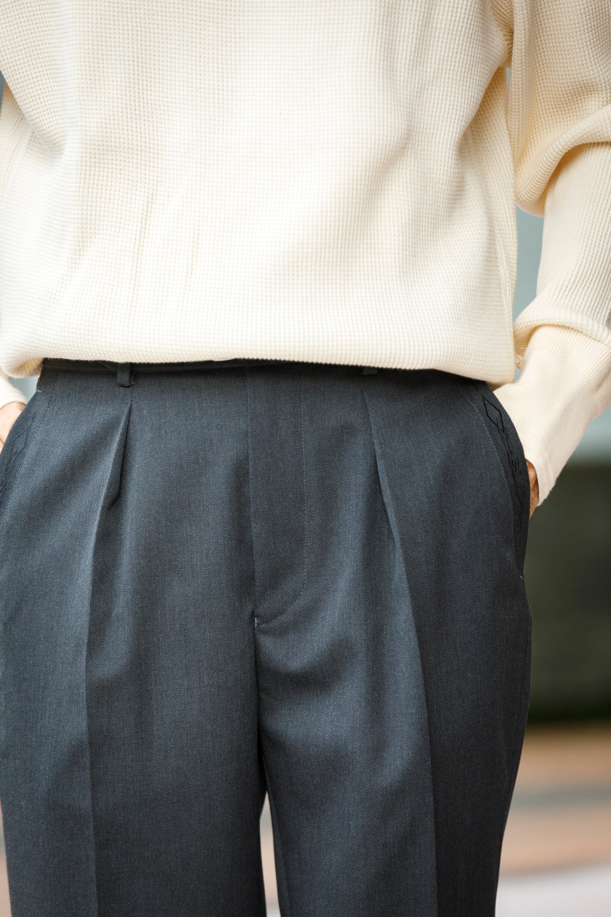 SARTOが提案するウールギャバジンのワイドスラックス品番、TUCKER EMBROIDERY SLACKS - CHACOAL。