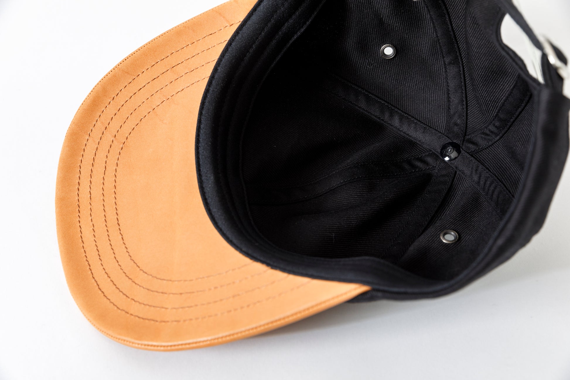 コットンカツラギ素材とレザーを組み合わせたロングビルキャップ、LEATHER BICOLOR CAP - BLACK。