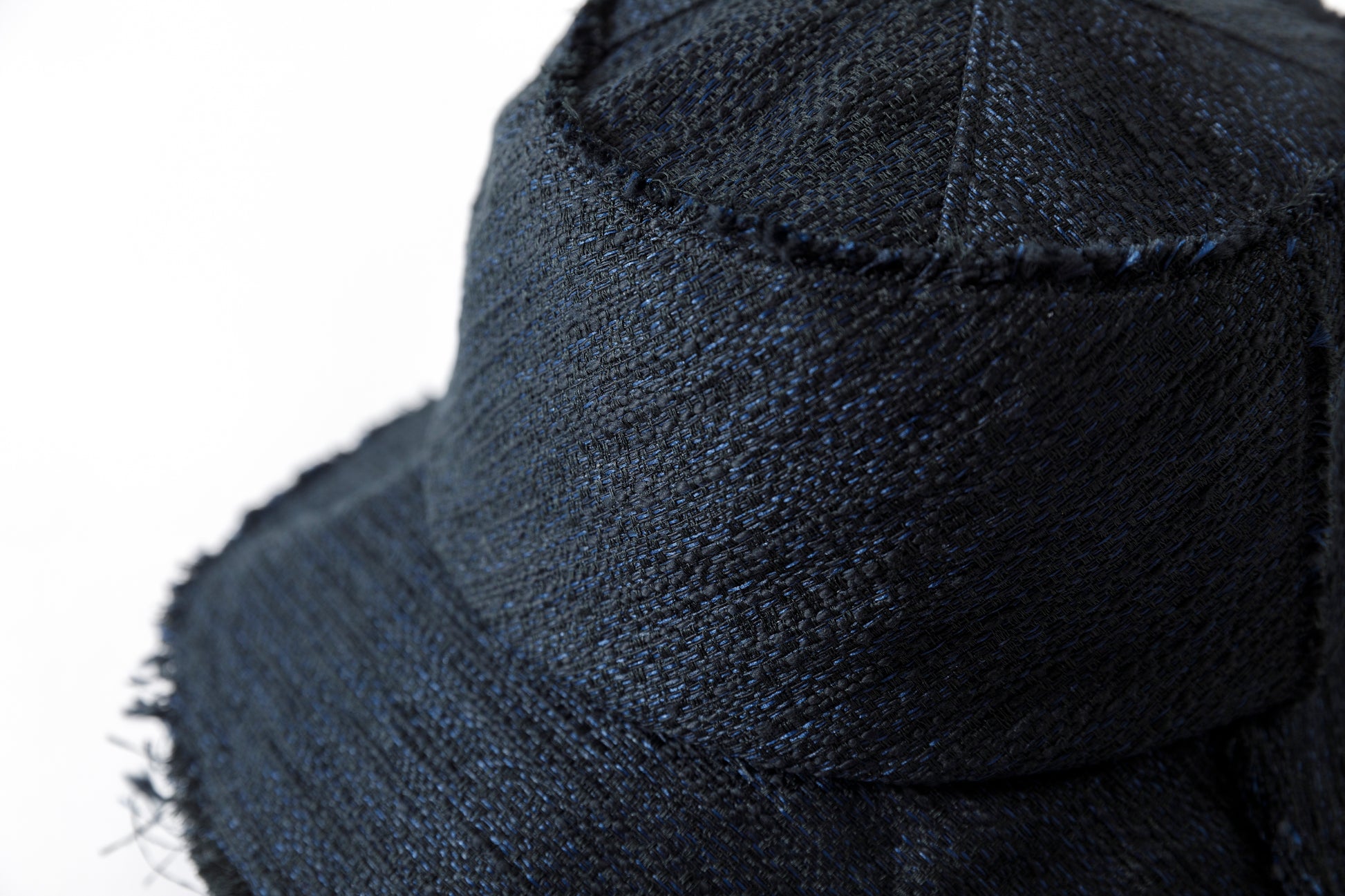 シンプルなバケットハットのデザインに、素材感とランダムな切り返しを施すことで表情豊かな仕上がりになっております。