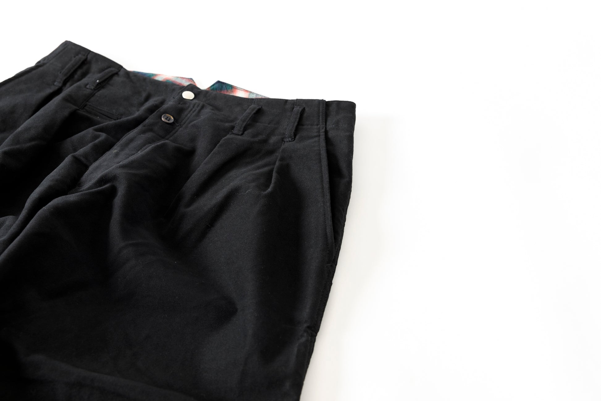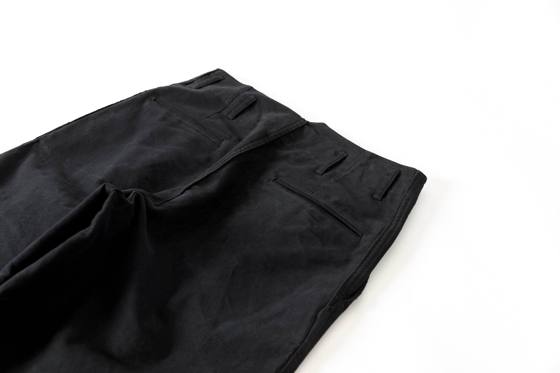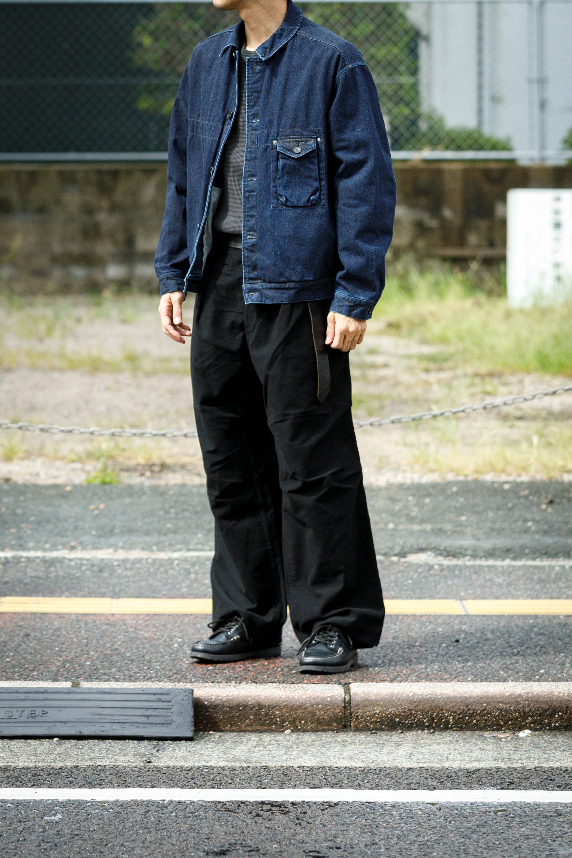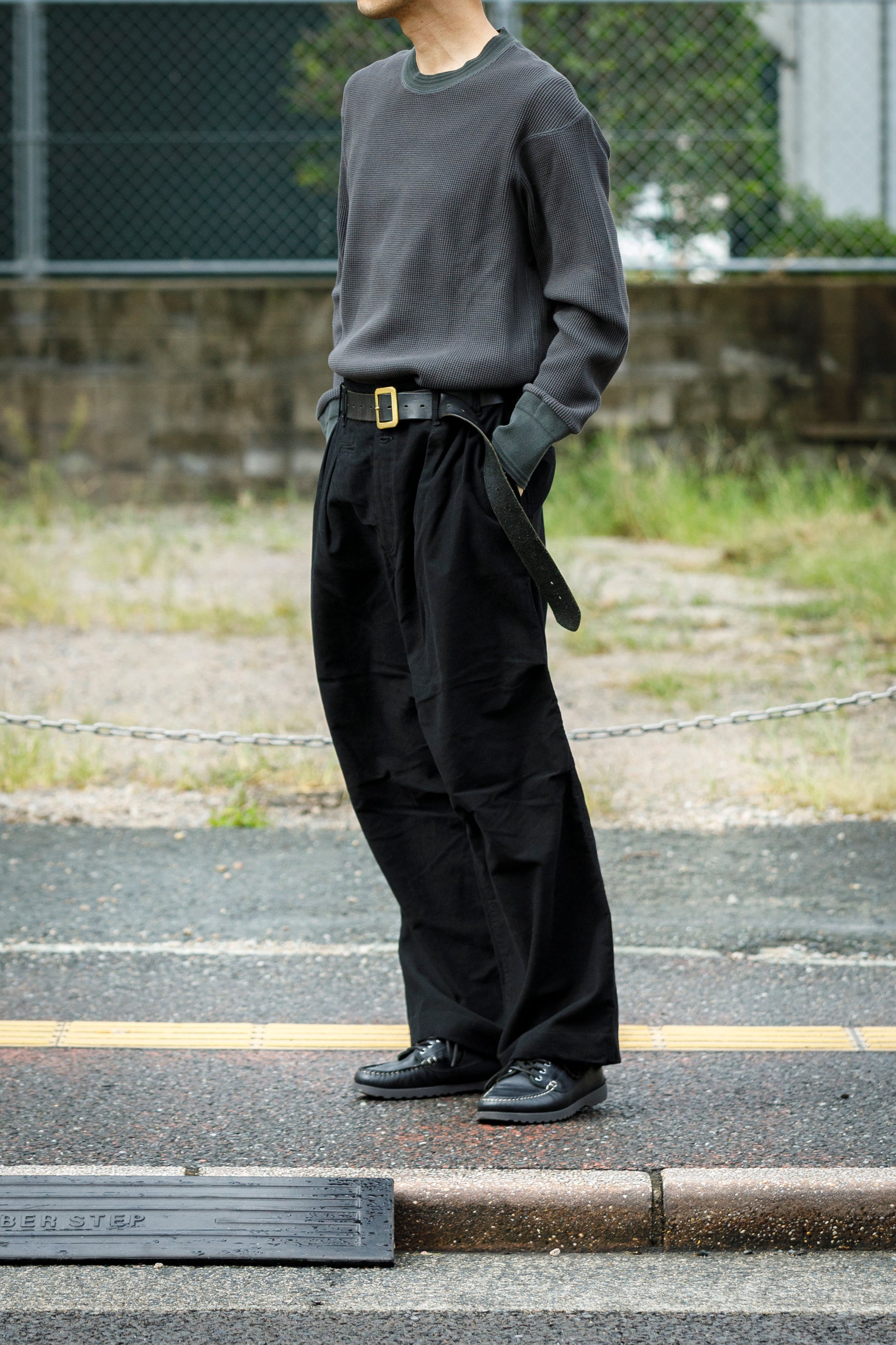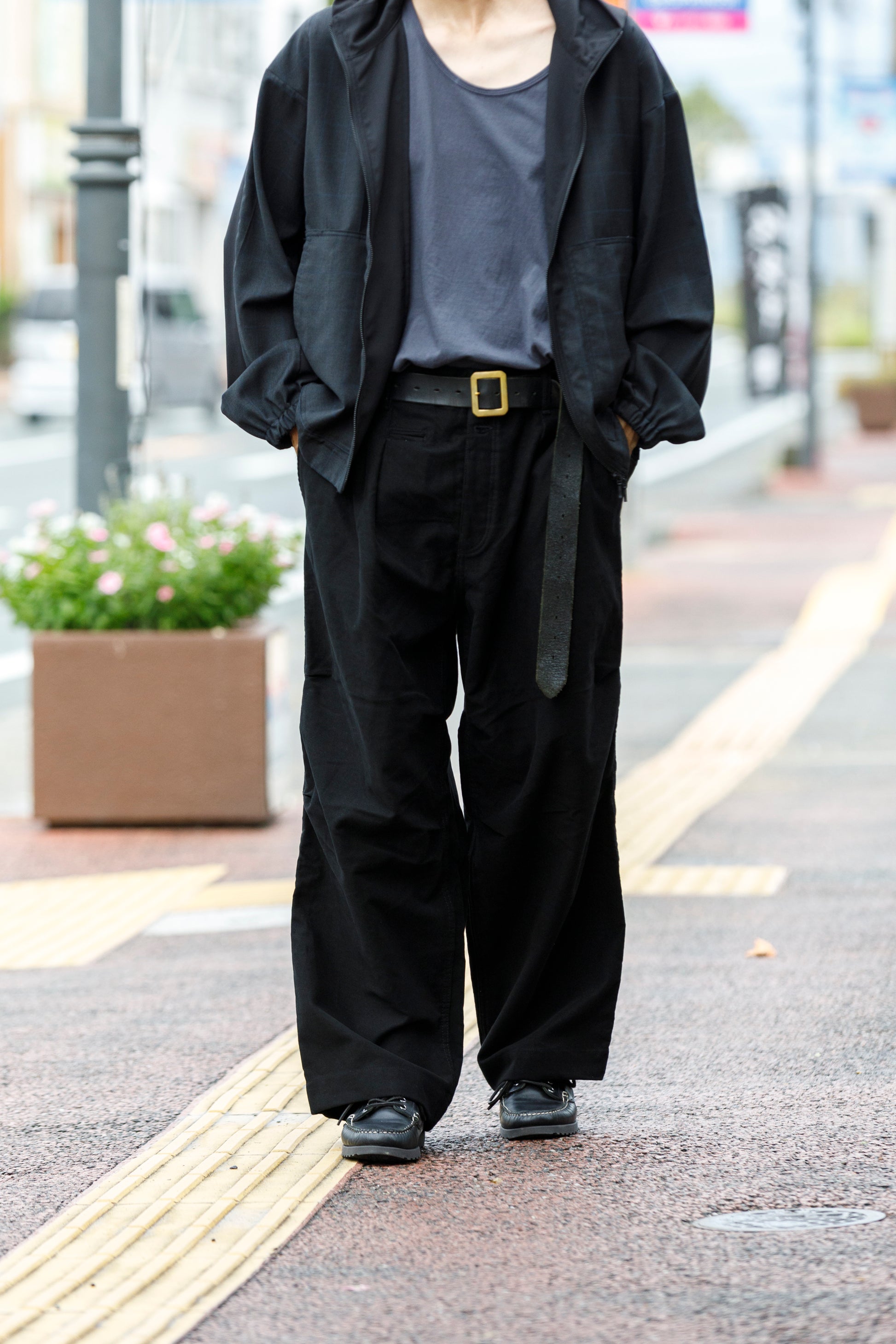 軍物のオーバーパンツルックスを取り入れつつ、独自の感性が詰め込まれた迫力あるワイドストレート品番、P-023_Black fleece。