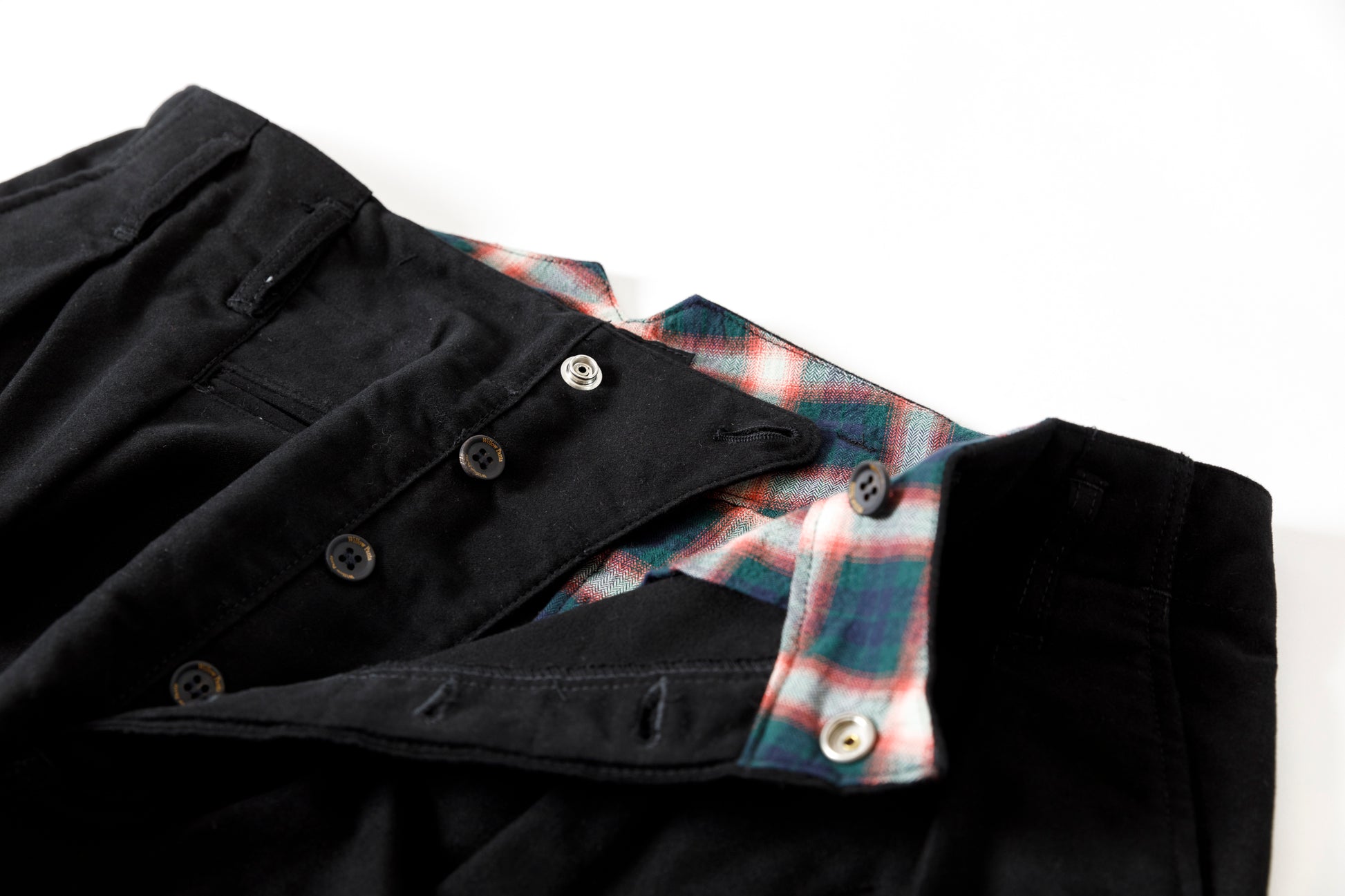 フロントはスナップボタン(1番上)とボタンフライ(2番目は表、3,4番目は裏)の仕様。