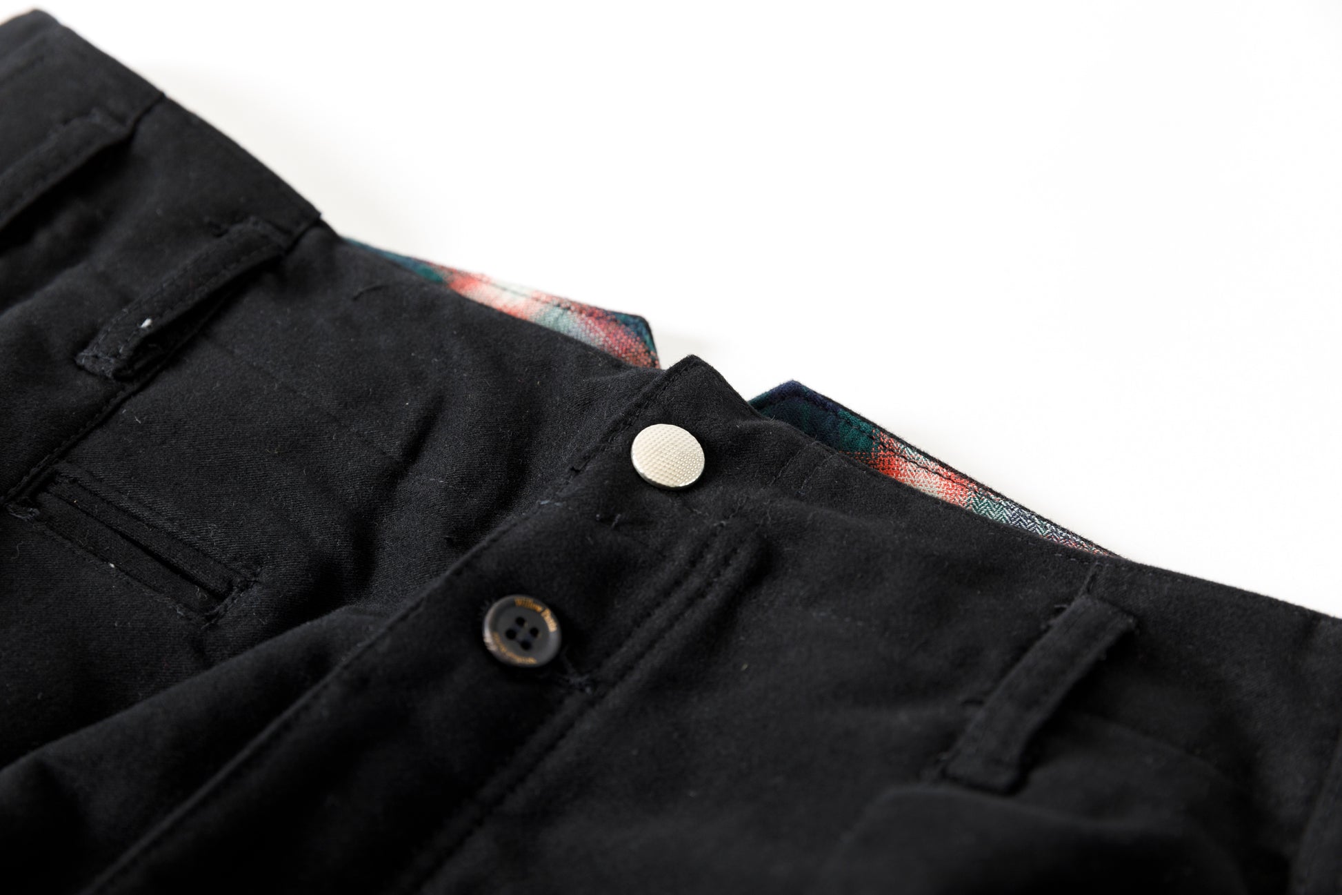 また、スラックスによくみられる天狗仕様の作りや、右下に配されたワークパンツにみられるコインポケットと異なるジャンルで構成されたディテールが面白く、デザイナー飯田さんらしく自由な発想を感じる仕上がり。