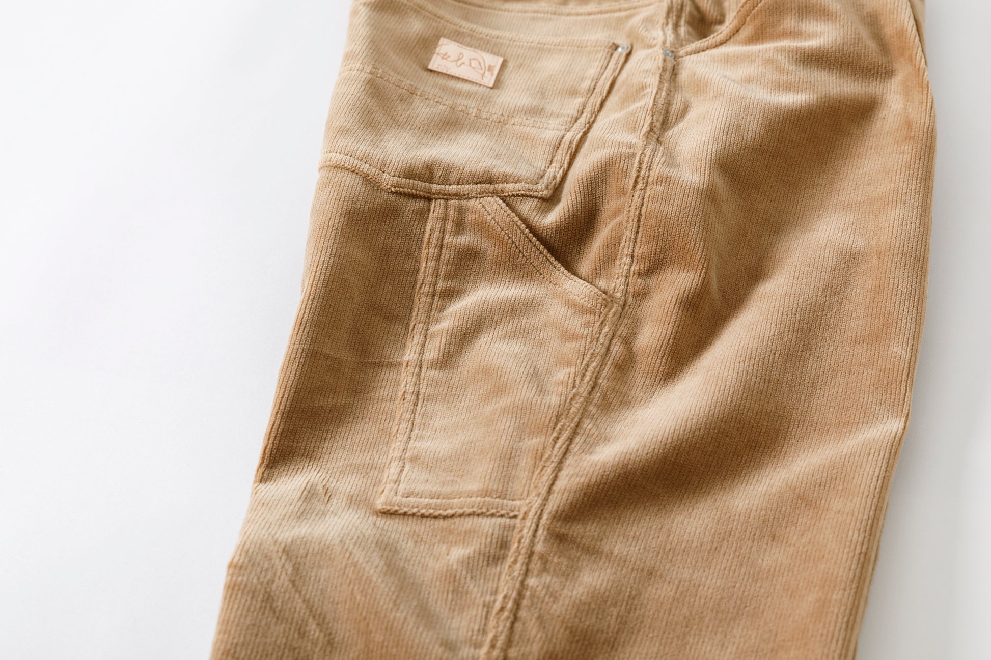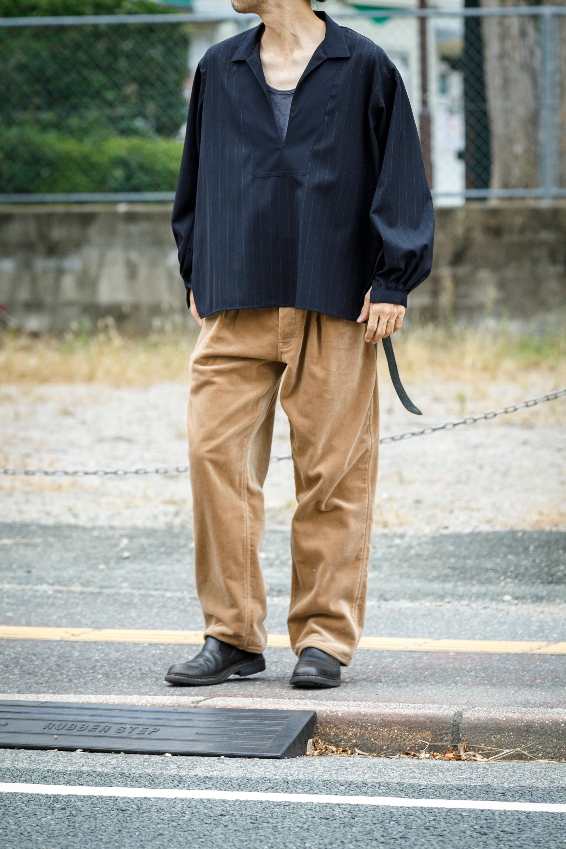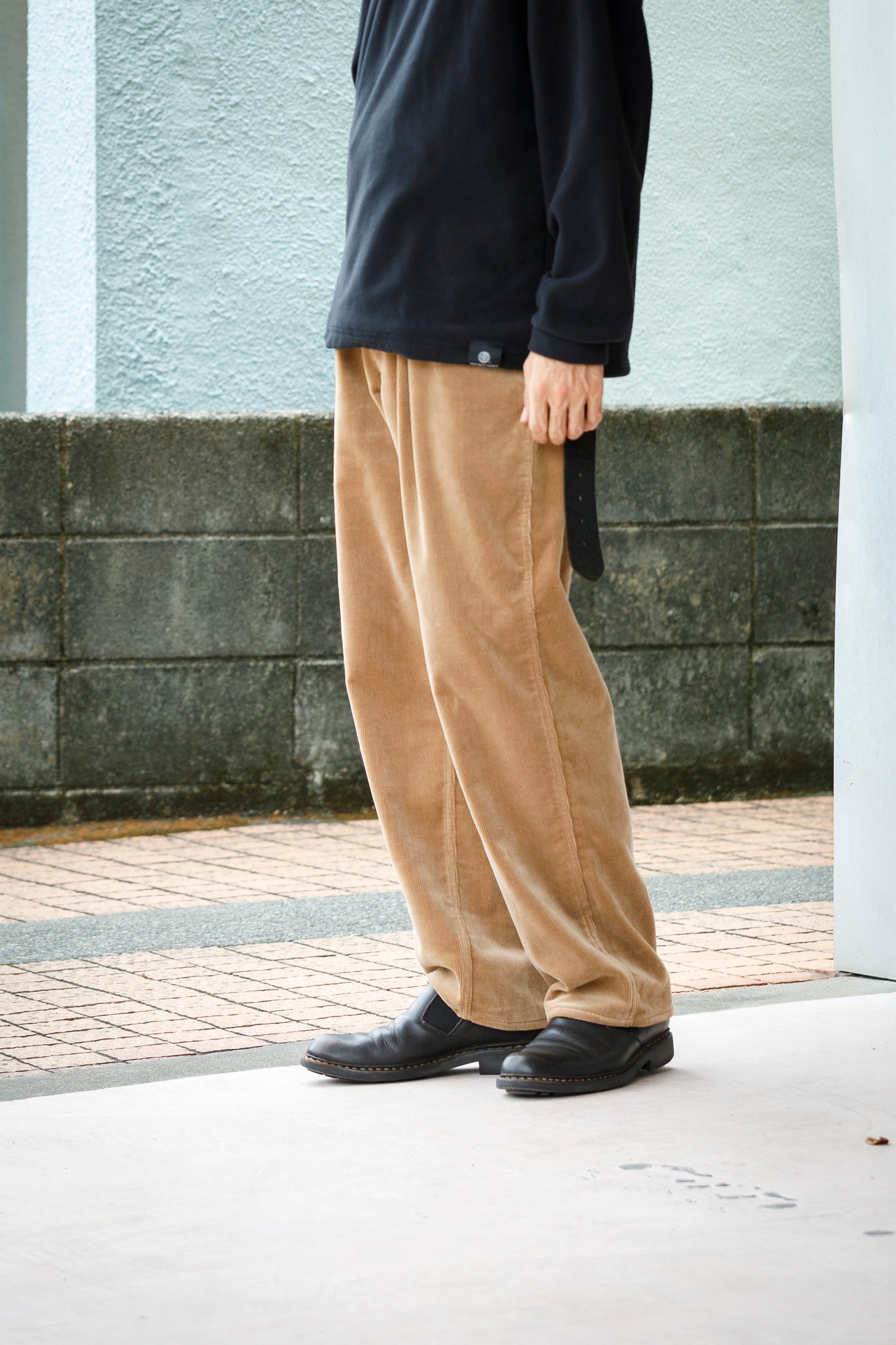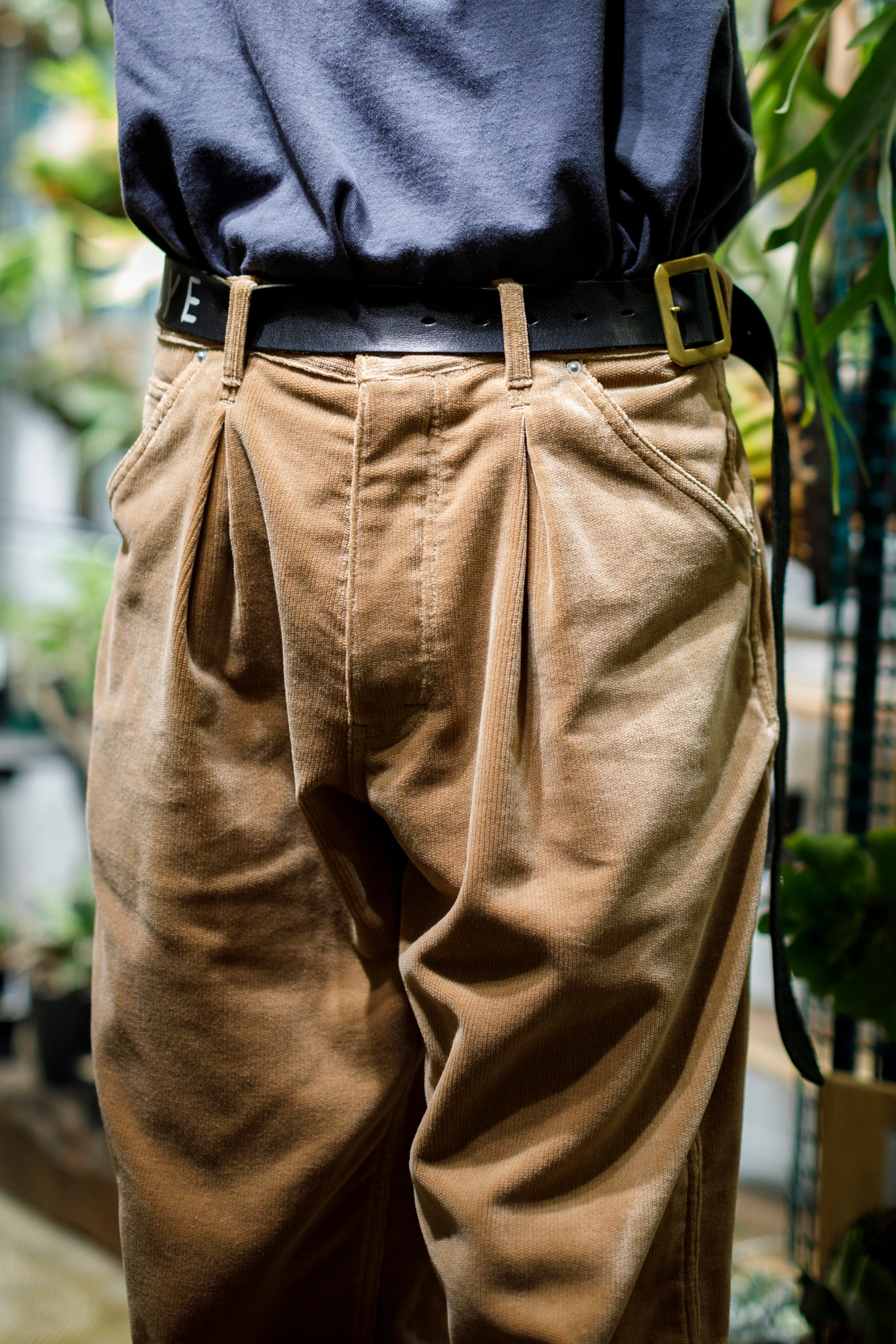 ワークパンツのディティールを取り入れブランドならではのシルエットバランスとデットストックの生地を使りあげた、P-035_Beige Corduroy。