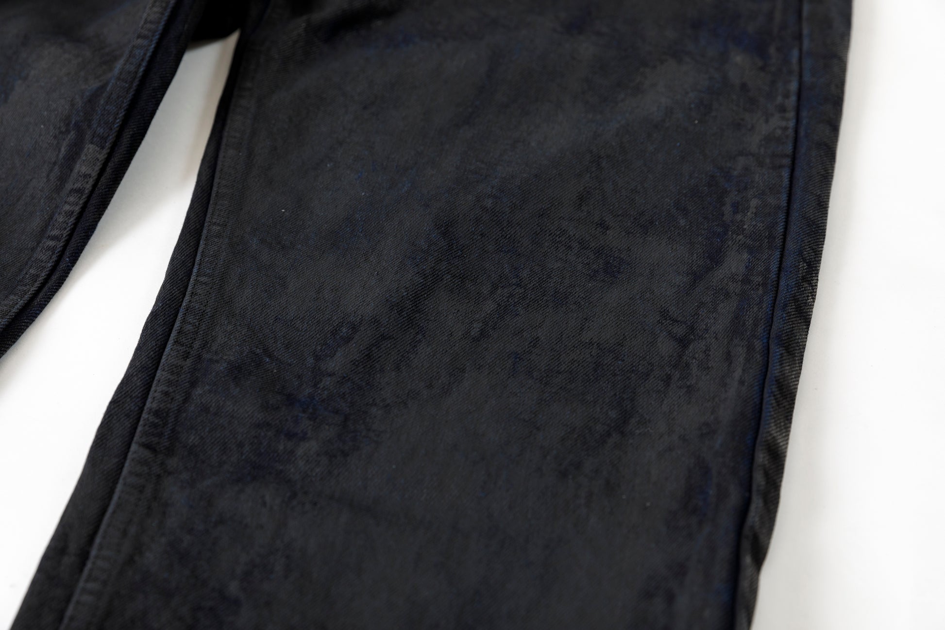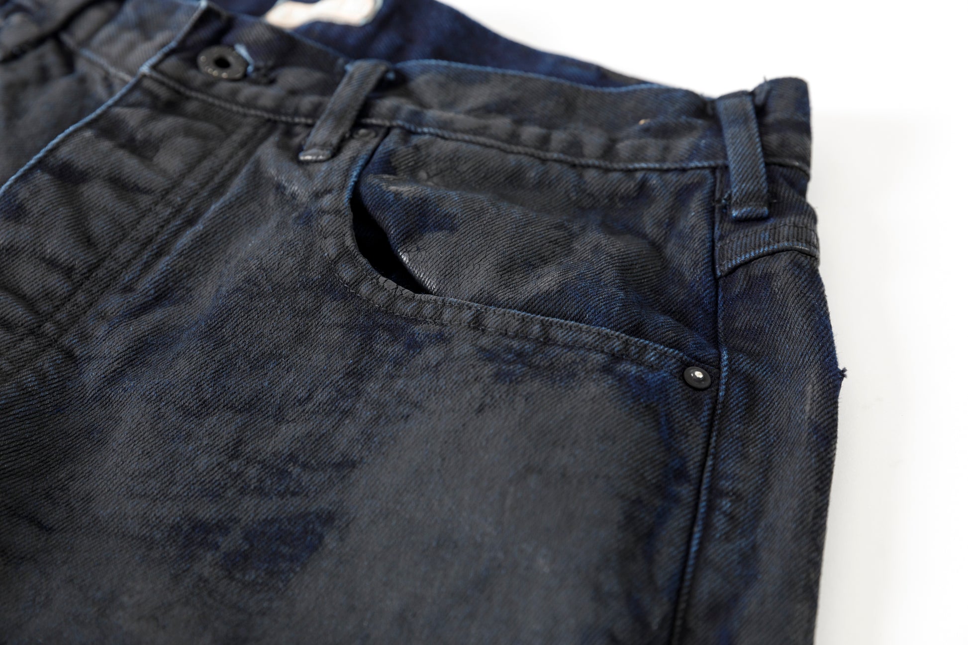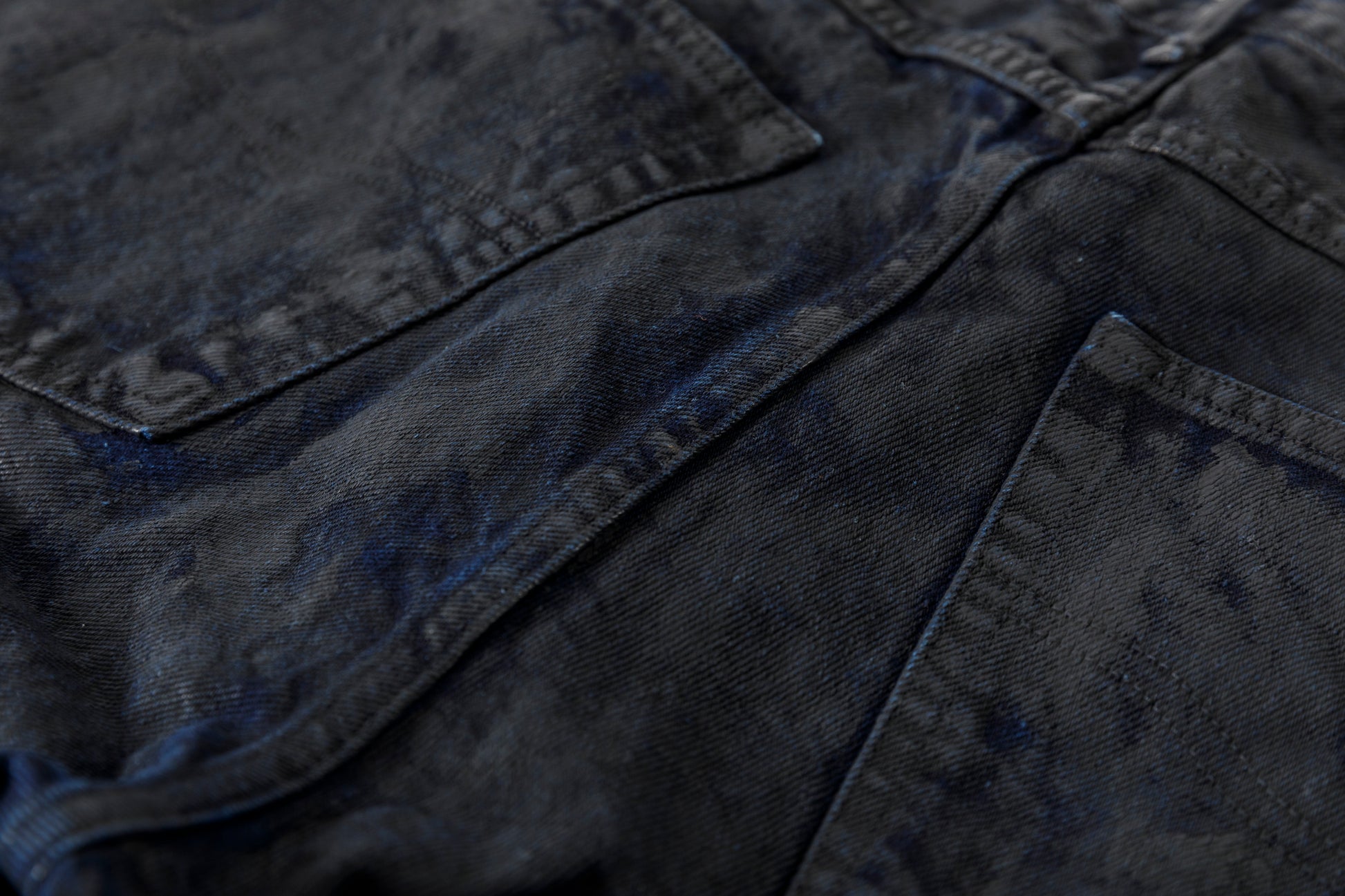 今回リリースされたモデルはとあるブランドとブランドのコラボパンツから着想を得て、青みの強いデットストックのインディゴデニムの上から黒の塗料にて加工されたモデルとなります。