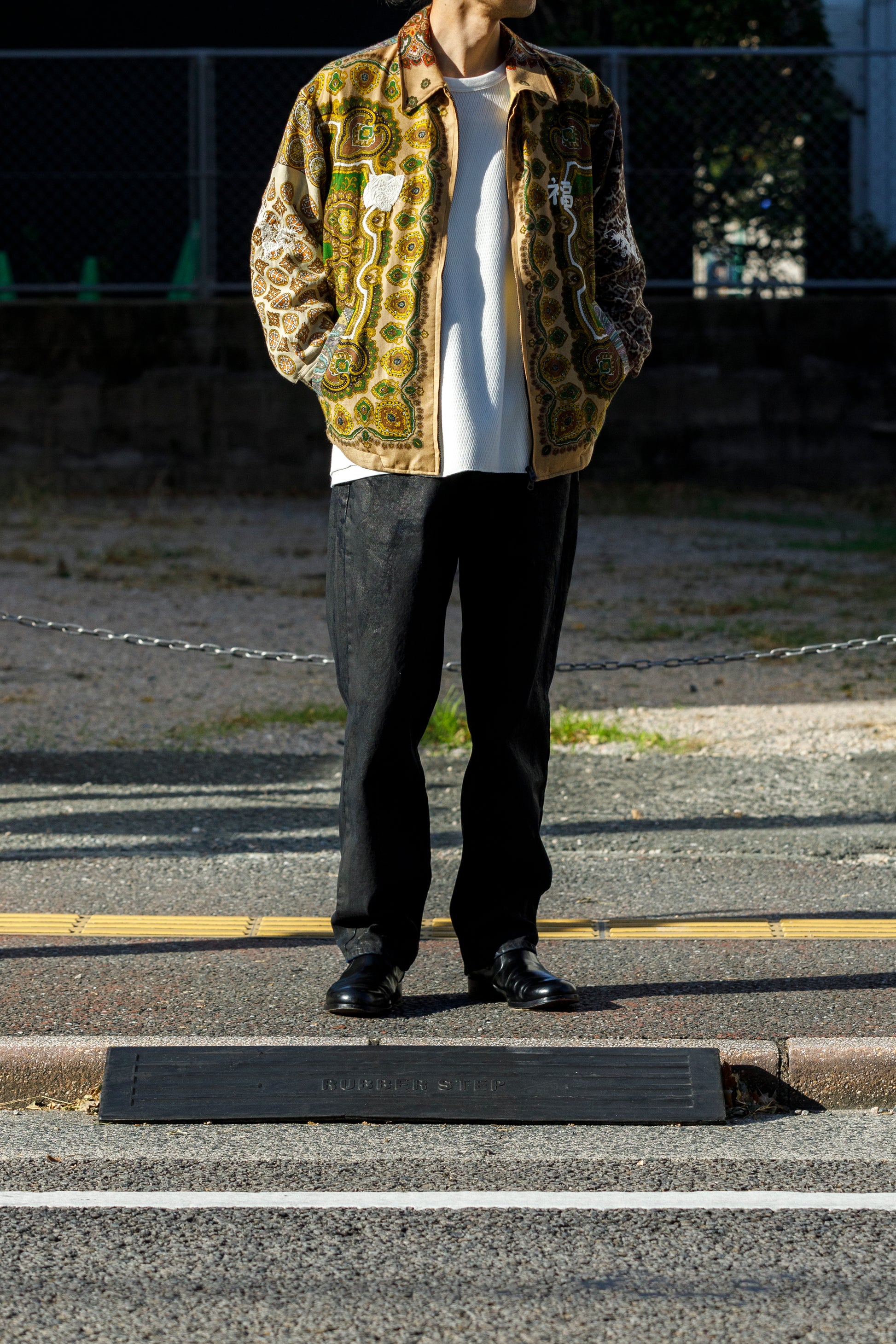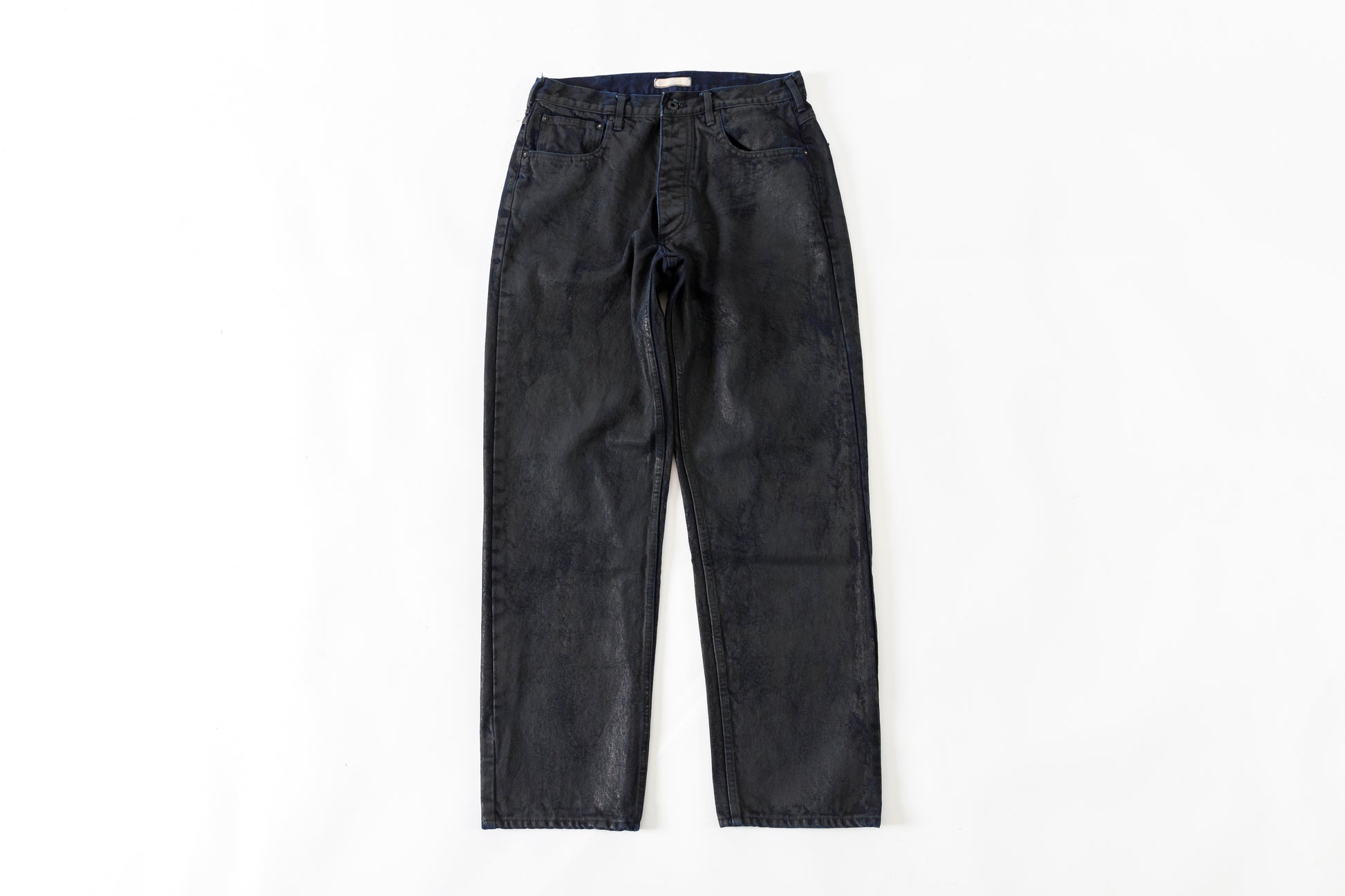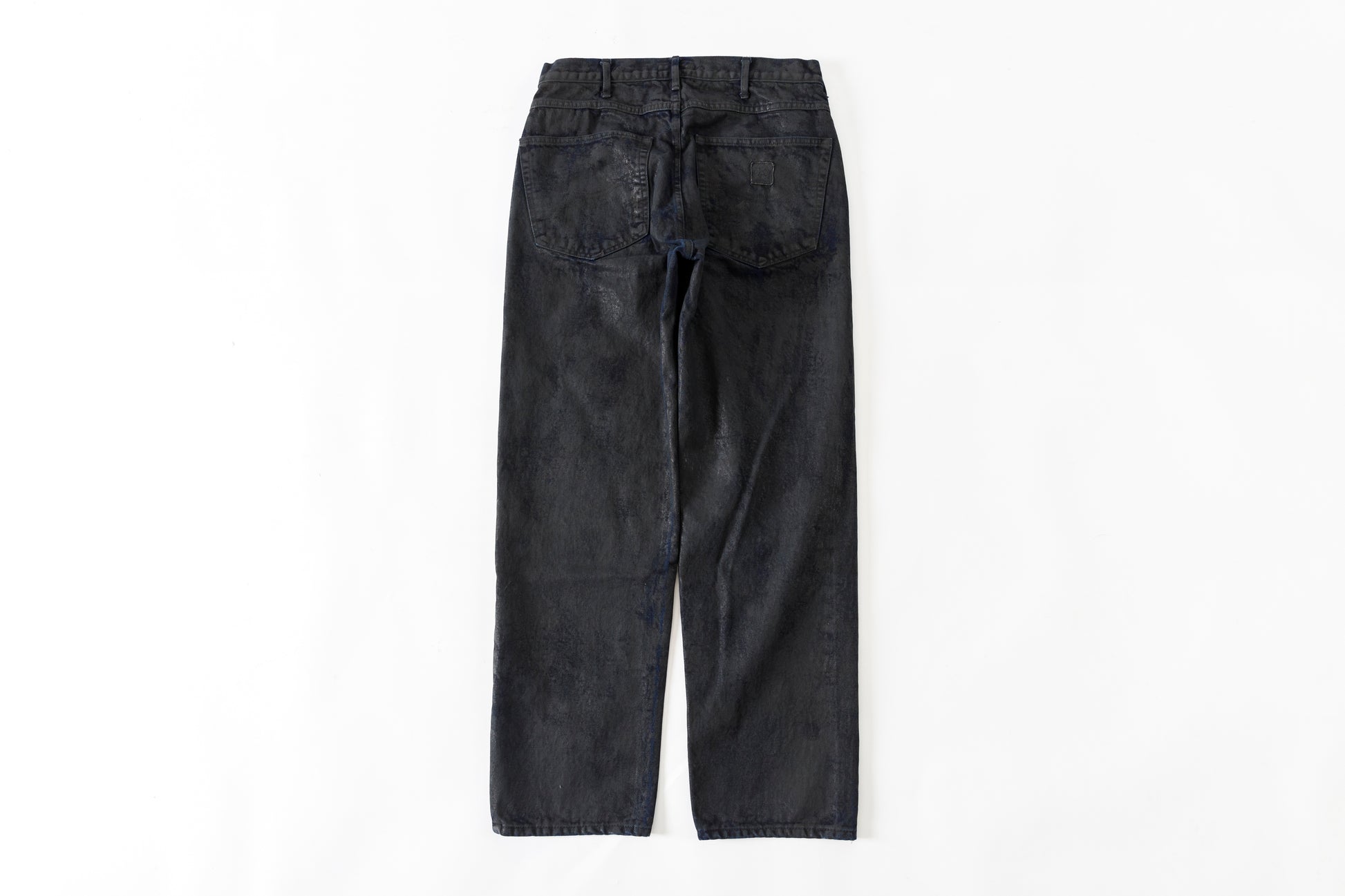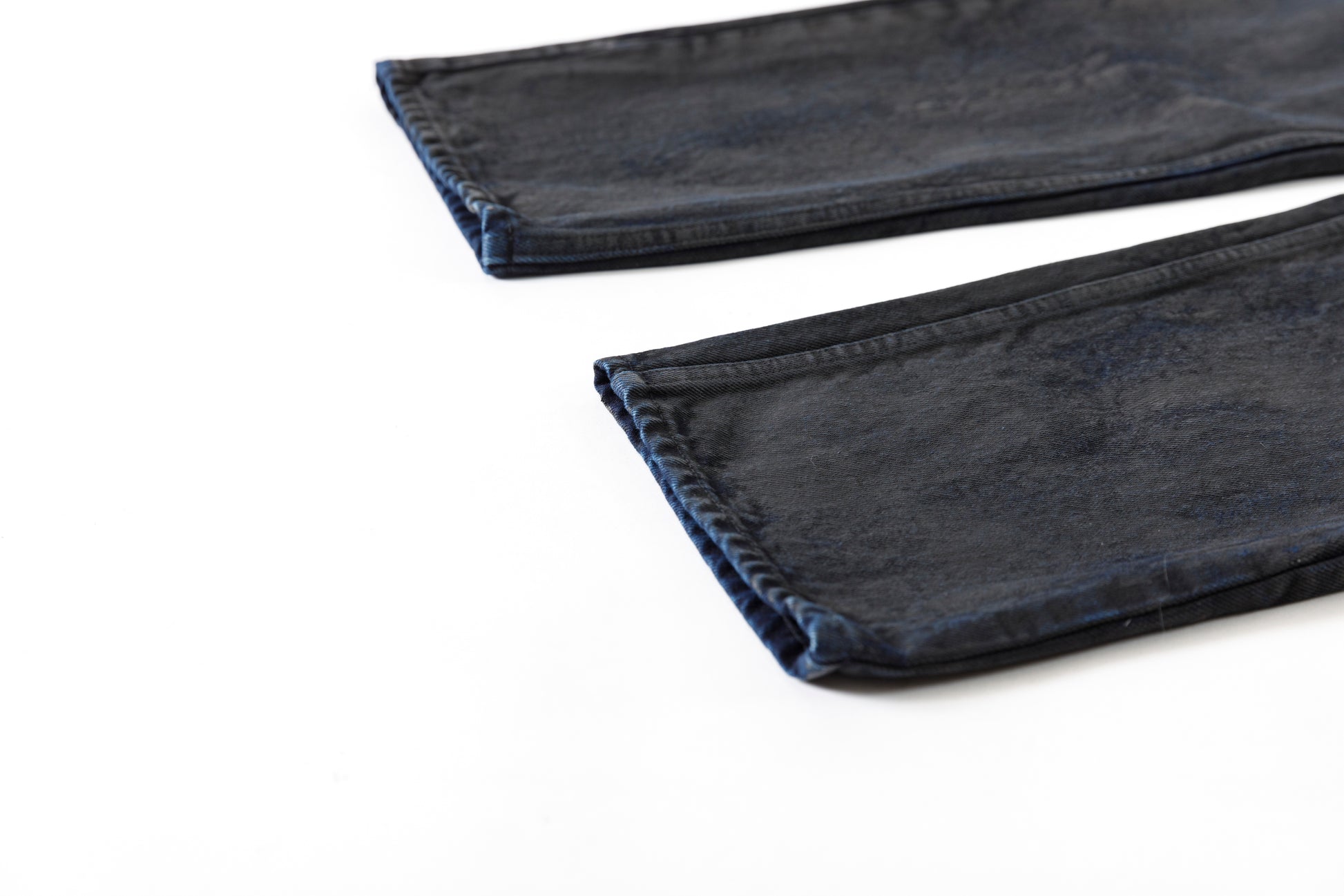 今回リリースされたモデルはとあるブランドとブランドのコラボパンツから着想を得て、青みの強いデットストックのインディゴデニムの上から黒の塗料にて加工されたモデルとなります。