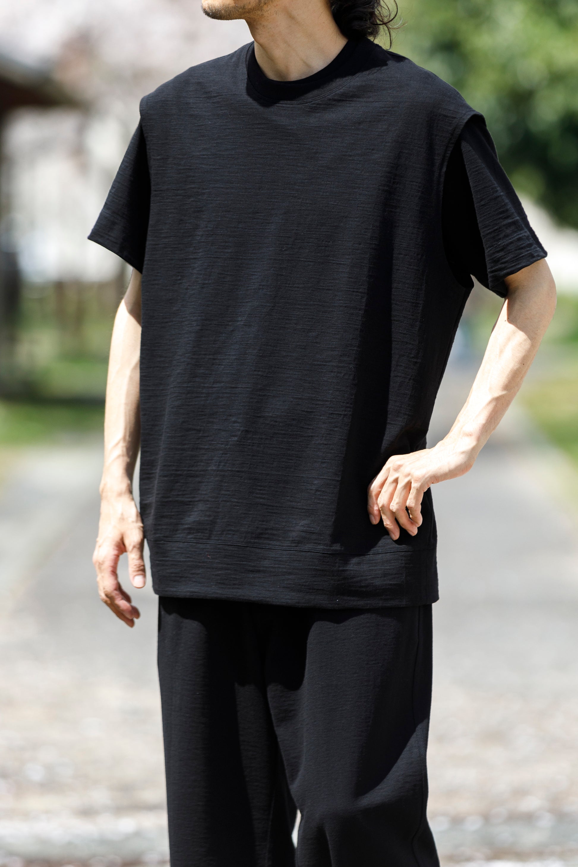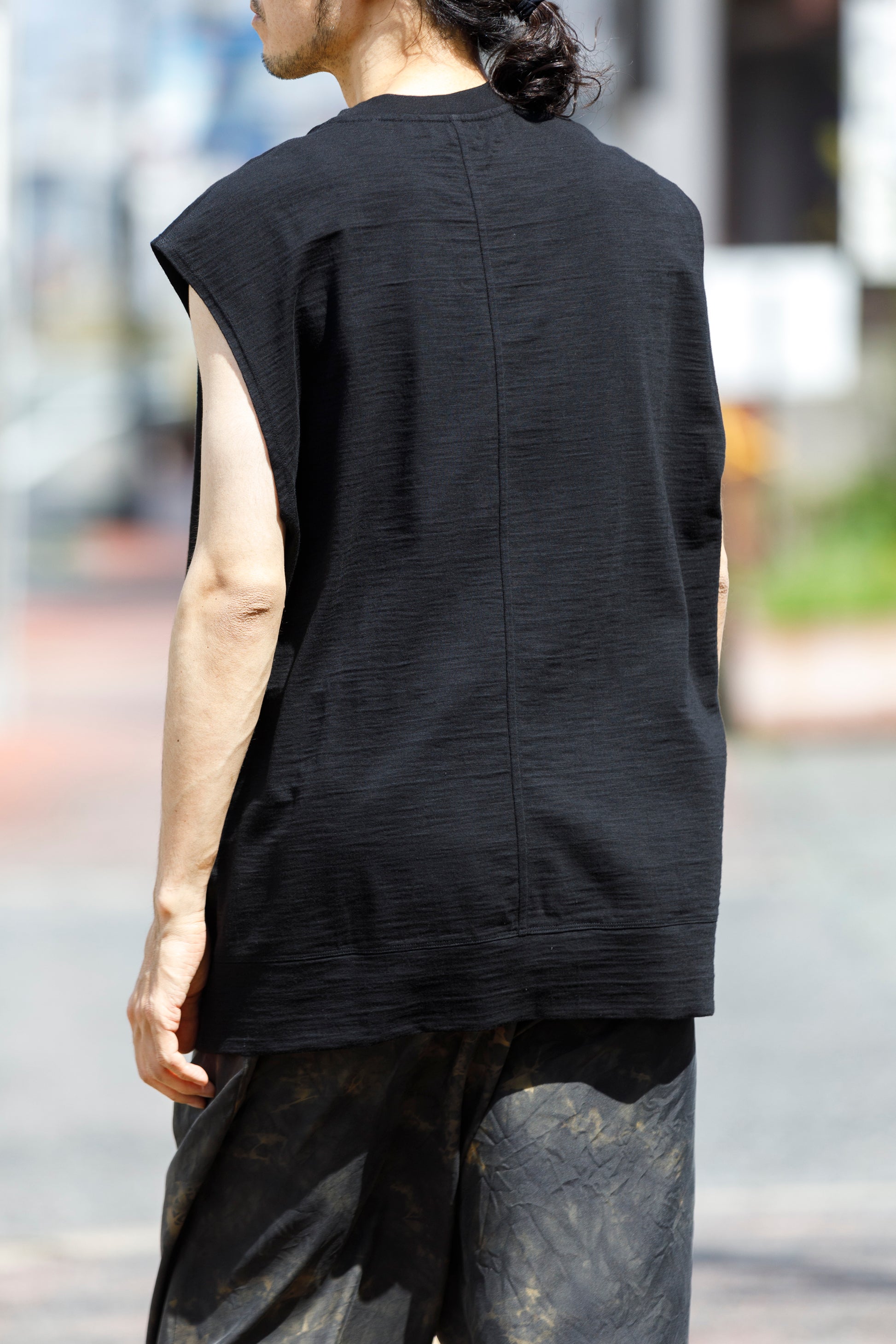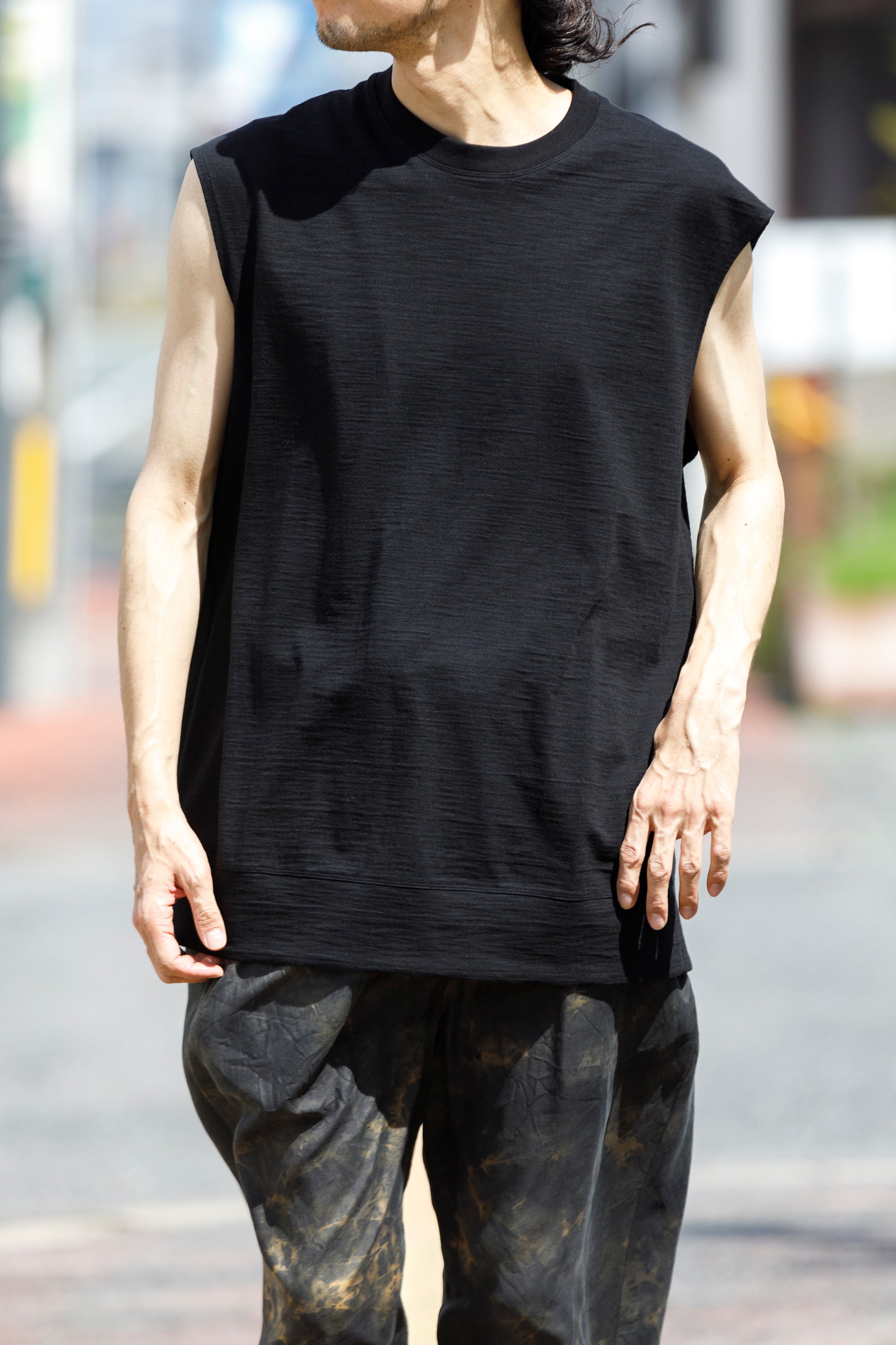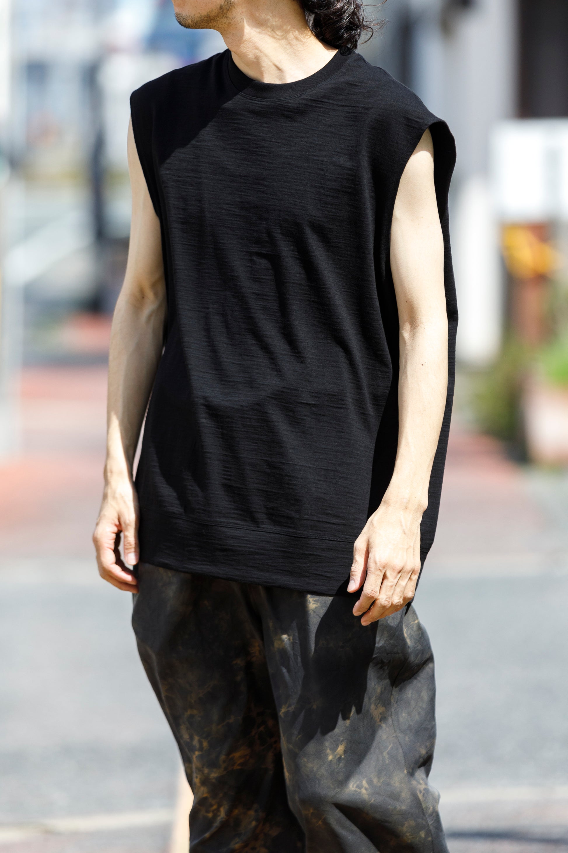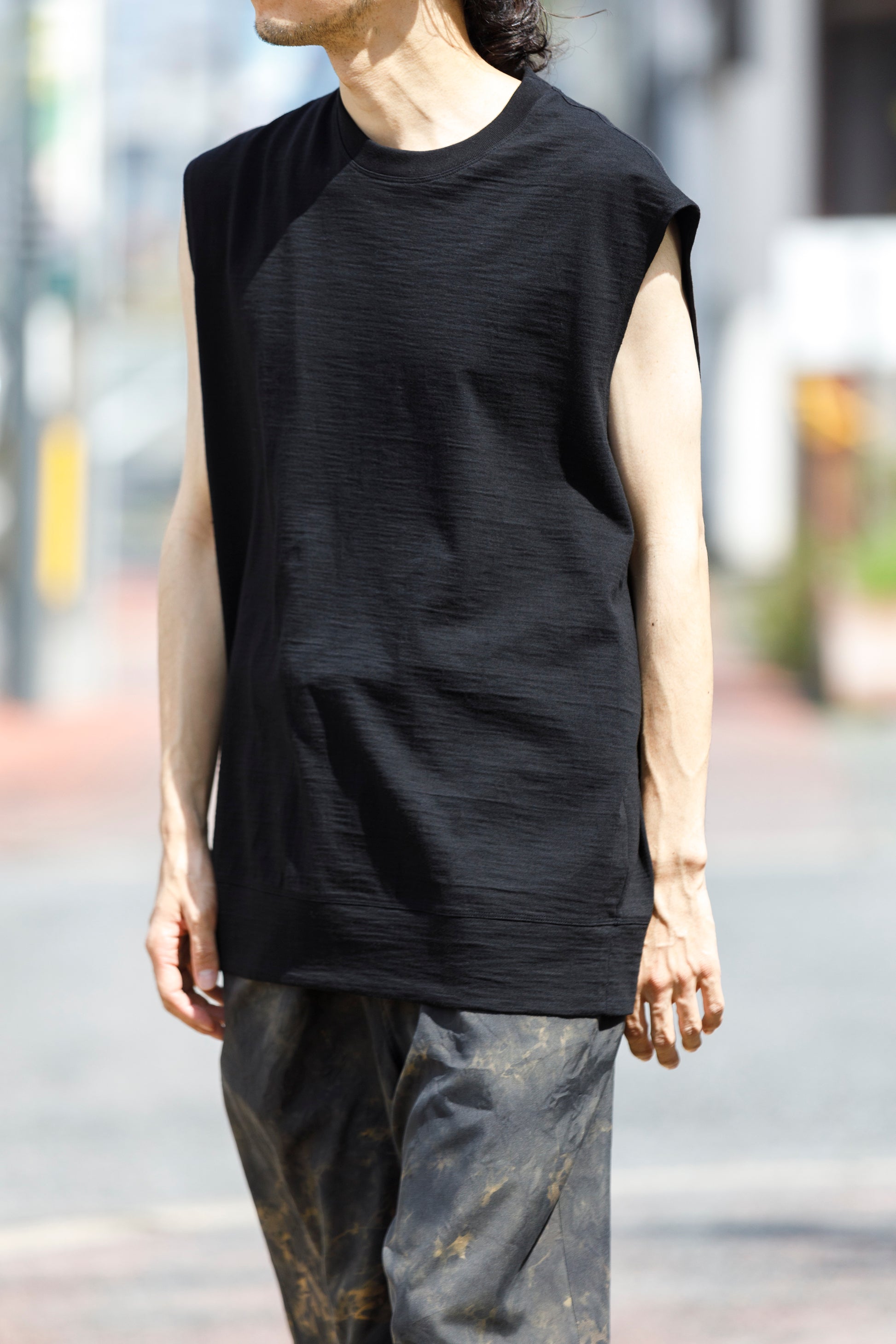 その生地で製作されたノースリーブシャツ品番、The Edge - Black。
