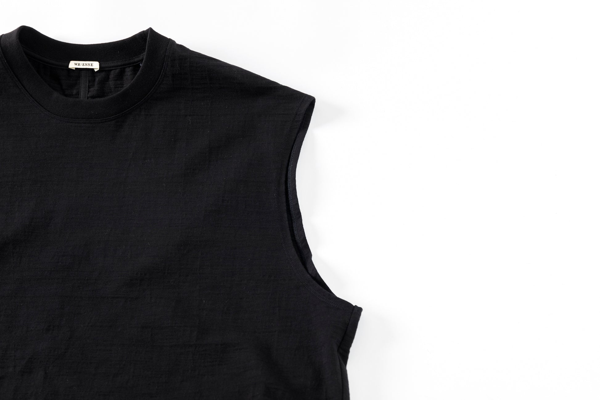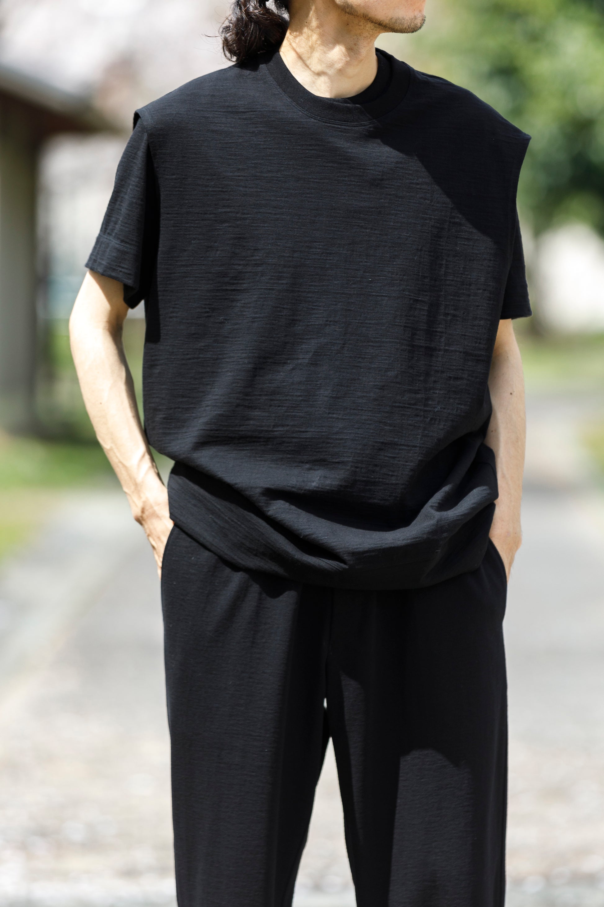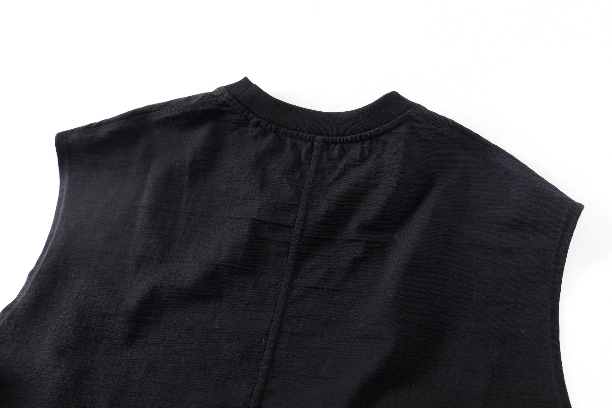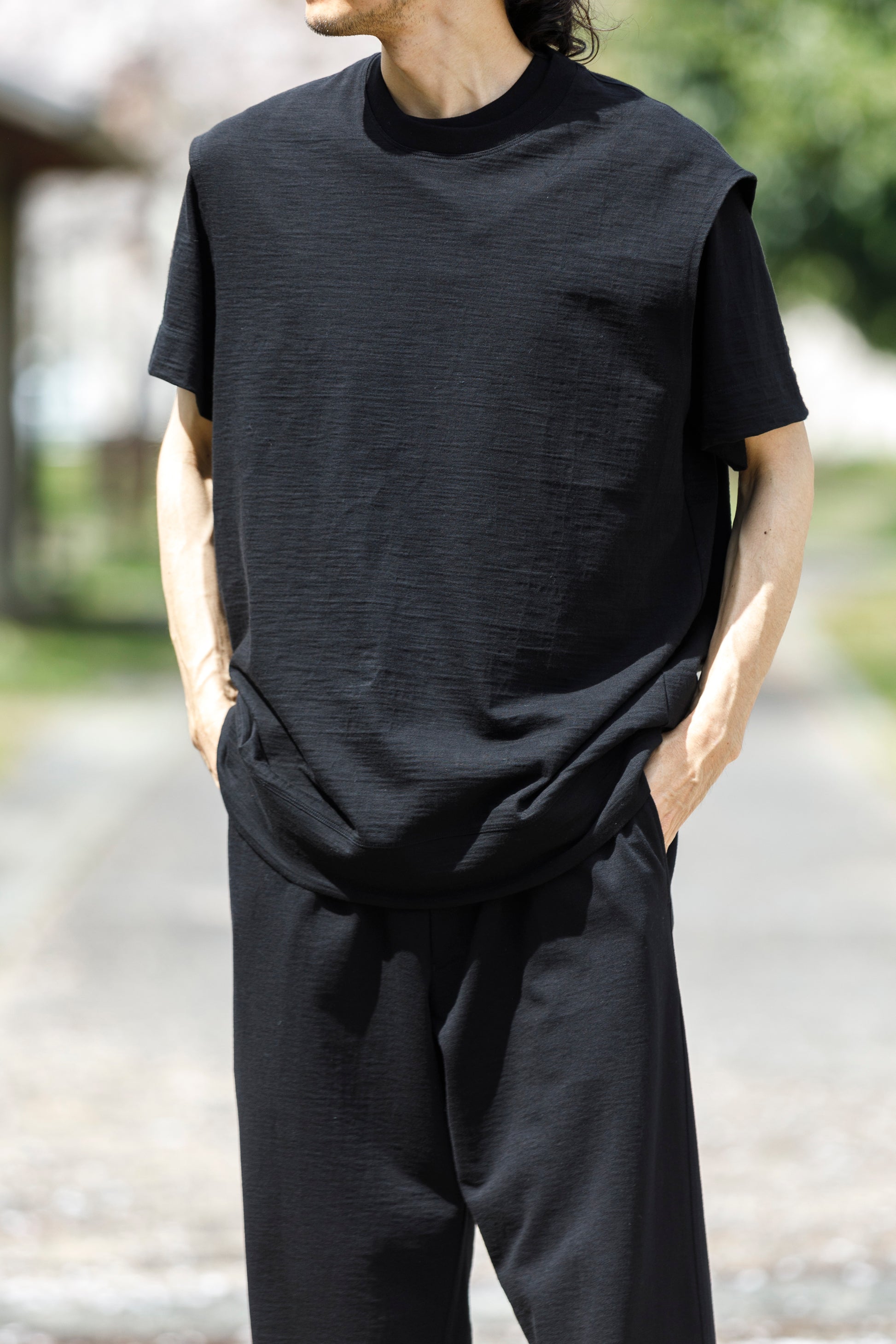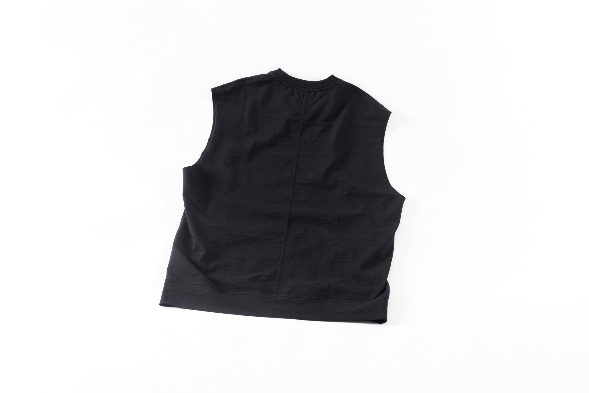 その生地で製作されたノースリーブシャツ品番、The Edge - Black。