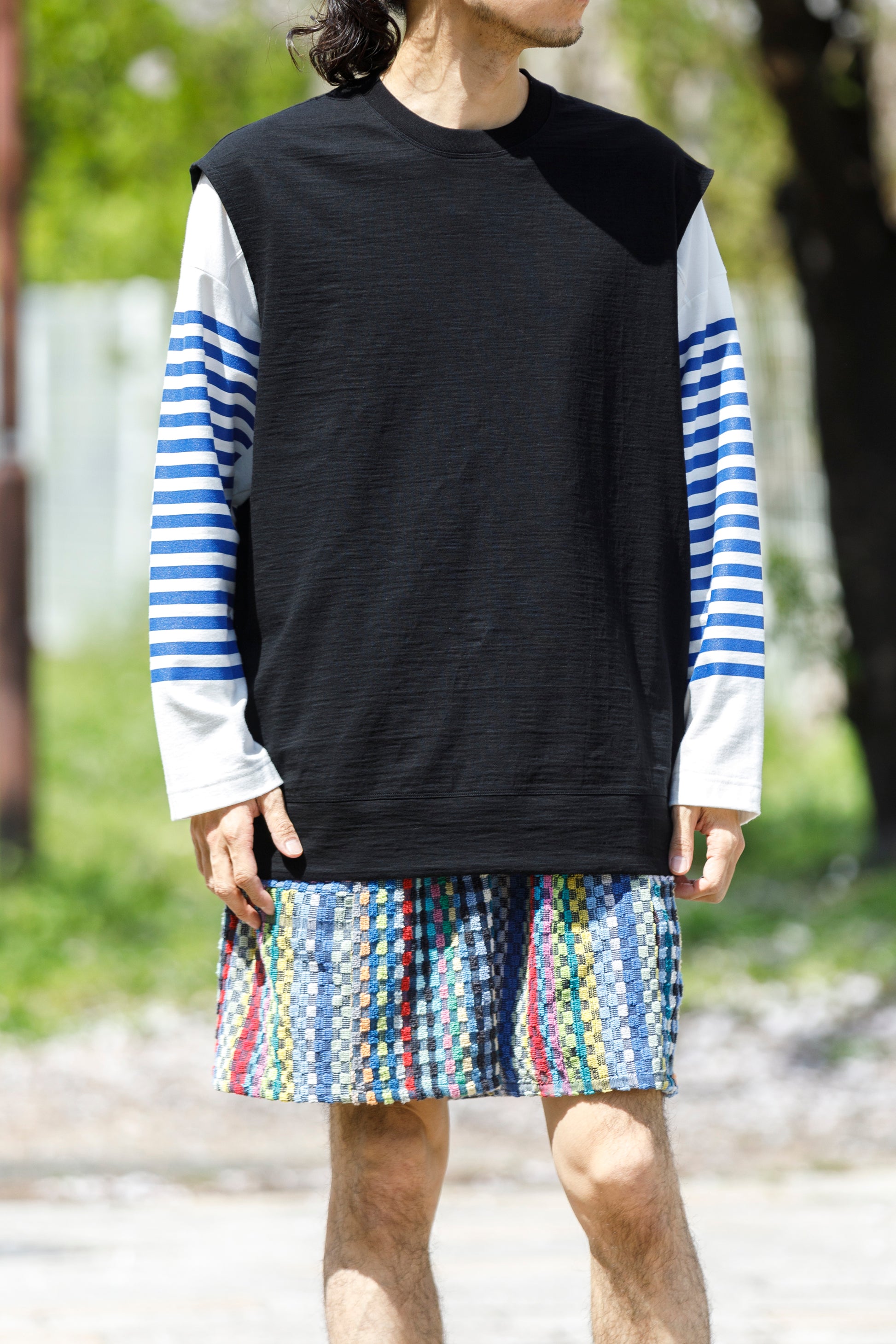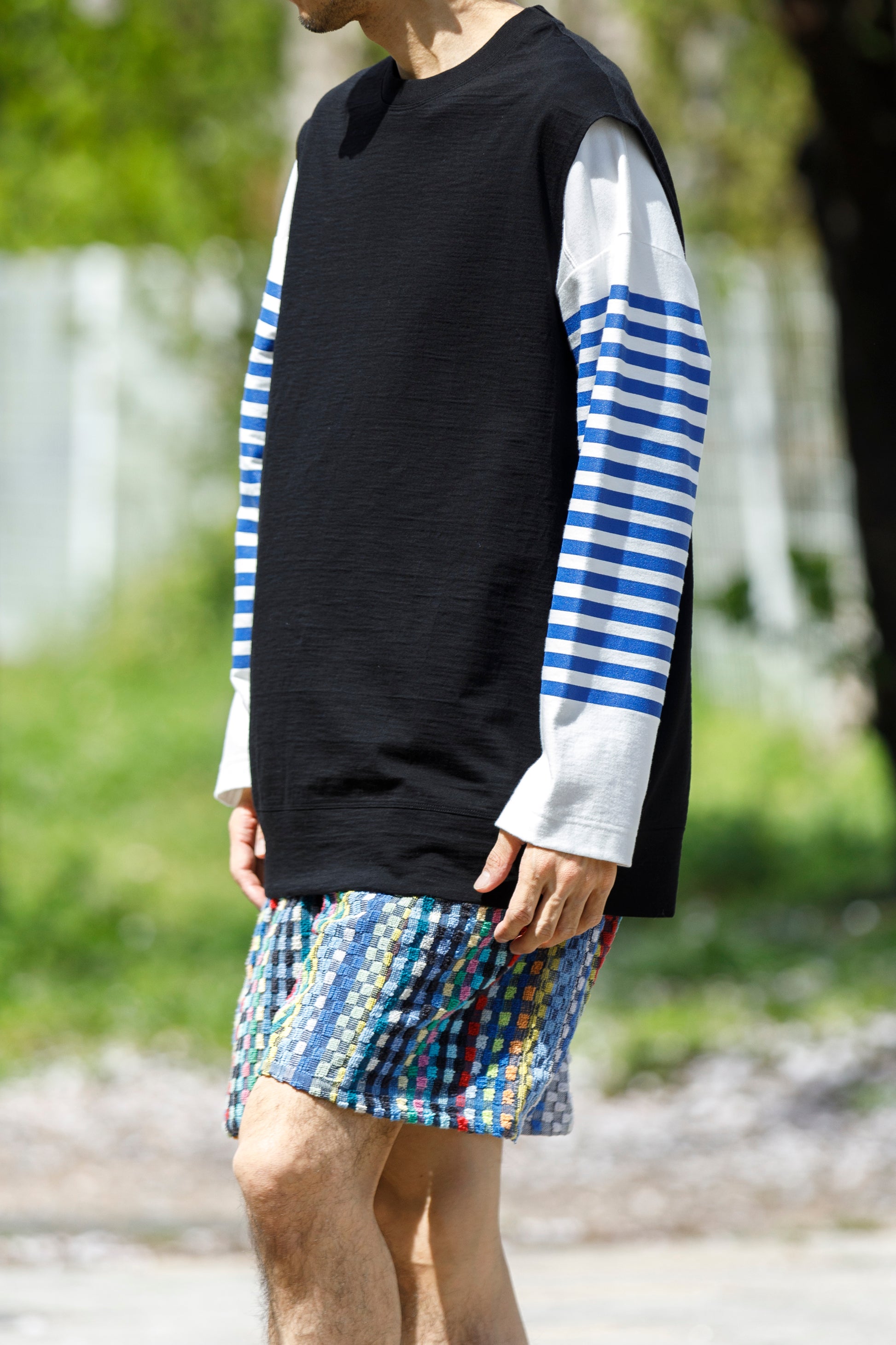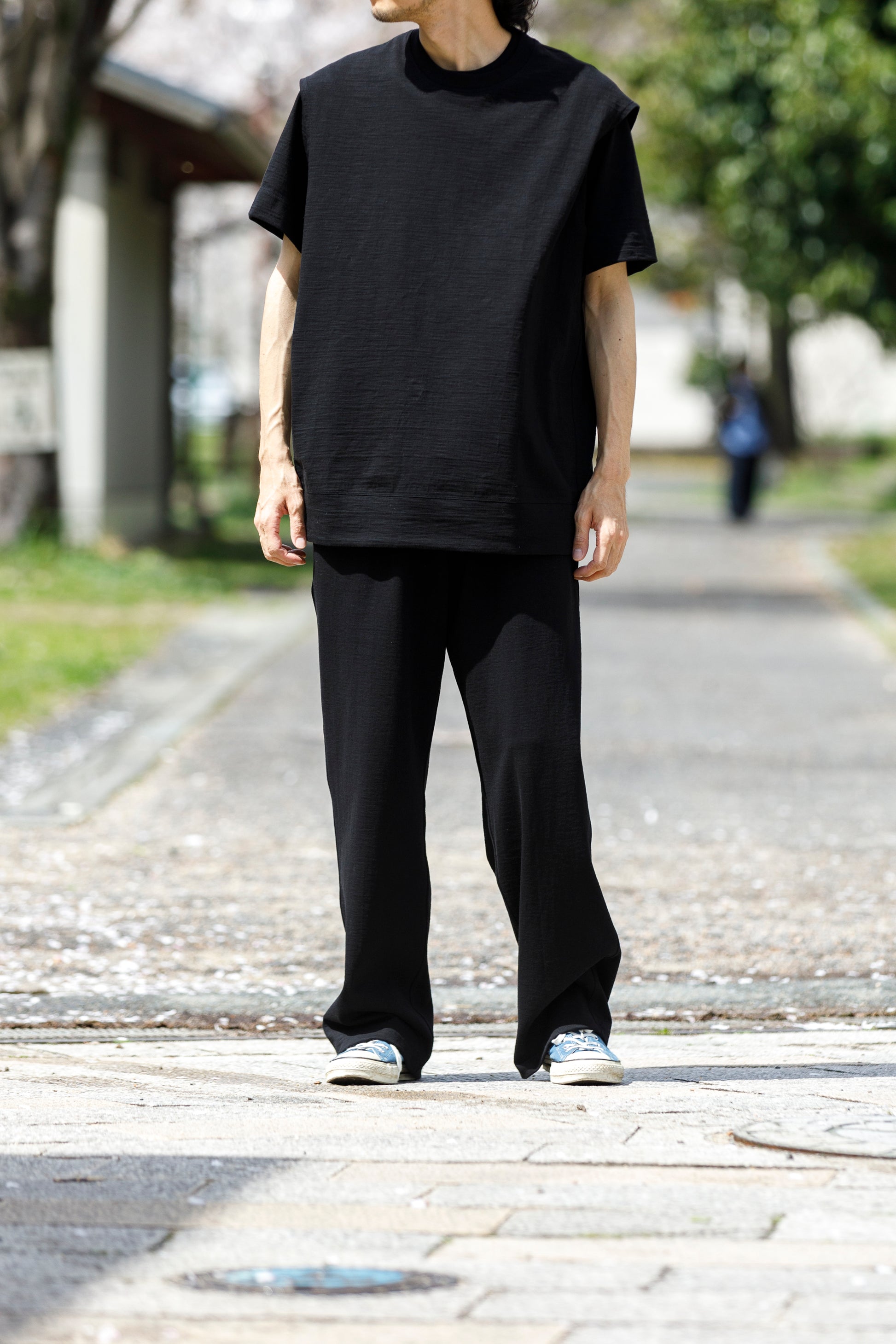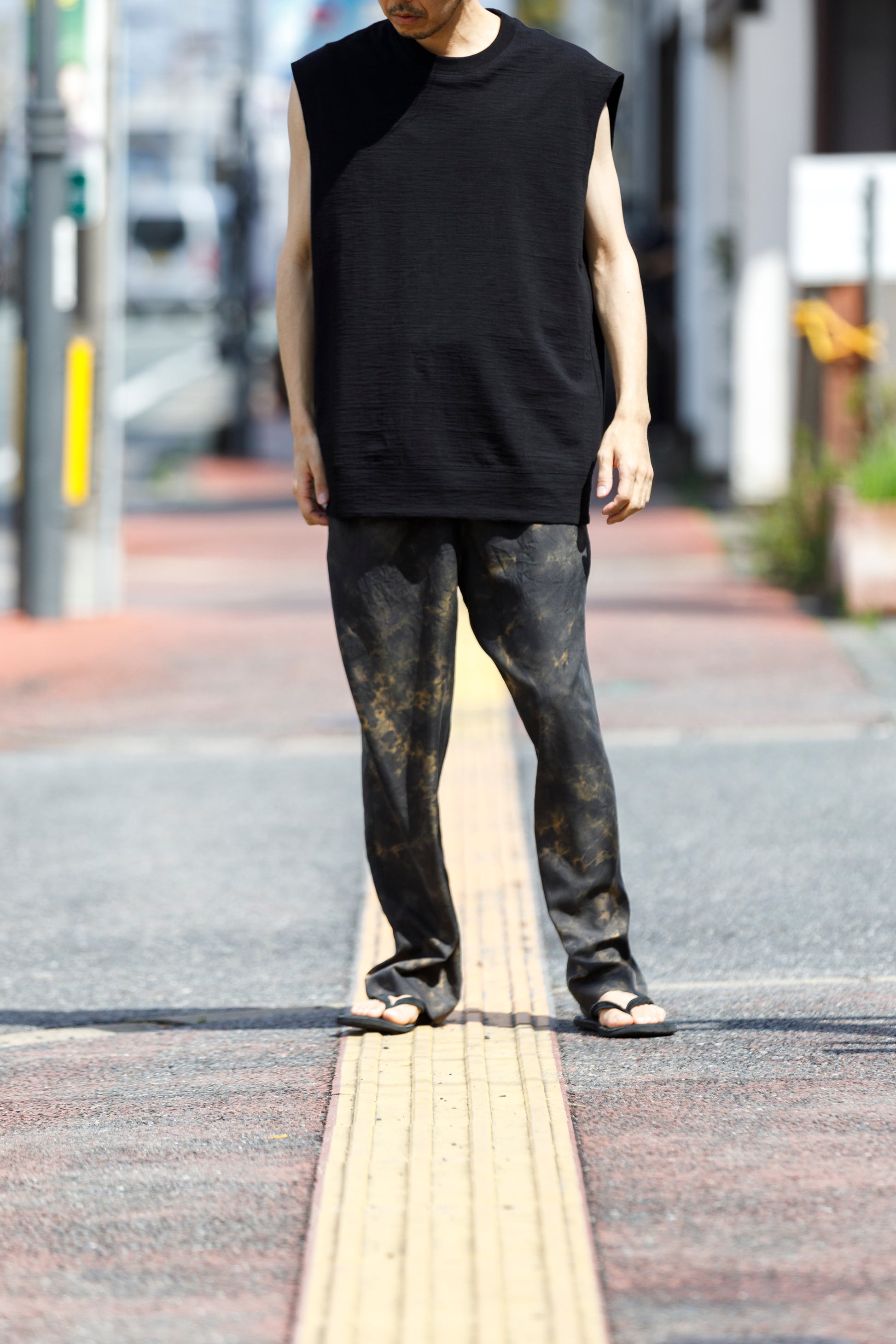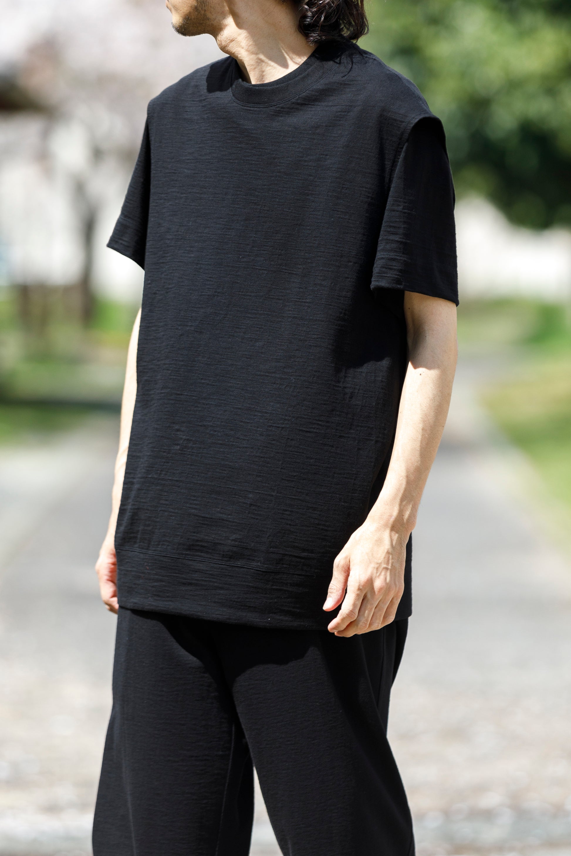 その生地で製作されたノースリーブシャツ品番、The Edge - Black。
