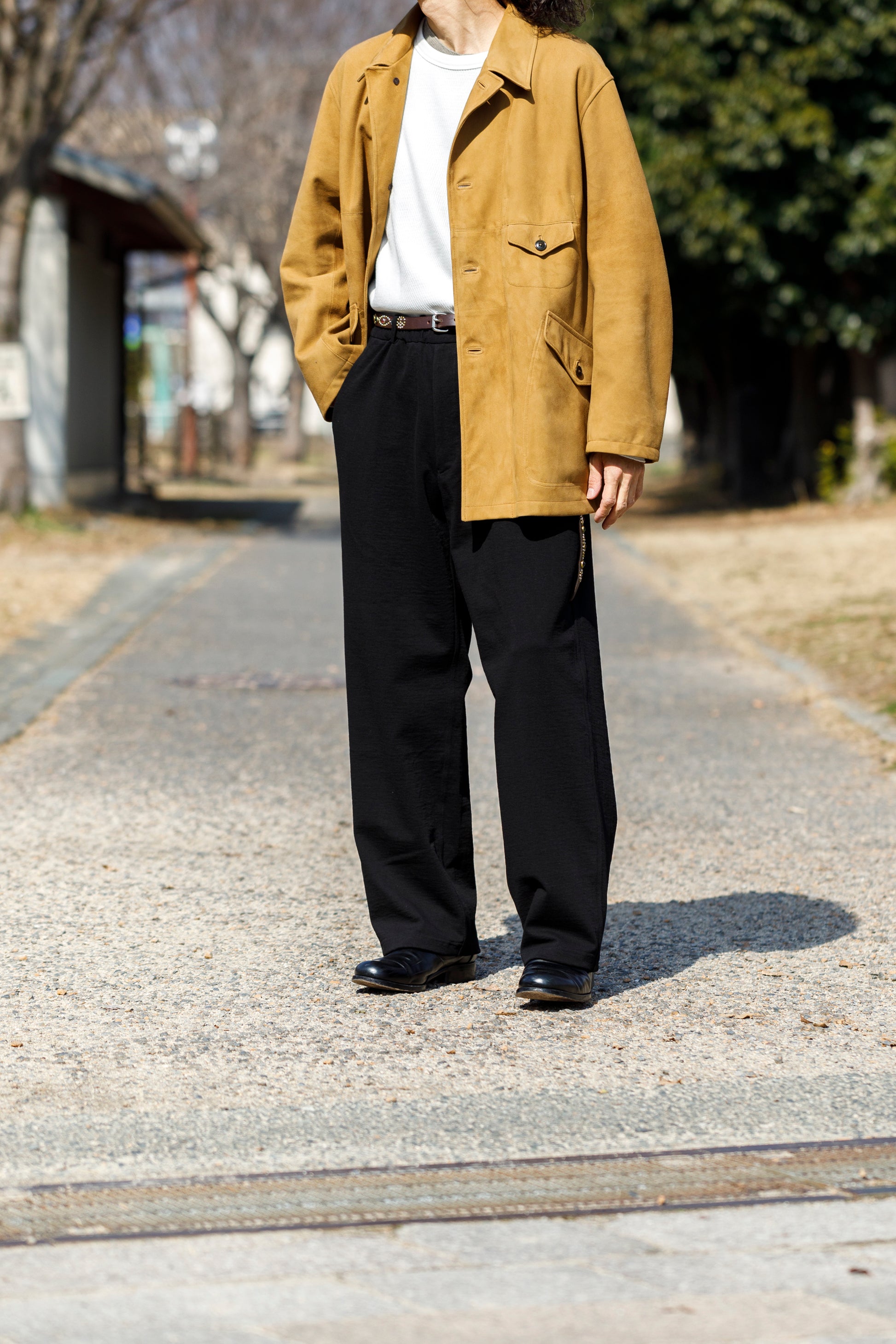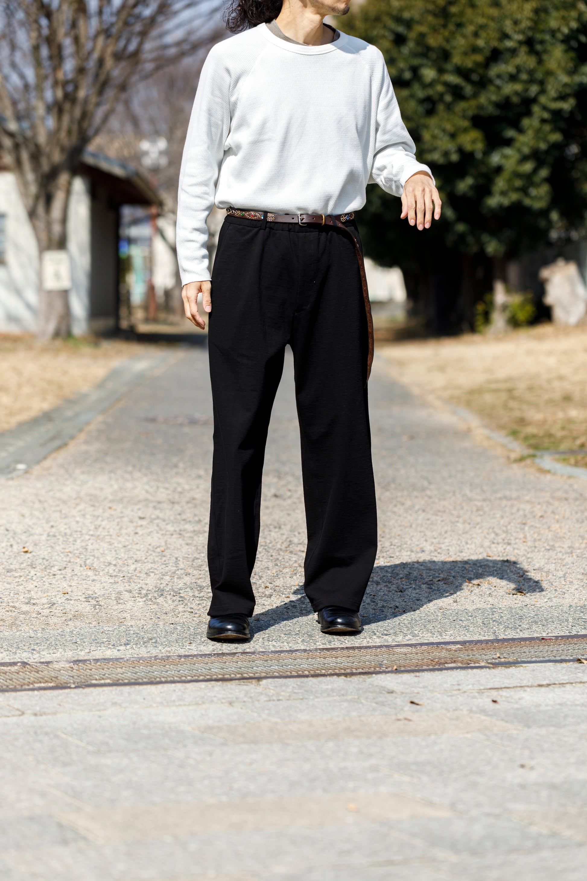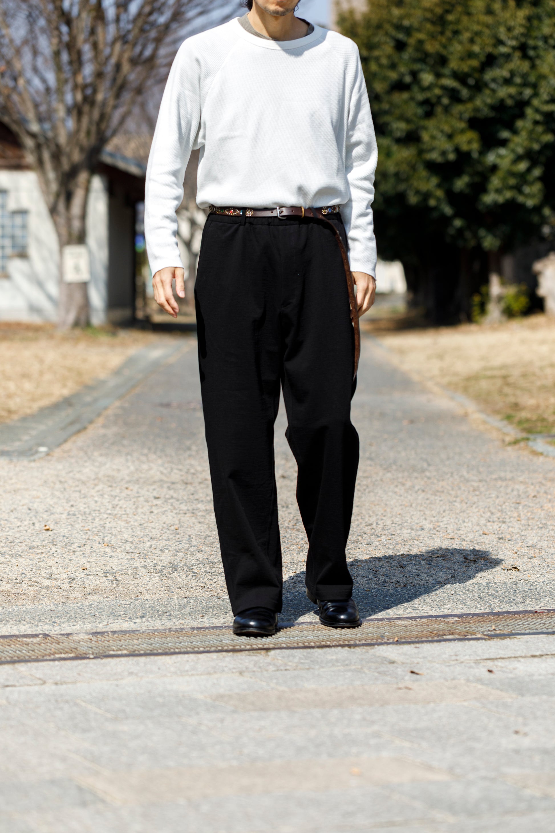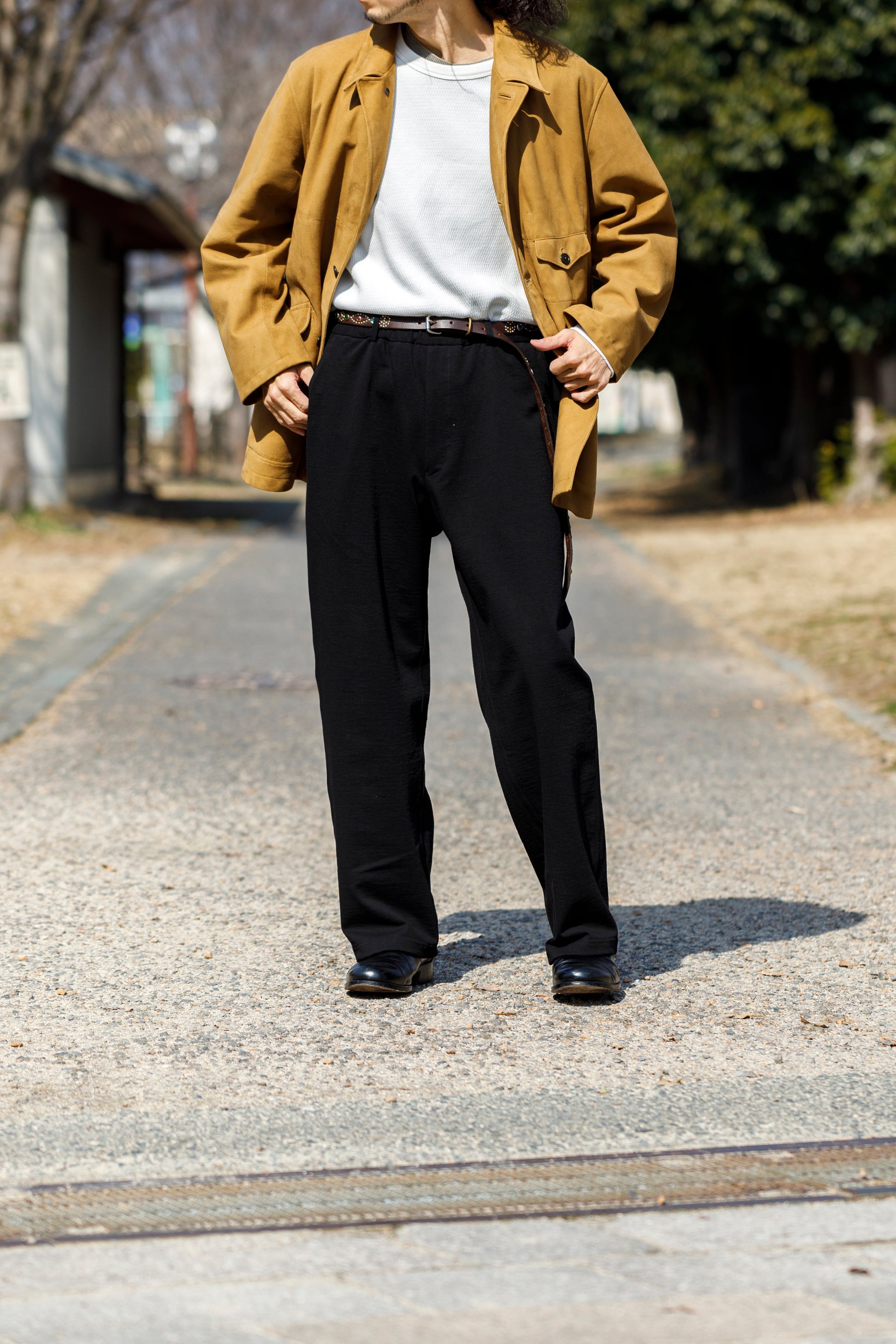 ベルトを付け、革靴を履いても上品に馴染みながら極めて快適な着用を備えた1本です。