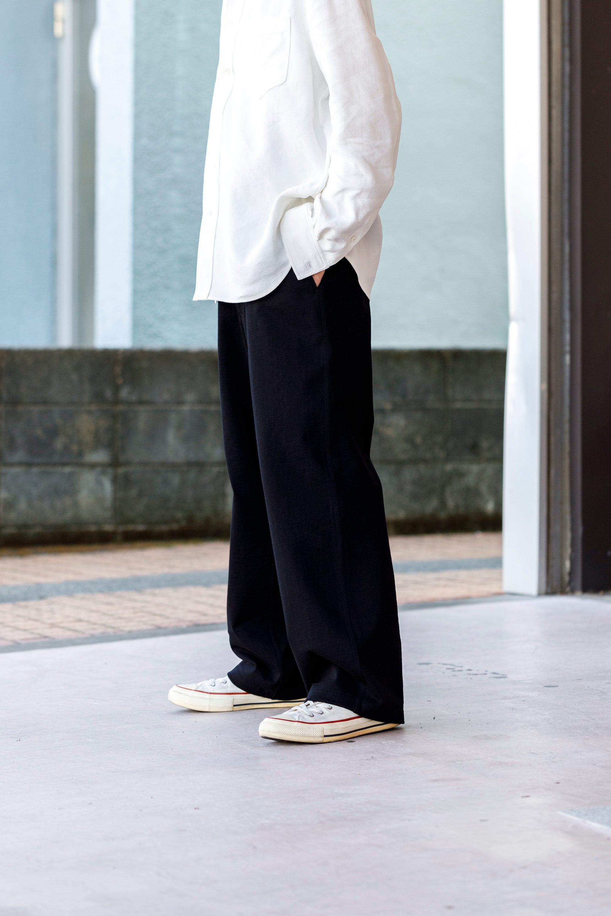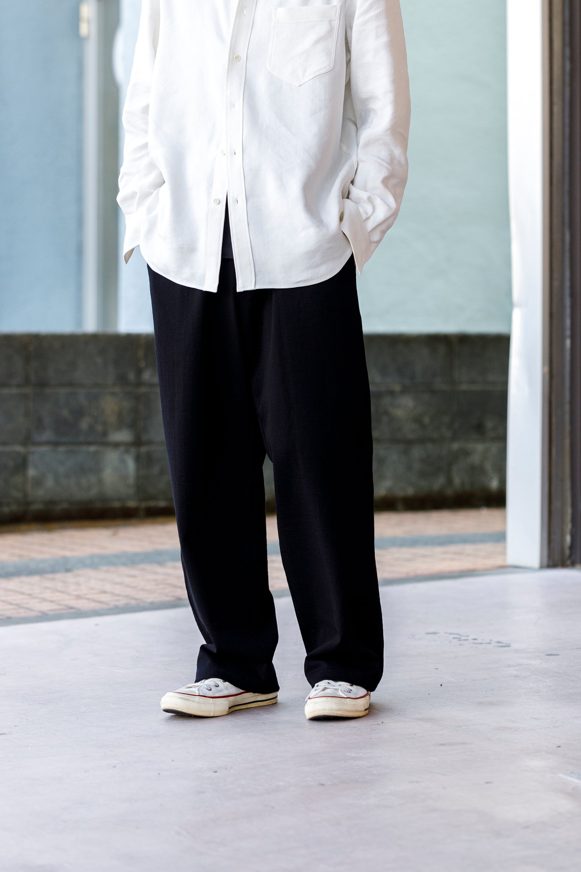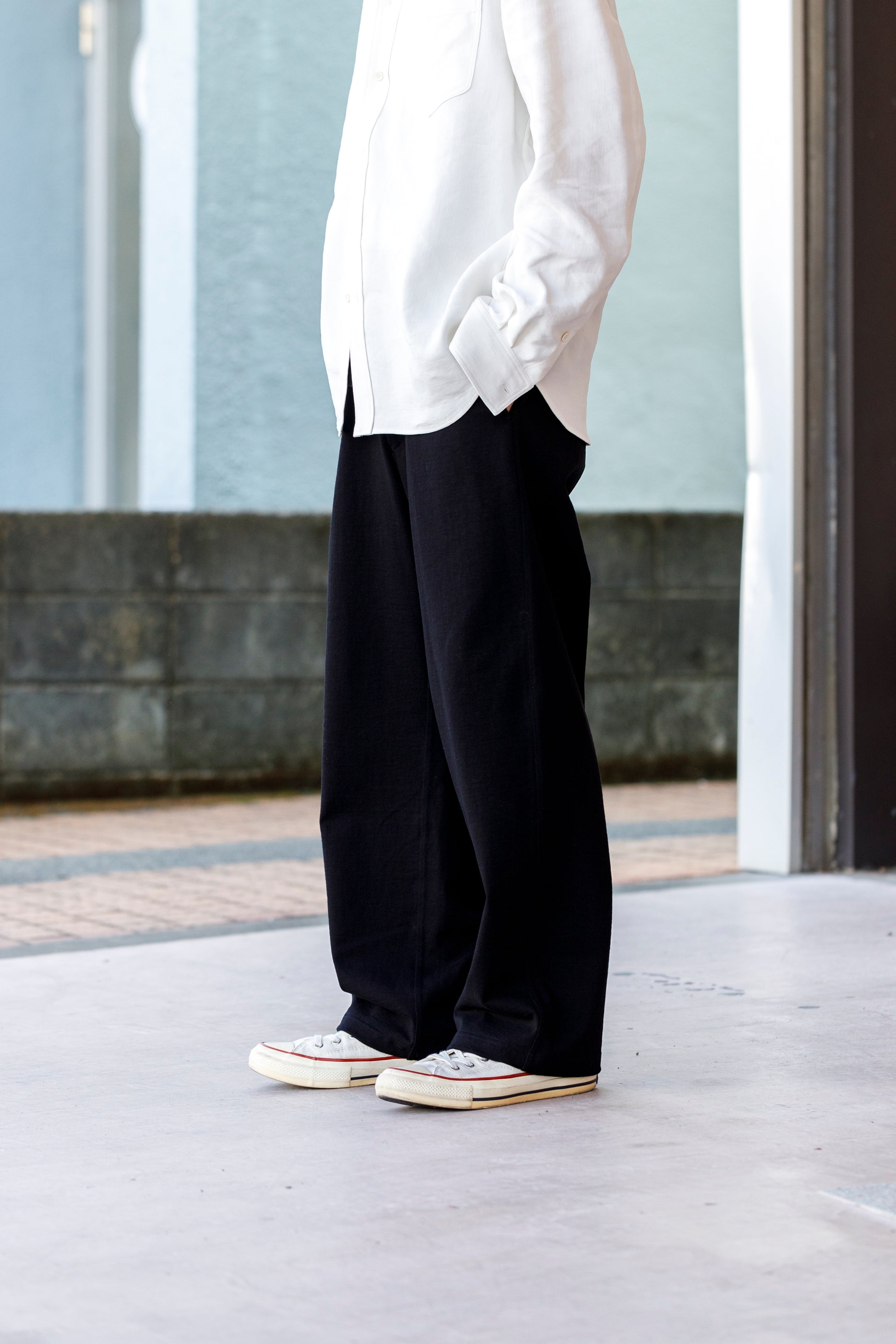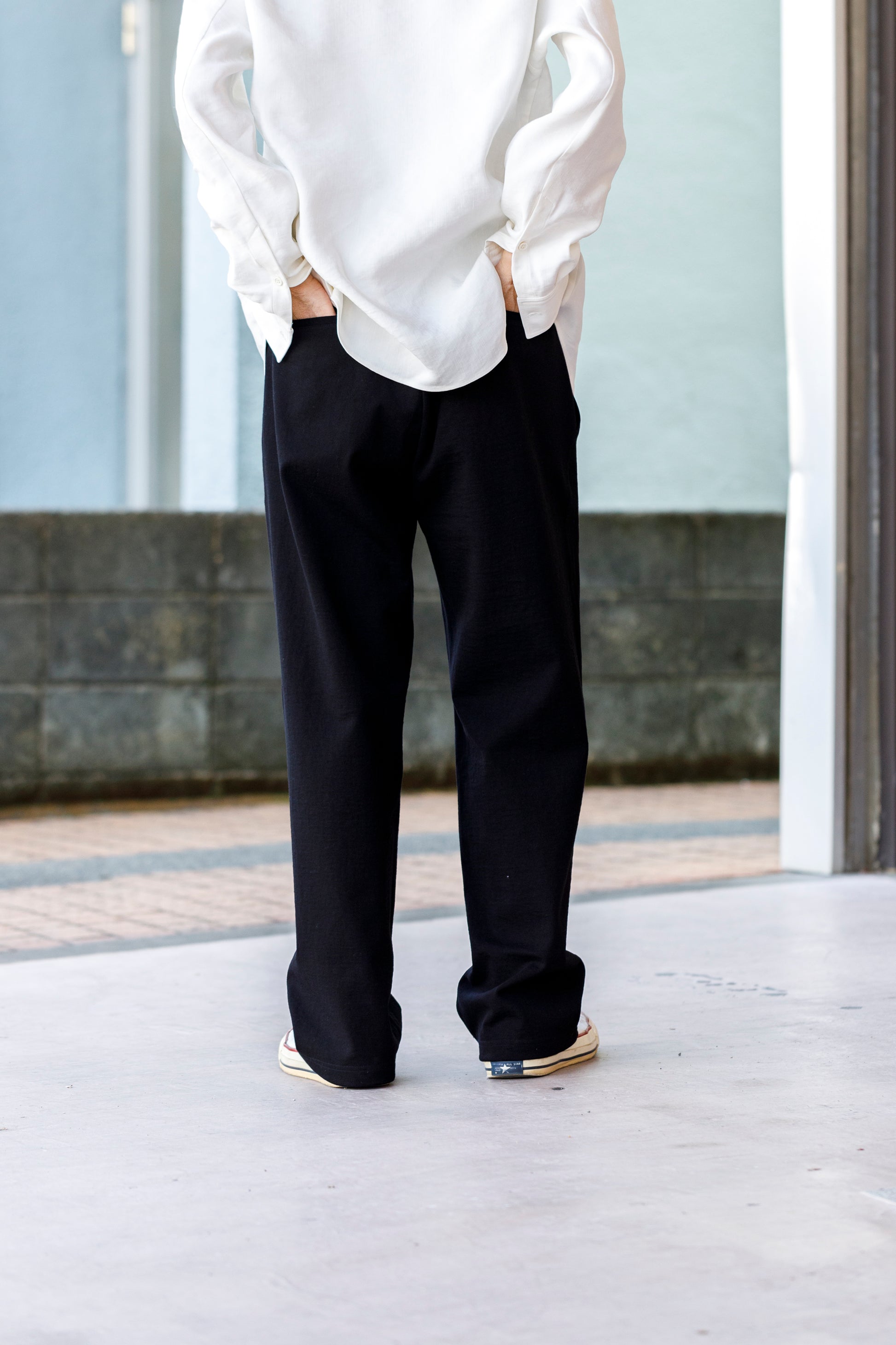 ベルトを付け、革靴を履いても上品に馴染みながら極めて快適な着用を備えた1本です。