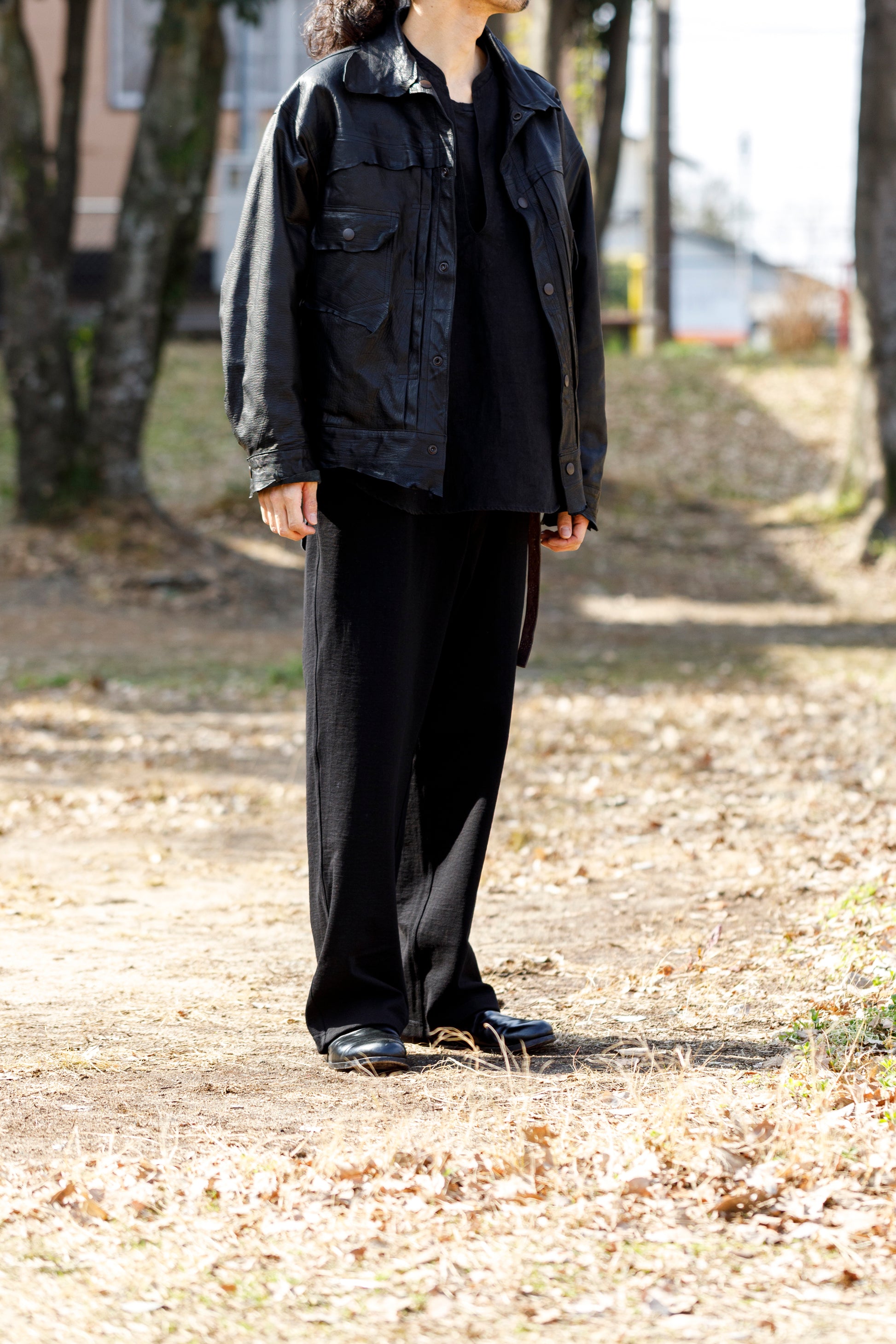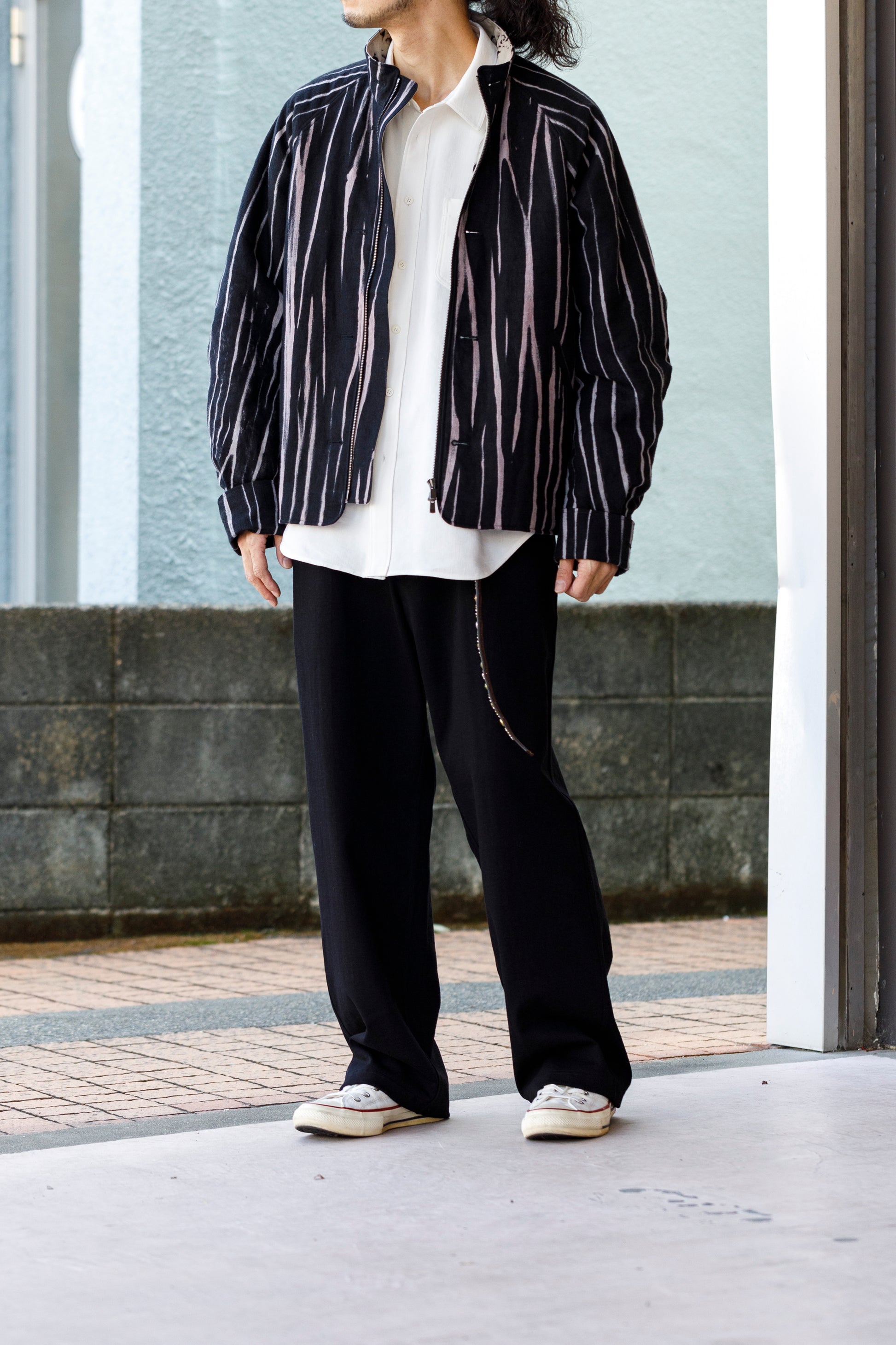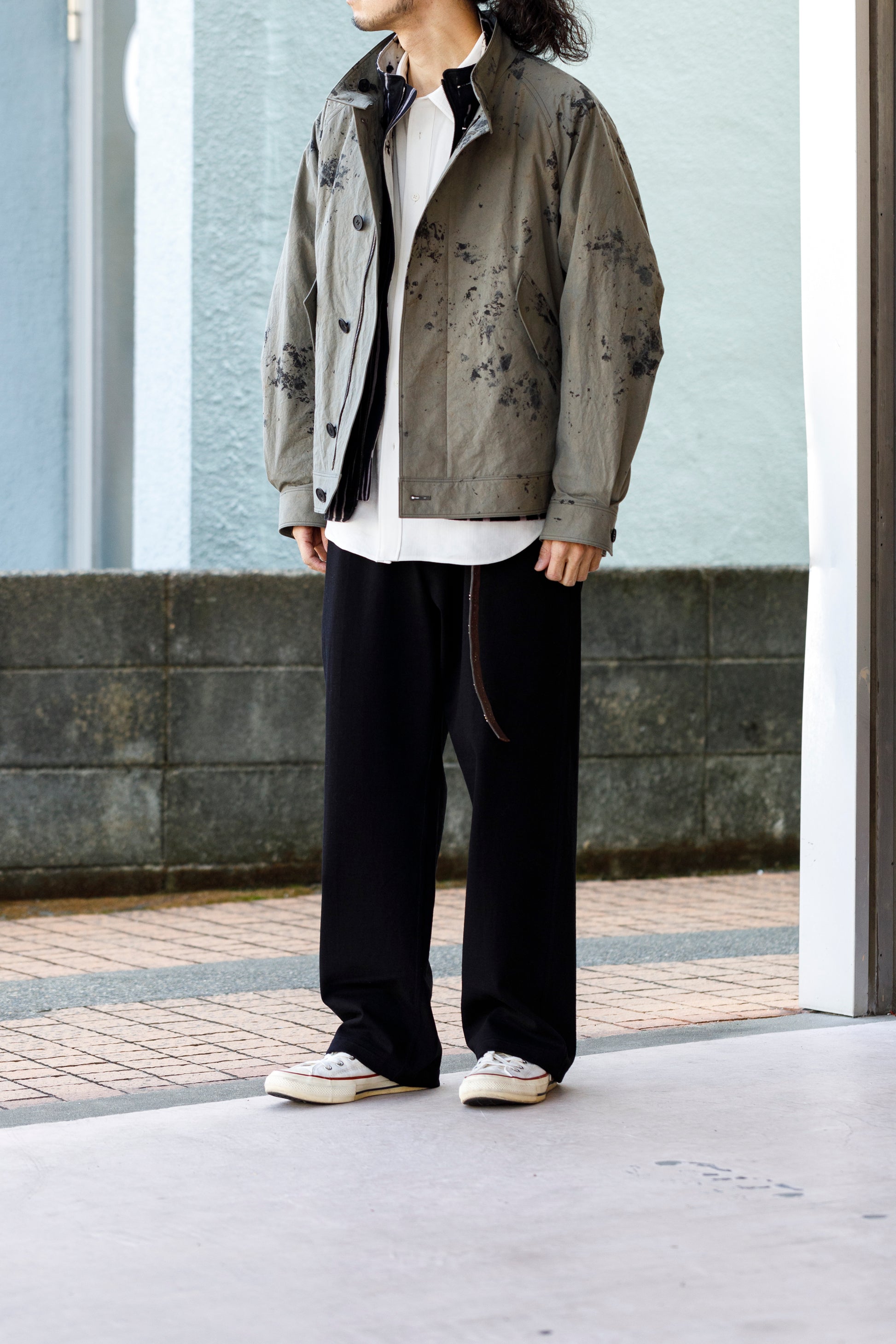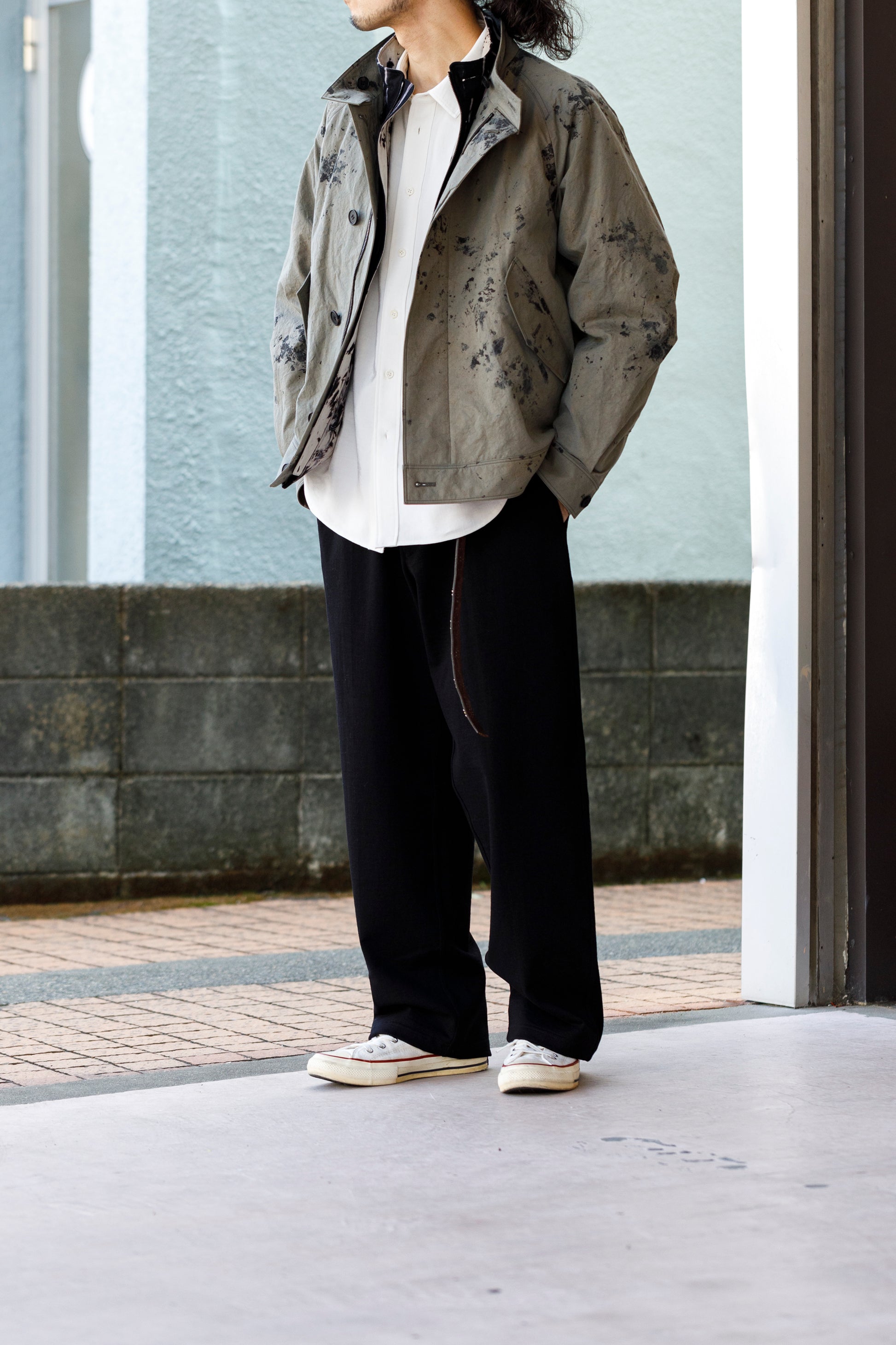 両サイドとバックにスラッシュポケットを配し、ベルトループと前立てはファスナーの仕様となります。