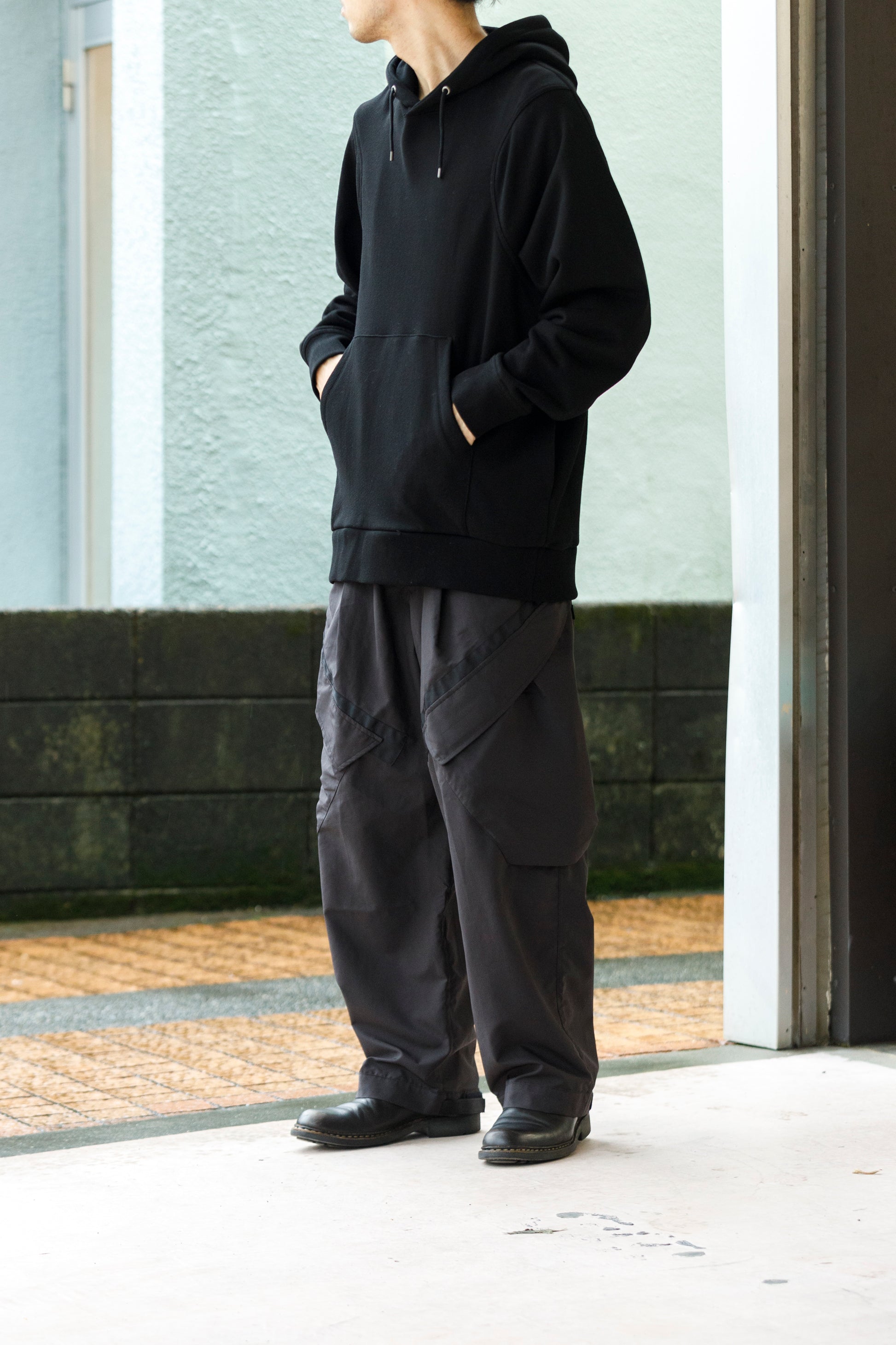 その生地を使用し製作された、WEG-001 "EGG" Double pocket hoodie - Black。